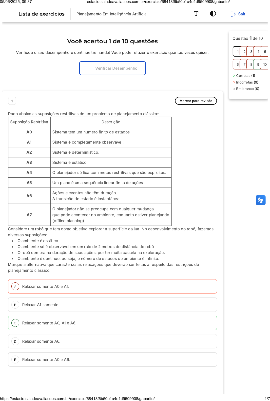 Você acertou 1 de 10 questões Verifique o seu desempenho e continue treinando! Você pode refazer o exercício quantas vezes quiser. Verificar Desempenho A B C D E 1 Marcar para revisão Dado abaixo as suposições restritivas de um problema de planejamento clássico: Suposição Restritiva Descrição A0 Sistema tem um número finito de estados A1 Sistema é completamente observável. A2 Sistema é determinístico. A3 Sistema é estático A4 O planejador só lida com metas restritivas que são explícitas. A5 Um plano é uma sequência linear finita de ações A6 Ações e eventos não têm duração. A transição de estado é instantânea. A7 O planejador não se preocupa com qualquer mudança que pode acontecer no ambiente, enquanto estiver planejando (offline planning) Considere um robô que tem como objetivo explorar a superfície da lua. No desenvolvimento do robô, fazemos diversas suposições: O ambiente é estático O ambiente só é observável em um raio de 2 metros de distância do robô O robô demora na duração de suas ações, por ter muita cautela na exploração. O ambiente é contínuo, ou seja, o número de estados do ambiente é infinito. Marque a alternativa que caracteriza as relaxações que deverão ser feitas a respeito das restrições do planejamento clássico: Relaxar somente A0 e A1. Relaxar A1 somente. Relaxar somente A0, A1 e A6. Relaxar somente A6. Relaxar somente A0 e A6. Questão 1 de 10 Corretas (1) Incorretas (9) Em branco (0) 1 2 3 4 5 6 7 8 9 10 Lista de exercícios Planejamento Em Inteligência Artificial Sair 05/06/2025, 09:37 estacio.saladeavaliacoes.com.br/exercicio/68418f6b50e1a4e1d9509908/gabarito/ https://estacio.saladeavaliacoes.com.br/exercicio/68418f6b50e1a4e1d9509908/gabarito/ 1/7 A B C D E A B Resposta incorreta Opa! A alternativa correta é a letra C. Confira o gabarito comentado! Gabarito Comentado Para entender a resposta correta, é importante analisar as suposições feitas no desenvolvimento do robô. O ambiente é estático, o que está de acordo com a suposição restritiva A3, portanto, não é necessário relaxar essa suposição. No entanto, o ambiente só é observável em um raio de 2 metros de distância do robô, o que contradiz a suposição restritiva A1 que afirma que o sistema é completamente observável. Portanto, é necessário relaxar a suposição A1. Além disso, o robô demora na duração de suas ações, o que contradiz a suposição restritiva A6 que afirma que as ações e eventos não têm duração. Portanto, é necessário relaxar a suposição A6. Por fim, o ambiente é contínuo, o que contradiz a suposição restritiva A0 que afirma que o sistema tem um número finito de estados. Portanto, é necessário relaxar a suposição A0. Portanto, as suposições que precisam ser relaxadas são A0, A1 e A6. 2 Marcar para revisão Diante da complexidade dos ambientes reais, o planejamento de agentes inteligentes pode requerer a flexibilizaç A2 (determinismo) se torna necessária Quando o número de estados do sistema é finito e conhecido Quando não é possível prever com exatidão o resultado de uma ação específica Quando os objetivos do agente são explicitamente definidos e imutáveis Quando todas as ações do agente têm duração nula e ocorrem instantaneamente Quando o ambiente permanece inalterado durante o processo de planejamento Resposta incorreta Opa! A alternativa correta é a letra B. Confira o gabarito comentado! Gabarito Comentado A suposição A2 considera que o sistema é determinístico. Quando relaxamos essa suposição, aceitamos que as ações do agente podem ter múltiplos 3 Marcar para revisão A arquitetura de um agente racional envolve a integração de diversos elementos que viabilizam sua atuação deli O conjunto de câmeras e sensores que captam as imagens utilizadas para tomada de decisão do agent A matriz de avaliação de desempenho que determina a eficácia das ações do agente 05/06/2025, 09:37 estacio.saladeavaliacoes.com.br/exercicio/68418f6b50e1a4e1d9509908/gabarito/ https://estacio.saladeavaliacoes.com.br/exercicio/68418f6b50e1a4e1d9509908/gabarito/ 2/7 C D E A B C D E A lista de metas intermediárias que norteiam a formulação do plano do agente O sistema de exibição de comandos que permite ao agente interagir fisicamente com o ambiente O conjunto de restrições ambientais que definem o comportamento permitido no ambiente Resposta incorreta Opa! A alternativa correta é a letra D. Confira o gabarito comentado! Gabarito Comentado Atuadores são os componentes responsáveis por permitir que o agente execute ações no ambiente. Eles estão diretamente associados à 4 Marcar para revisão Utilizando Prolog em um sistema de agendamento automático, um desenvolvedor programa um agente para resolver conflitos de horário entre várias tarefas designadas. O agente aplica lógica de predicados para garantir que não haja sobreposições, maximizando assim a eficiência do calendário. Que elemento da programação em Prolog é fundamental para este tipo de aplicação? Funções de alta ordem. Recursão. Estruturas de repetição. Operadores lógicos. Gerenciamento de exceções. Resposta incorreta Opa! A alternativa correta é a letra D. Confira o gabarito comentado! Gabarito Comentado Os operadores lógicos em Prolog são essenciais para manipular e avaliar as condições e restrições no agendamento de tarefas, permitindo ao agente resolver conflitos e otimizar a alocação de recursos de forma lógica e eficiente. 5 Marcar para revisão O modelo restritivo que definimos assume 8 tipos de restrições. Essas restrições podem ser relaxadas quando quisermos desenvolver determinados tipos de agentes inteligentes. Marque a alternativa verdadeira a respeito de um robô limpador que foi desenvolvido para funcionar em uma gama variada de casas, de ambientes, sem nenhum tipo de intervenção humana: 05/06/2025, 09:37 estacio.saladeavaliacoes.com.br/exercicio/68418f