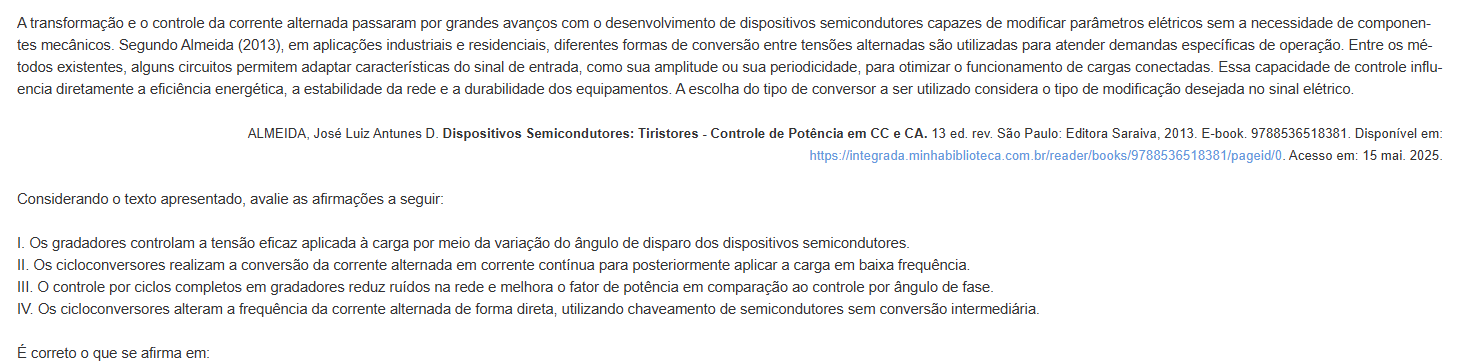 A transformação e controle da corrente alternada passaram por grandes avanços com o desenvolvimento de dispositivos semicondutores capazes de modificar parâmetros elétricos sem a necessidade de componen- tes Segundo Almeida (2013), em aplicações industriais e residenciais, diferentes formas de conversão entre tensões alternadas são utilizadas para atender demandas específicas de operação. Entre os mé- todos existentes, alguns circuitos permitem adaptar características do sinal de entrada, como sua amplitude ou sua periodicidade, para otimizar funcionamento de cargas conectadas. Essa capacidade de controle influ- encia diretamente a eficiência energética, a estabilidade da rede e a durabilidade dos equipamentos. A escolha do tipo de conversor a ser utilizado considera tipo de modificação desejada no sinal elétrico. ALMEIDA, José Luiz Antunes D. Dispositivos Semicondutores: Tiristores - Controle de Potência em CC e CA. 13 ed. rev. São Paulo: Editora 2013. Disponível em: Acesso em: 15 Considerando o texto apresentado, avalie as afirmações a seguir: I. Os gradadores controlam a tensão eficaz aplicada à carga por meio da variação do ângulo de disparo dos dispositivos II. Os cicloconversores realizam a conversão da corrente alternada em corrente continua para posteriormente aplicar a carga em baixa III. controle por ciclos completos em gradadores reduz na rede e melhora fator de potência em comparação ao controle por ângulo de fase. IV. Os cicloconversores alteram a frequência da corrente alternada de forma direta, utilizando chaveamento de semicondutores sem conversão É correto o que se afirma