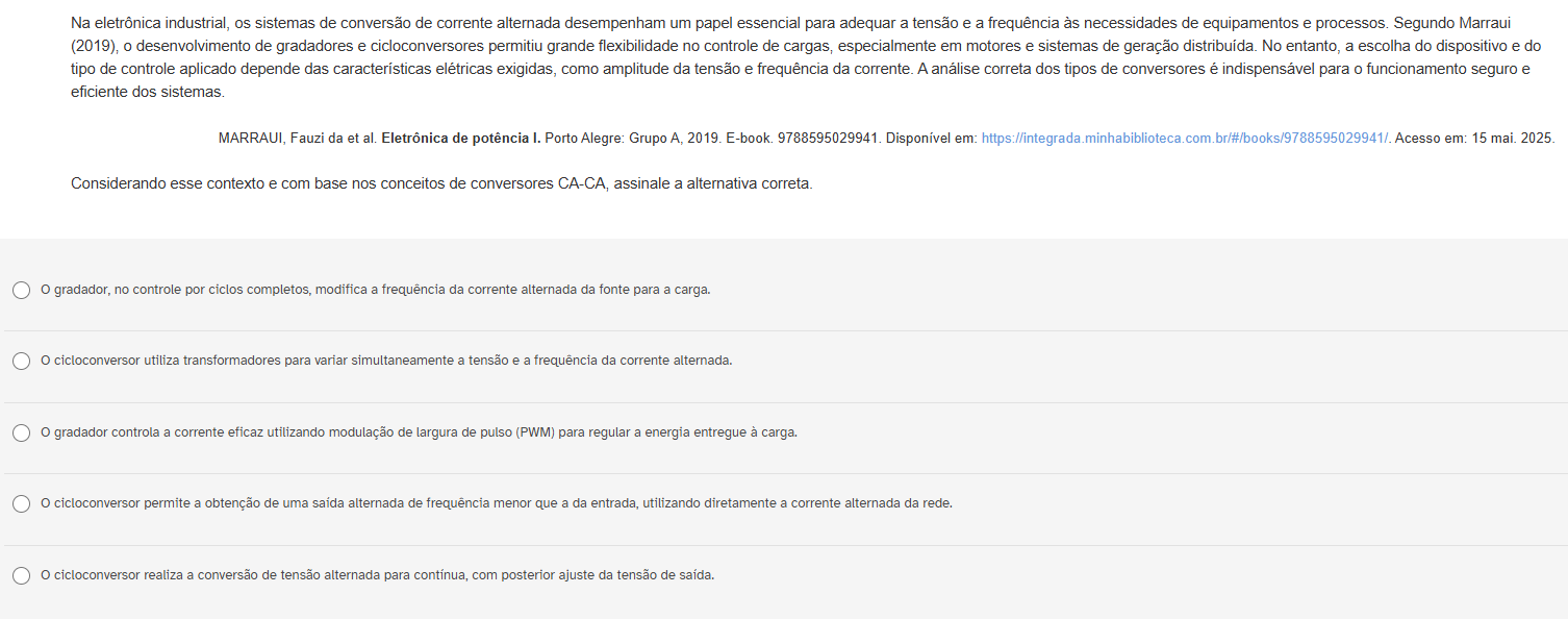 Na eletrônica industrial, os sistemas de conversão de corrente alternada desempenham um papel essencial para adequar a tensão e a frequência às necessidades de equipamentos e processos. Segundo Marraui (2019), o desenvolvimento de gradadores e cicloconversores permitiu grande flexibilidade no controle de cargas, especialmente em motores e sistemas de geração distribuída. No entanto, a escolha do dispositivo e do tipo de controle aplicado depende das características elétricas exigidas, como amplitude da tensão e frequência da corrente. A análise correta dos tipos de conversores é indispensável para funcionamento seguro e eficiente dos MARRAUI, Fauzi da et al. Eletrônica de potência I. Porto Alegre: Grupo A. E-book 9788595029941 Disponível em: Acesso em: 15 mai. 2025. Considerando esse contexto e com base nos conceitos de conversores CA-CA, assinale a alternativa correta. gradador, no controle por ciclos completos, modifica a frequência da corrente alternada da fonte para a carga. o cicloconversor utiliza transformadores para variar simultaneamente a tensão e a frequência da corrente o gradador controla a corrente eficaz utilizando modulação de largura de pulso (PWM) para regular a energia entregue à carga. o permite a obtenção de uma saída alternada de frequência menor que a da entrada, utilizando diretamente a corrente alternada da rede. o cicloconversor realiza a conversão de tensão alternada para com posterior ajuste da tensão de saída.