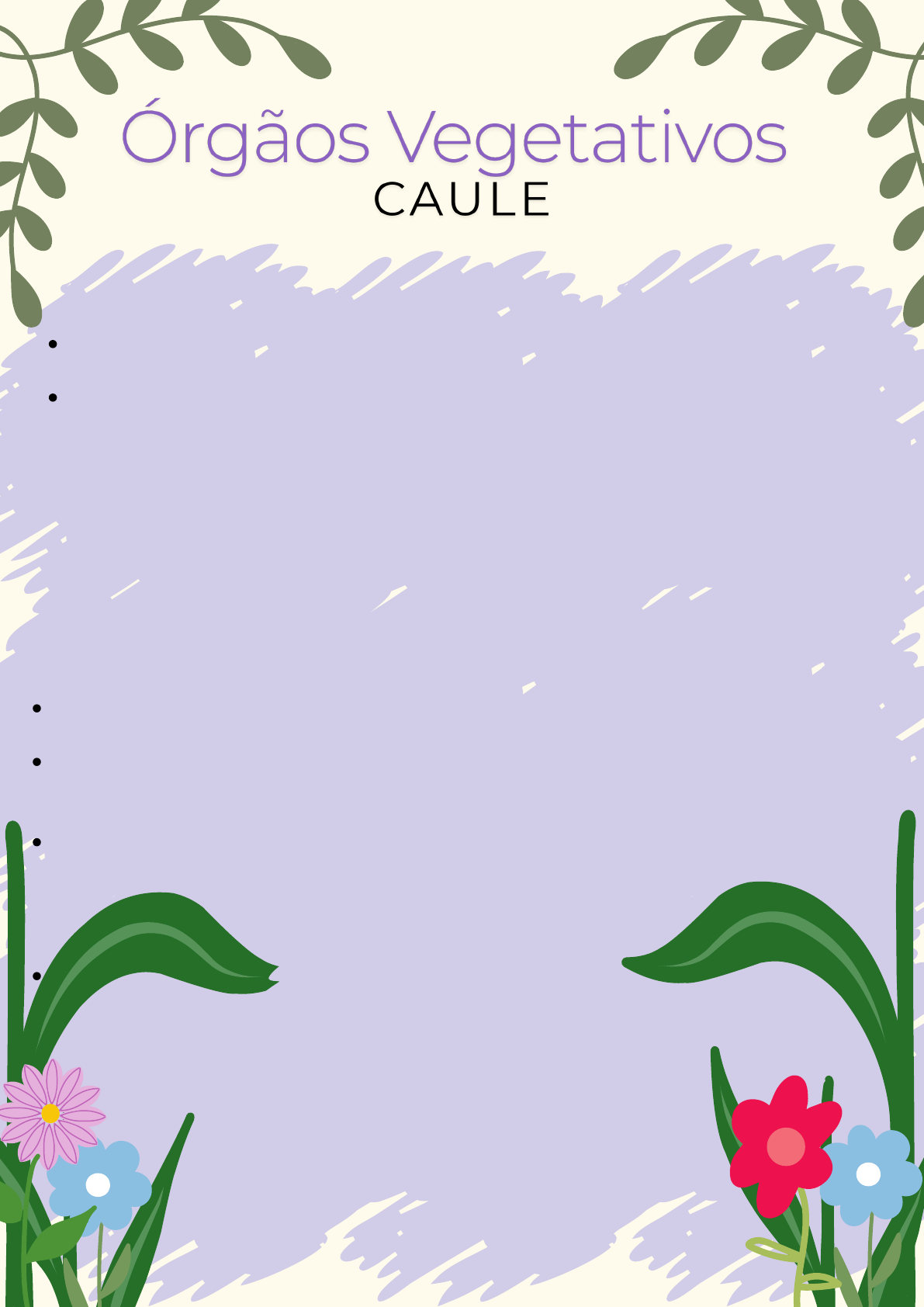 CONCEITO E FUNÇÃO O CAULE É UM DOS PRINCIPAIS ÓRGÃOS VEGETATIVOS DAS PLANTAS VASCULARES, SENDO RESPONSÁVEL PELA SUSTENTAÇÃO, CONDUÇÃO DE NUTRIENTES E ÁGUA ENTRE AS RAÍZES E AS FOLHAS, ALÉM DE PARTICIPAR NA FOTOSSÍNTESE (EM ALGUMAS PLANTAS) E NO ARMAZENAMENTO DE SUBSTÂNCIAS NUTRITIVAS. ELE SERVE DE ELO ENTRE AS RAÍZES E A PARTE AÉREA DA PLANTA. IMPORTÂNCIA DO CAULE: SUSTENTAÇÃO: SUPORTA FOLHAS, FLORES E FRUTOS, PERMITINDO A CAPTAÇÃO EFICIENTE DE LUZ SOLAR PARA A FOTOSSÍNTESE. CONDUÇÃO DE NUTRIENTES E ÁGUA: ATRAVÉS DE VASOS ESPECIALIZADOS (XILEMA E FLOEMA), TRANSPORTA A SEIVA BRUTA (ÁGUA E SAIS MINERAIS) DAS RAÍZES PARA AS FOLHAS E A SEIVA ELABORADA (NUTRIENTES ORGÂNICOS) DAS FOLHAS PARA O RESTO DA PLANTA. ARMAZENAMENTO: EM CAULES MODIFICADOS, COMO TUBÉRCULOS E RIZOMAS, O CAULE ARMAZENA NUTRIENTES E ÁGUA, GARANTINDO A SOBREVIVÊNCIA EM CONDIÇÕES ADVERSAS. CARACTERÍSTICAS DO CAULE: • NÓDULOS E ENTRENÓS: O CAULE É COMPOSTO POR SEGMENTOS CHAMADOS ENTRENÓS, ENTRE OS QUAIS SE ENCONTRAM OS NÓDULOS, ONDE CRESCEM AS FOLHAS E GEMAS. • GEMAS APICAIS E LATERAIS: ESTAS PERMITEM O CRESCIMENTO EM ALTURA E RAMIFICAÇÃO LATERAL DA PLANTA. • VASOS CONDUTORES: CONTÉM O XILEMA (RESPONSÁVEL PELO TRANSPORTE DE ÁGUA E SAIS MINERAIS) E O FLOEMA (QUE TRANSPORTA OS PRODUTOS DA FOTOSSÍNTESE). • ORIGEM: O CAULE SE DESENVOLVE A PARTIR DO EMBRIÃO DA PLANTA, ESPECIFICAMENTE DO MERISTEMA APICAL CAULINAR. CLASSIFICAÇÃO DO CAULE: 1. QUANTO À CONSISTÊNCIA: • HERBÁCEO: CAULE FLEXÍVEL E VERDE, COMO O DAS PLANTAS JOVENS E PEQUENAS (EX: ERVAS). • LENHOSO: CAULE RÍGIDO E ESPESSO, FORMADO POR CRESCIMENTO SECUNDÁRIO (EX: ÁRVORES E ARBUSTOS). • SEMI-LENHOSO: CAULE INTERMEDIÁRIO, QUE NÃO É COMPLETAMENTE LENHOSO NEM HERBÁCEO (EX: VIDEIRAS). 2. QUANTO À ESTRUTURA: • ESTRUTURA PRIMÁRIA: ENCONTRADA EM CAULES JOVENS, COMPOSTA POR TRÊS TECIDOS PRINCIPAIS: EPIDERME, CÓRTEX E CILINDRO VASCULAR. • ESTRUTURA SECUNDÁRIA: PRESENTE EM CAULES LENHOSOS, RESULTANTE DO CRESCIMENTO LATERAL PELO CÂMBIO, QUE FORMA NOVAS CAMADAS DE XILEMA E FLOEMA. MORFOLOGIA DO CAULE: • CAULE ERETO: COMO O DAS ÁRVORES, QUE CRESCE VERTICALMENTE. • CAULE TREPADOR: QUE SE APOIA EM OUTRAS PLANTAS OU ESTRUTURAS (EX: VIDEIRAS). • CAULE RASTEJANTE: CRESCE HORIZONTALMENTE SOBRE O SOLO (EX: MORANGUEIRO). • CAULE SUBTERRÂNEO: COMO O RIZOMA OU TUBÉRCULO, QUE CRESCE DEBAIXO DA TERRA (EX: BATATA). CLASSIFICAÇÃO DO CAULE: AÉREO: DESENVOLVE-SE ACIMA DO SOLO.1. ERETO: FICA ERGUIDO (EX: GIRASSOL). TREPADOR: SE ENROLA OU SE APOIA (EX: HERA). RASTEJANTE: FICA RENTE AO SOLO (EX: ABÓBORA). 2.SUBTERRÂNEO: CRESCE SOB A TERRA. RIZOMA: CAULE HORIZONTAL SUBTERRÂNEO QUE ARMAZENA NUTRIENTES (EX: GENGIBRE). TUBÉRCULO: ARMAZENA NUTRIENTES, PRINCIPALMENTE CARBOIDRATOS (EX: BATATA). BULBO: ESTRUTURA ARREDONDADA FORMADA POR FOLHAS E CAULE CURTO (EX: CEBOLA). O QUE COMPÕE O CAULE: 1. EPIDERME: CAMADA EXTERNA DE PROTEÇÃO. 2. CÓRTEX: CAMADA INTERMEDIÁRIA QUE REALIZA TROCAS DE SUBSTÂNCIAS E ARMAZENAMENTOS TEMPORÁRIOS. 3. CILINDRO VASCULAR: ONDE ESTÃO OS VASOS CONDUTORES DE XILEMA E FLOEMA. 4. XILEMA: RESPONSÁVEL PELA CONDUÇÃO DA SEIVA BRUTA (ÁGUA E SAIS MINERAIS). 5. FLOEMA: CONDUZ A SEIVA ELABORADA (NUTRIENTES ORGÂNICOS PRODUZIDOS NA FOTOSSÍNTESE). ALUNA:AMANDA GRAZIELLY DE SOUZA TORRES PROF:ANA KARYNE MELO