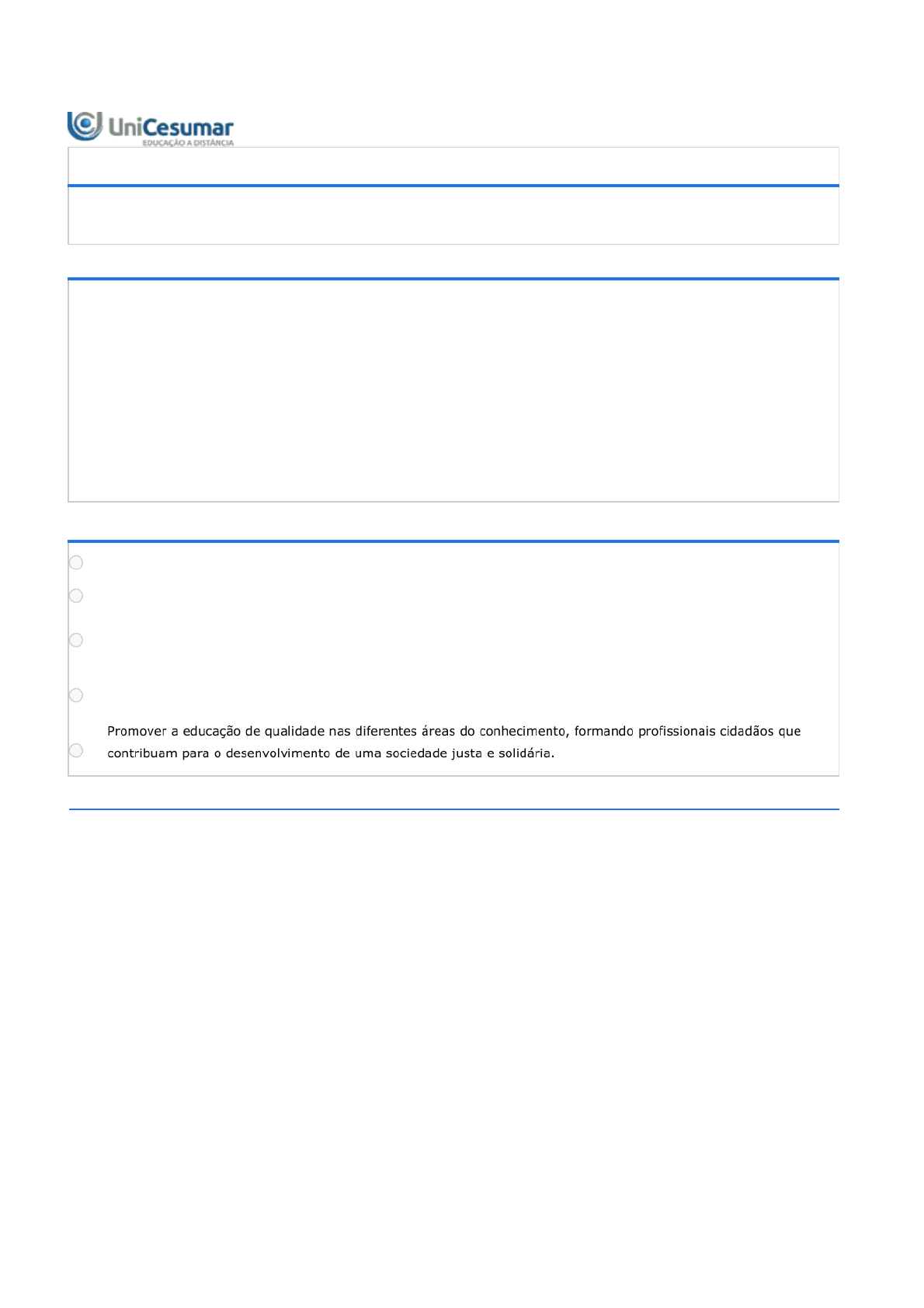Impresso por Dalton Marçal, E-mail daltonfireman@hotmail.com para uso pessoal e privado. Este material pode ser protegido por direitos autorais e não pode ser reproduzido ou repassado para terceiros. 09/06/2025, 17:35:50 21/04/2024 08:59 Unicesumar - Ensino a Distância about:blank 1/4 ATIVIDADE - ESPAÇO CALOURO - 51/2024 Período:04/12/2023 08:00 a 17/03/2024 23:59 (Horário de Brasília) Status:ENCERRADO Gabarito:Gabarito será liberado no dia 18/03/2024 00:00 (Horário de Brasília) 1ª QUESTÃO Quando falamos de missão e visão para uma organização, precisamos pensar além de uma simples frase, que ficará espalhada em uma placa nas paredes dessa organização. Precisamos entender e conhecer o significado da missão e da visão, para que elas possam fazer sentido de acordo comseu devido propósito. Fonte: adaptado de: Disponível em: https://ssgresultados.com.br/blog/missao-e-visao-qual-a-importancia- e-como-construir/. Acesso em: 28 nov. 2023. Considerando o exposto, analise as alternativas a seguir e assinale a que se refere a missão da nossa Instituição de ensino. ALTERNATIVAS Promover a qualidade e inovação da gestão acadêmica e administrativa. Compromisso com o conhecimento, com a aprendizagem e com a transformação da sociedade. Manter o relacionamento permanente com os egressos, incentivando a educação continuada, proporcionando a internacionalização e o ingresso no mundo do trabalho. Ser reconhecida como uma Instituição universitária de referência nacional pela qualidade de ensino na modalidade presencial e a distância (Ead), extensão e pesquisa. 2ª QUESTÃO Impresso por Dalton Marçal, E-mail daltonfireman@hotmail.com para uso pessoal e privado. Este material pode ser protegido por direitos autorais e não pode ser reproduzido ou repassado para terceiros. 09/06/2025, 17:35:50 21/04/2024 08:59 Unicesumar - Ensino a Distância about:blank 2/4 Quando escolhemos um curso, logo vem em nossa mente, presencial ou a distância? Issopode gerar dúvidas em saber qual o melhor método, até porque vários fatores podem interferir nessa escolha. Mas uma coisa é fato, as duas modalidades são reconhecidas pelo Ministério da Educação (MEC), não tendo diferença no diploma entre essas modalidades. Fonte: Elaborado pelo professor, 2023. Considerando o texto, analise as afirmativas a seguir sobre a modalidade a distância: I. Agrupa conteúdos inter-relacionados, de forma a garantir a qualidade do processo de ensino e aprendizagem. II. Os cursos são organizados de forma bimestral, permitindo que os ingressos sejam semestrais, totalizando duas novas turmas durante o ano letivo. III. Utiliza de multimeios e tecnologias de informação e comunicação nos processos de ensino e aprendizagem, permitindo que estudantes e profissionais da educação desenvolvam atividades educativas, estando em lugares e tempos diversos. IV. No ensino on-line, as aulas, atividades ou outras demandas do curso são realizadas totalmente à distância, permitindo uma maior flexibilidade de estudo e imersão nos conteúdos ofertados.Na metodologia híbrida, há momentos on-line, com aulas e atividades, alternados de práticas pedagógicas presenciais, o que possibilita uma formação mais autônoma e participativa. É correto o que se afirma em: ALTERNATIVAS I e II, apenas. III e IV, apenas. II, III e IV, apenas. I, II, III e IV. 3ª QUESTÃO Você já parou para pensar quantos documentos nós temos, quantos logins de acessos, quantas senhas, podendo ser difícil lembrarmos de todas, se não tivermos um controle? Porém, temos que ter em mente que de uma forma geral, esses documentos/registros comprovam não somente nossa existência, mas, também permitem exercer nossos direitos enquanto cidadãos. Fonte: Elaborado pelo professor, 2023. Em nossa Instituição temos um documento que confirma que você é um(a) aluno(a), o qual você utiliza para ter acesso ao Studeo e aos sistemas da biblioteca. Considerando o exposto, assinale a alternativa que se refere a esse documento: ALTERNATIVAS Impresso por Dalton Marçal, E-mail daltonfireman@hotmail.com para uso pessoal e privado. Este material pode ser protegido por direitos autorais e não pode ser reproduzido ou repassado para terceiros. 09/06/2025, 17:35:50 21/04/2024 08:59 Unicesumar - Ensino a Distância about:blank 3/4 Registro Estudantil (RE). Registro Institucional (RI). Registro Documental (RD). Registro Educacional (REDU). 4ª QUESTÃO O Ciclo de Aprendizagem é uma metodologia de ensino que envolve aprendizado por meio de experiências práticas, em que você é protagonista na construção do seu conhecimento. O Ciclo écomposto por sete etapas fundamentais, e orienta a composição de todos os materiais que contribuem para sua aprendizagem, como aulas, livros, podcasts e RAs. Toda essa construção objetiva uma abordagem que proporcione uma melhor prática no processo de ensino e aprendizagem. Fonte: Disponível em: https://sites.google.com/view/guiaunicesuestudante/unicesumar. Acesso em: 28nov. 2023. Conforme exposto, analise as afirmativas a seguir sobre algumas etapas que envolvem o Ciclo. I. Ação: Você encontrará informações que respaldam a importância do conteúdo estudado para sua carreira profissional. II. Significação: compõe informações e dados que devem significar o tema e fazer com que você construa sentido a partir dessas informações. III.Reflexão: A partir da experimentação, você será levado a refletir, por meios de perguntas ou pontos- chave, confirmando ou não as hipóteses iniciais. IV. Conceitualização: Nessa etapa, você terá acesso aos conceitos teóricos da disciplina, de modo que possa se aprofundar no conteúdo e construir novos conhecimentos. É correto o que se afirma em: ALTERNATIVAS II e III, apenas. I, II e III, apenas. I, III e IV, apenas. II, III e IV, apenas. 5ª QUESTÃO Impresso por Dalton Marçal, E-mail daltonfireman@hotmail.com para uso pessoal e privado. Este material pode