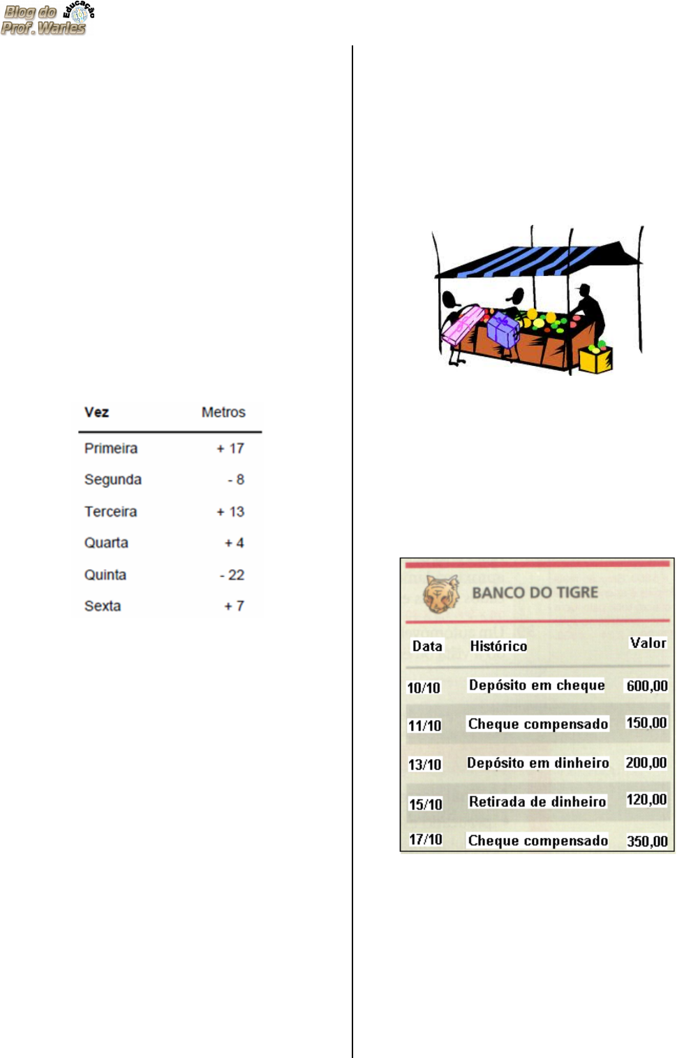 D20 - Resolver problema com números inteiros envolvendo as operações (adição, subtração, multiplicação, divisão e potenciação) (Prova Brasil). Na correção de uma prova de um concurso, cada questão certa vale +5 pontos, cada questão errada vale – 2 pontos, e cada questão não respondidas vale – 1 ponto. Das 20 questões da prova, Antônio acertou 7, errou 8 e deixou de responder as restantes. O número de pontos que Antônio obteve nessa prova foi: (☻☻) (A) 14 (B) 22 (C) 24 (D) 30 **************************************** (Prova brasil). Cíntia conduzia um carrinho de brinquedo por controle remoto em linha reta. Ela anotou em uma tabela os metros que o carrinho andava cada vez que ela acionava o controle. Escreveu valores positivos para as idas e negativos para as vindas. Após Cíntia acionar o controle pela sexta vez, a distância entre ela e o carrinho era de (☻☻) (A) – 11 m (B) 11 m (C) – 27 (D) 27 m **************************************** (Prova Brasil). Numa cidade da Argentina, a temperatura era de 12ºC. Cinco horas depois, o termômetro registrou – 7ºC. (☻☻) A variação da temperatura nessa cidade foi de: (A) 5 ºC (B) 7 ºC (C) 12 ºC (D) 19 ºC *************************************** Em uma cidade do Alasca, o termômetro marcou –15º pela manhã. Se a temperatura descer mais 13º, o termômetro vai marcar: (A) – 28º. (B) – 2º. (C) 2º. (D) 28º. *************************************** Um comerciante fez três vendas e teve prejuízo de R$ 16,00 na primeira venda, prejuízo de R$ 23,00 na segunda e lucro de R$ 45,00 na terceira. Podemos calcular o saldo resultante dos três negócios efetuados desta maneira: (A) –16 + (–23) + 45 = 6. (B) –16 – 23 – 45 = – 84. (C) 16 – 23 + 45 = 84. (D) –16 + 23 – 45 = – 38. *************************************** Veja o extrato que mostra a movimentação da conta bancaria de Gilda. Depois de todas essas informações, o extrato final da conta de Gilda é: (A) R$ 180,00 (B) R$ 780,00 (C) R$ 1420,00 (D) R$ 350,00 *************************************** Na figura abaixo faz parte de um trecho do extrato bancário de Sr. Carlos. 1 D20 - Resolver problema com números inteiros envolvendo as operações (adição, subtração, multiplicação, divisão e potenciação) Os valores dos saldos provisórios de A, B e C, são respectivamente: (☻☻) (A) 0,00; + 600,00 e 400,00. (B) 0,00; – 600,00 e – 400,00. (C) + 800,00; + 200,00 e + 400,00. (D) – 800,00; + 500,00 e 0,00. *************************************** Na figura podemos verificar a relação de altura entre um avião e um submarino em relação ao nível do mar. A distância entre o avião e o submarino é: (A) 900 metros. (B) – 900 metros. (C) 1500 metros. (D) – 1500 metros. **************************************** A parte da lua iluminada pelo Sol tem uma temperatura de + 110 graus e, a parte não iluminada, de – 130 graus. A variação de temperatura entre a parte iluminada e a não iluminada é: (A) 240 graus (B) 110 graus (C) 130 graus (D) – 30 graus. *************************************** O funcionário de um supermercado ficou gripado. Ele explicou que estava fazendo muito calor (33,5 ºC) e que, quando entrou na câmara frigorífica, a temperatura desceu 40 ºC. A temperatura dentro da câmara frigorífica é: (A) – 40 ºC. (B) – 7,5 ºC. (C) – 6,5 ºC. (D) 7,5 ºC. *************************************** Um depósito de bebidas recebeu 32 caixas de refrigerante da marca A e 25 caixas de refrigerantes da marca B. Cada caixa contém 12 unidades de refrigerante. Para o dono do deposito, cada refrigerante da marca A custa R$ 1,75 e o da marca B, R$ 2,10. O dono do deposito de refrigerante pagou pelas mercadorias foi de: (A) R$ 1.302,00. (B) R$ 108,50. (C) R$ 686,00. (D) R$ 950,00. ************************************** Na loja “Bom de bola“, o preço da bola oficial de vôlei está em promoção. Veja. Fonte: www.jogo.com.br Pedro aproveitou essa promoção e comprou uma bola. Ele pagou com uma nota de 50 Reais. Quanto Pedro recebeu de troco? A) R$ 10,25 B) R$ 11,55 C) R$ 28,45 D) R$ 50,00 2 D20 - Resolver problema com números inteiros envolvendo as operações (adição, subtração, multiplicação, divisão e potenciação) *************************************** Para fazer uma receita, Regina precisa de 1 kg de carne. Ao tirar o pacote de carne da geladeira, vê que ele tem apenas 625 gramas. De quantos gramas de carne ela ainda precisa para fazer a receita? A) 375 gramas. B) 325 gramas. C) 425 gramas. D) 485 gramas. *************************************** As regras de um campeonato de futebol são: Ao término do campeonato, um time obteve os seguintes resultados: 3 vitórias, 1 derrota e 2 empates. Quantos pontos alcançou esse time? A) -2 B) 0 C) +3 D) +5 *************************************** Veja a expressão numérica abaixo. O resultado dessa expressão é A) +120 B) +80 C) -60 D) -160 ************************************* Uma rede oficial de vôlei é colocada a 2,43 metros de altura do chão. O jogador mais alto da equipe Verde-Mar mede 1,85 m. Qual é a diferença de altura entre esse jogador e a rede oficial de vôlei? A) 0,58 metro. B) 1,42 metro. C) 1,68 metro. D) 1,85 metro. ************************************* Ao passar na porta de segurança de um banco, Vítor fez acionar o alarme. Ele levava uma carteira com 14 moedas, umas de 25 centavos e outras de 50 centavos num total de 4 reais. Quantas moedas de 25 centavos Vítor levava em sua carteira? A) 2 B) 7 C) 10 D) 12 ************************************** No mar, um mergulhador profissional atingiu uma profundidade de 18,4m. A seguir, subiu 3,5m e, depois, desceu 5,8m. Qual a profundidade máxima que ele atingiu? (A) 16,8 m. (B) 17,9 m. (C) 18,9 m. (D) 20,7 m. *************************************** No inverno do Alasca, a temperatura pode variar de - 22º a - 45º. Em Nova York, as temperaturas, no inverno, variam de -2