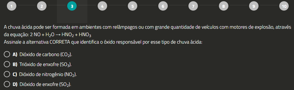 1 2 3 5 6 7 9 10 A chuva ácida pode ser formada em ambientes com relâmpagos ou com grande quantidade de veículos com motores de explosão, através da equação: Assinale a alternativa CORRETA que identifica responsável por esse tipo de chuva ácida: A) de carbono B) de enxofre C) de nitrogênio D) Dióxido de enxofre