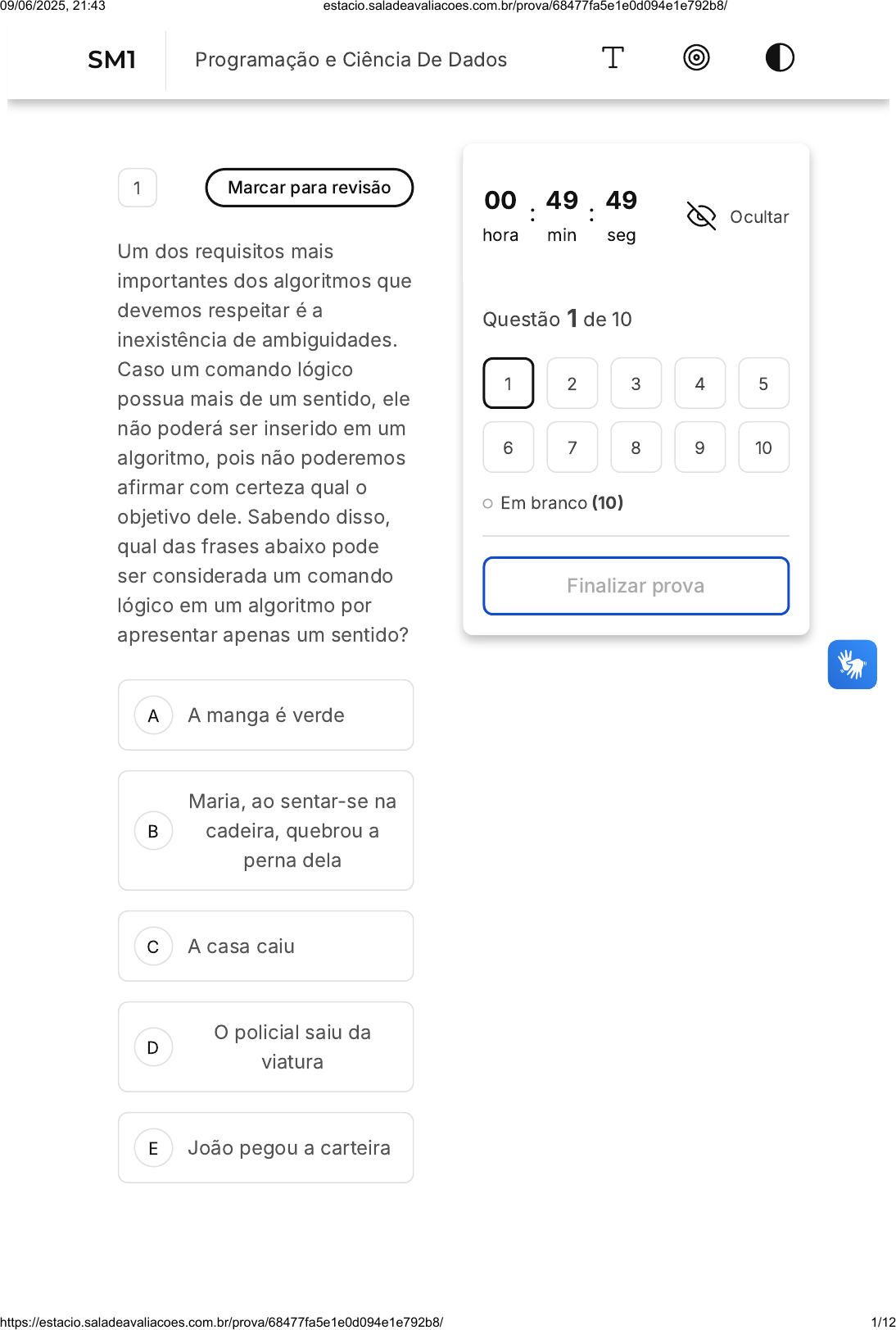 A B C D E 1 Marcar para revisão Um dos requisitos mais importantes dos algoritmos que devemos respeitar é a inexistência de ambiguidades. Caso um comando lógico possua mais de um sentido, ele não poderá ser inserido em um algoritmo, pois não poderemos afirmar com certeza qual o objetivo dele. Sabendo disso, qual das frases abaixo pode ser considerada um comando lógico em um algoritmo por apresentar apenas um sentido? A manga é verde Maria, ao sentar-se na cadeira, quebrou a perna dela A casa caiu O policial saiu da viatura João pegou a carteira 00 hora : 49 min : 49 seg Ocultar Questão 1 de 10 Em branco (10) Finalizar prova 1 2 3 4 5 6 7 8 9 10 SM1 Programação e Ciência De Dados 09/06/2025, 21:43 estacio.saladeavaliacoes.com.br/prova/68477fa5e1e0d094e1e792b8/ https://estacio.saladeavaliacoes.com.br/prova/68477fa5e1e0d094e1e792b8/ 1/12 A B C D E 2 Marcar para revisão A abstração diz respeito à capacidade de observar algo complexo e se ater apenas às informações principais. A partir desse entendimento, podemos dizer também que na abstração temos uma mensagem que é entendida em sua totalidade a partir de observação e interpretação de informações que não são completas. Sabendo disso, pode-se considerar um exemplo de abstração: Uma música Uma fruta Um mapa Um gato Uma revista 3 Marcar para revisão O comando de repetição é uma técnica muito importante para que se atinja o objetivo com o menor custo e tempo possível. 09/06/2025, 21:43 estacio.saladeavaliacoes.com.br/prova/68477fa5e1e0d094e1e792b8/ https://estacio.saladeavaliacoes.com.br/prova/68477fa5e1e0d094e1e792b8/ 2/12 A B C Ao utilizar essa técnica, devemos ter cuidado para que a lógica do nosso código não seja alterada ou desfeita. Quando tomamos o devido cuidado e a implementamos em nosso projeto, podemos perceber que ela executa várias instruções que definimos, mantendo o objetivo primário que é a lógica do nosso algoritmo para chegar a um resultado. Sabendo disso, utilizamos os comandos de repetição quando: Queremos que um conjunto de instruções sejam executadas em um número definido ou indefinido de vezes, sempre respeitando a ordem lógica dos algoritmos Queremos deixar nosso código mais leve, não importando a ordem lógica que os algoritmos se encontram Queremos agrupar os códigos iguais, facilitando a visualização do nosso código 09/06/2025, 21:43 estacio.saladeavaliacoes.com.br/prova/68477fa5e1e0d094e1e792b8/ https://estacio.saladeavaliacoes.com.br/prova/68477fa5e1e0d094e1e792b8/ 3/12 D E Estamos com pouco armazenamento de dados Queremos tornar nosso código mais eficaz 4 Marcar para revisão A lógica de programação é o passo mais importante para um projeto que envolve programação. Sem ela, é praticamente impossível organizar as ideias e os passos subsequentes que iremos tomar, portanto, sobre a lógica de programação é correto afirmar que: 09/06/2025, 21:43 estacio.saladeavaliacoes.com.br/prova/68477fa5e1e0d094e1e792b8/ https://estacio.saladeavaliacoes.com.br/prova/68477fa5e1e0d094e1e792b8/ 4/12 A B C Ela é uma aplicação voltada ao desenvolvimento da linguagem de programação dos computadores, sendo possível utilizá-la apenas no processo inicial de criação de projetos É caracterizada por uma etapa tardia da programação, sendo utilizada para realizar cálculos e desenvolver novos processos, exigindo pouco esforço lógico É caracterizada por uma etapa que vai desde o início da programação e pode chegar até as fases finais, sempre auxiliando na compreensão do que pode ser feito a partir de comandos lógicos e bem estruturados, voltados à solução de problemas 09/06/2025, 21:43 estacio.saladeavaliacoes.com.br/prova/68477fa5e1e0d094e1e792b8/ https://estacio.saladeavaliacoes.com.br/prova/68477fa5e1e0d094e1e792b8/ 5/12 D E Não pode ser utilizada em outras fases senão nas etapas iniciais, já que é a primeira fase da construção dos algoritmos, sendo estes a próxima etapa do desenvolvimento. Antecede todas as fases de criação e desenvolvimento, mas torna-se irrelevante após a utilização de linguagens de programação 5 Marcar para revisão As constantes são classificadas como sendo valores fixos que não podem ser alterados durante a execução de um programa, elas facilitam a execução e construção de programas, pois os valores das constantes tornam o programa mais legível e compreensível, pois evitam o uso de entrada de dados novos, com isso, são evitados erros de atribuição acidental, pois o valor da constante é fixo. Sabendo disso, pode ser considerado um exemplo de constante: 09/06/2025, 21:43 estacio.saladeavaliacoes.com.br/prova/68477fa5e1e0d094e1e792b8/ https://estacio.saladeavaliacoes.com.br/prova/68477fa5e1e0d094e1e792b8/ 6/12 A B C D E Umidade relativa do ar π Nossos batimentos cardíacos Temperatura de uma cidade Saldo bancário 6 Marcar para revisão As constantes são classificadas como sendo valores fixos que não podem ser alterados durante a execução de um programa, elas facilitam a execução e construção de programas, pois os valores das constantes tornam o programa mais legível e compreensível, pois evitam o uso de entrada de dados novos, com isso, são evitados erros de atribuição acidental, pois o valor da constante é fixo. Sabendo disso, pode ser considerado um exemplo de constante: 09/06/2025, 21:43 estacio.saladeavaliacoes.com.br/prova/68477fa5e1e0d094e1e792b8/ https://estacio.saladeavaliacoes.com.br/prova/68477fa5e1e0d094e1e792b8/ 7/12 A B C D E A B Umidade relativa do ar π Nossos batimentos cardíacos Temperatura de uma cidade Saldo bancário 7 Marcar para revisão As informações do tipo lógica possuem uma estrutura coerente e correta, e com isso pode ser avaliada como verdadeira ou falsa. Ela tem como característica a expressão por meio de proposição, que é um enunciado que afirma ou nega algo sobre um sujeito. Sabendo disso, qual dos exemplos abaixo pode ser considerado uma info