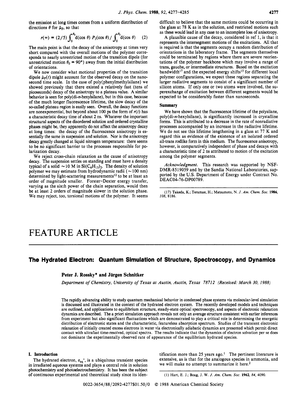 J. Phys. Chem. 1988, 92, 4277-4285 4277 the emission a t long times comes from a uniform distribution of directions 0 for fiF, so that r ( m ) = ( 2 / 5 ) ~ d % ( c o s e) P2(c0s O ) / l ” d ( c o s 0 0) (2) The main point is that the decay of the anisotropy at times very short compared with the overall motions of the polymer corre- sponds to nearly unrestricted motion of the transition dipole (for unrestricted motion 0, = 90°) away from the initial distribution of orientations. We now consider what motional properties of the transition dipole f iF(t) might account for the observed decay on the nano- second time scale. In the case of poly(phenylmethylsi1ane) we showed previously that there existed a relatively fast (tens of picoseconds) decay of the anisotropy to a plateau value. A similar behavior is seen for poly(di-n-hexylsilane), but in this case, because of the much longer fluorescence lifetime, the slow decay of the so-called plateau region is easily seen. Overall, the decay functions are nonexponential, but beyond about 100 ps the form of r( t ) has a characteristic decay time of about 2 ns. Whatever the important structural aspects of the disordered solution and ordered crystalline phases might be, they apparently do not affect the anisotropy decay at long times: the decay of the fluorescence anisotropy is es- sentially the same in suspension and solution. Nor is the anisotropy decay eeatly changed at liquid nitrogen temperature: there seems to be no significant barrier to the processes responsible for po- larization decay. We reject cross-chain relaxation as the cause of anisotropy decay. The suspension settles on standing and must have a density typical of a solid - 10 M in Si(C6H&. The density of solution polymer we may estimate from hydrodynamic radii ( - 100 nm) determined by light-scattering measurementsL2 to be at least an order of magnitude smaller. Forster-Dexter energy transfer, varying as the sixth power of the chain separation, would then be a t least 2 orders of magnitude slower in the solution phase. We may reject, too, torsional motions of the polymer. It seems FEATURE ARTICLE difficult to believe that the same motions could be occurring in the glass a t 78 K as in the solution, and restricted motions such as these would lead in any case to an incomplete loss of anisotropy. A plausible cause of the decay, considered in ref 1, is that it represents the intersegment motions of the excitations. All that is required is that the segments occupy a random distribution of orientations in the laboratory frame. The segments themselves could be terminated by regions where there are severe reorien- tations of the polymer backbone which may involve a range of trans, gauche, or intermediate structures. Based on the excitation bandwidth” and the expected energy shiftsLs for different local polymer configurations, we expect these regions separating the larger radiative segments to consist of a significant number of silicon atoms. If only one or two atoms were involved, the su- perexchange of excitation between different segments would be expected to be considerably faster than nanoseconds. Summary We have shown that the fluorescence lifetime of the polysilane, poly(di-n-hexylsilane), is significantly increased in crystalline forms. This is attributed to a decrease in the rate of nonradiative processes accompanied by an increase in the radiative lifetime. We do not see this lifetime lengthening in a glass a t 77 K and regard this as evidence of the existence of an isolated ordered all-trans rodlike form in this medium. The fluorescence anisotropy, however, is comparatively independent of phase and decays with a characteristic time of 2 ns attributed to motion of the excitation among the polymer segments. Acknowledgment. This research was supported by NSF- DMR-85 19059 and by the Sandia National Laboratories, sup- ported by the US . Department of Energy under Contract No. DEAC04-76-DP00789. (17) Takeda, K.; Teramae, H.; Matsumoto, N. J . Am. Chem. SOC. 1986, 208, 8186. The Hydrated Electron: Quantum Simulation of Structure, Spectroscopy, and Dynamics Peter J. Rossky* and Jurgen Schnitker Department of Chemistry, University of Texas at Austin, Austin, Texas 7871 2 (Received: March 30, 1988) The rapidly advancing ability to study quantum mechanical behavior in condensed phase systems via molecular-level simulation is discussed and illustrated in the context of the hydrated electron system. The recently developed models and techniques are outlined, and applications to equilibrium structure, steady-state optical spectroscopy, and aspects of electronic relaxation dynamics are described. The a priori simulation approach reveals not only an average structure consistent with earlier inferences from experiment but also significant fluctuations which are demonstrated to play a critical role in determining the energetic distribution of electronic states and the characteristic, featureless absorption spectrum. Studies of the transient electronic relaxation of initially created excess electrons in water via electronically adiabatic dynamics are presented which permit direct contact with ultrafast time-resolved, optical spectra. The results indicate that the dynamics of electron solvation per se does not dominate the experimentally observed rate of appearance of the equilibrium hydrated species. I. Introduction The hydrated electron, e,,, is a ubiquitous transient species in irradiated aqueous systems and plays a central role in solution photochemistry and photoelectrochemistry. It has been the subject of continuous experimental and theoretical study since its iden- tification more than 25 years ago.’ The pertinent literature is we Will make no attempt to wm”m-Ie it here.’ extensive, as is that for the analogous species in ammonia, and (1) Hart, E. J.; Boag, J. W. J . Am. Chem. SOC. 1962, 84, 4090. 0022-365418812092-4277$01.50/0 0 1988 American Chemical Society 4278 The Journal of Phys
