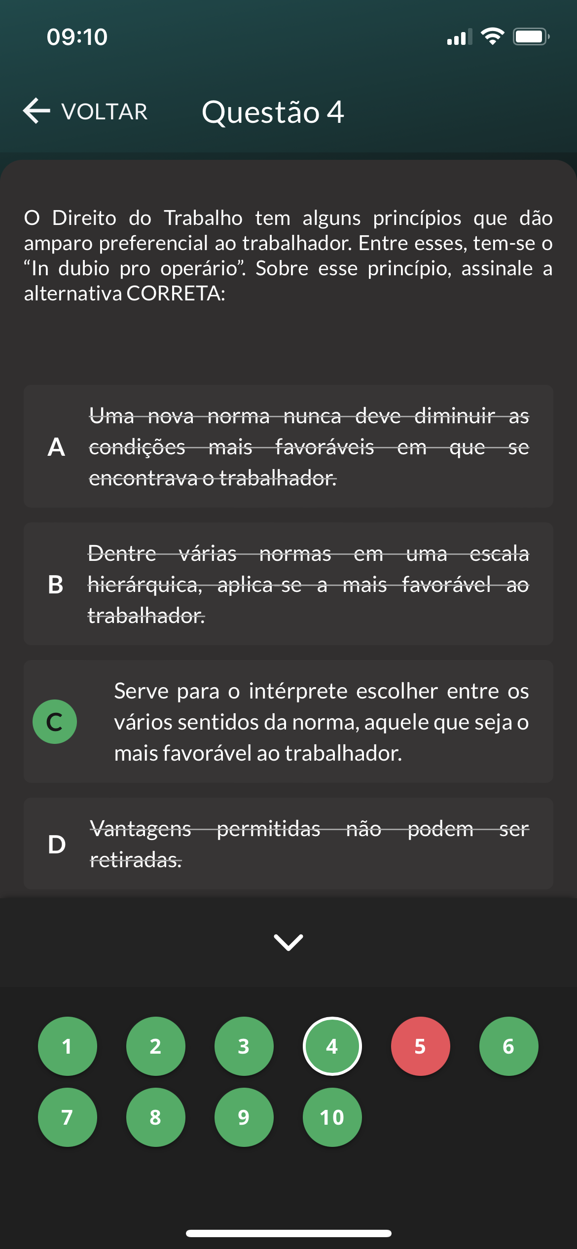 09:10 VOLTAR Questão 4 O Direito do Trabalho tem alguns princípios que dão amparo preferencial ao trabalhador. Entre esses, tem-se "In dubio pro operário". Sobre esse princípio, assinale a alternativa CORRETA: Uma nova norma as A condições mais se encontrava O trabalhador. Dentre várias normas escala hierárquica, aplica-se a mais favorável ao trabalhador. Serve para intérprete escolher entre os C vários sentidos da norma, aquele que seja mais favorável ao trabalhador. Vantagens permitidas não podem D retiradas. 1 2 3 4 5 6 7 8 9 10