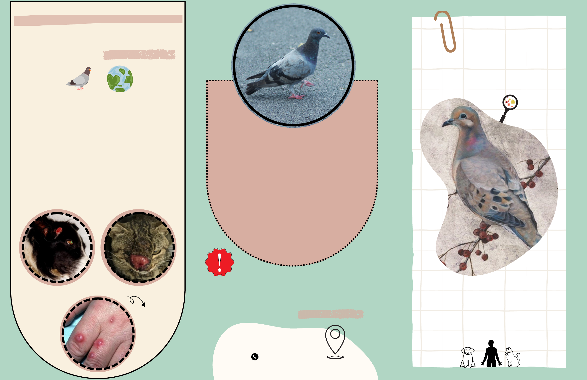 "O principal reservatório do fungo é a matéria orgânica morta presente no solo, em frutas secas e nas árvores. O fungo causador da doença também é encontrado nas fezes de aves, principalmente dos pombos." Micose fungica conhecida como Torulose e popularmente como doença dos pombos. Av. Heitor Siqueira, 1520 - Jardim da Mata, Americana - SP, 13476-444 19) 3467-1187 CCZ Americana-SP gatos: A cripitococose é uma infecção fúngica provocada pelo fungo Cryptococcus neoformans ou Cryptococcus gattii. que produz lesões nodulares, Espalhada por todo o mundo essa zoonose potencialmente fatal acomete cães, gatos , animais silvestres e ao homem também cães: humanos: CRIPTOCOCOSE: Beatriz Monteoliva RA: 20190794 Emilayni Valério Silva RA: 20182286 Larissa Sena Oliveira RA: 20190731 A Criptococose trata-se de uma zoonose, portanto, sua notificação ao Centro de controle de Zoonoses é obrigatóriaCriptococose que se espalha pela pele CRIPTOCOCOSE: A maior característica sintomática é o aparecimento de várias lesões avermelhadas na pele, contendo secreção amarelada no centro. Quando está no pulmão os sintomas são: febre, tosse, dor no peito e dificuldade em respirar E essa doença pode causar Meningite que é inflamação no cérebro, nesse caso os sintomas são: Dor de cabeça, visão turva, depressão, agitação e confusão As manifestações clínicas dependem do estado imunológico do individuo, geralmente causa sintomas leves e imprecisos que variam dependendo de onde a infecção está localizada no corpo. Cuidados para previnir a doença do pombo Sintomas No ambiente o fungo presente nos excrementos de aves e na vegetação em decomposição pode sobreviver por até 2 anos. Pode ocorrer disseminiação para o cérebro, olhos, linfonodos, e outros tecidos em humanos, em pets a única exceção é no cérebro. O fungo se multiplica nas fezes fora do organismo do animal, após sua excreção. Curiosidades Evite contato contato com as aves e aglomerado de pombos Umedeça as fezes antes de removê- las Bloqueie espaços livres, especialmente em telhados, para evitar a formação de ninhos Exames Diagnóstico Para diagnosticar criptococose, o médico colhe amostras de tecido e de líquidos do organismo para fazer a cultura e análise. Forma de transmissão A transmissão ocorre por inalação dos fungos causadores, principalmente ao limpar e remexer as fezes secas das aves, principalmente de pombos CONTATO DIRETO COM POMBOS INFECTADOS CONTATO COM FEZES DE POMBO INGESTÃO DE ALIMENTOS CONTAMINADOS INFECÇÃO DE ANIMAIS DOMÉSTICOS Tratamento O tratamento da criptococose é realizado com medicamentos antifúngicos.