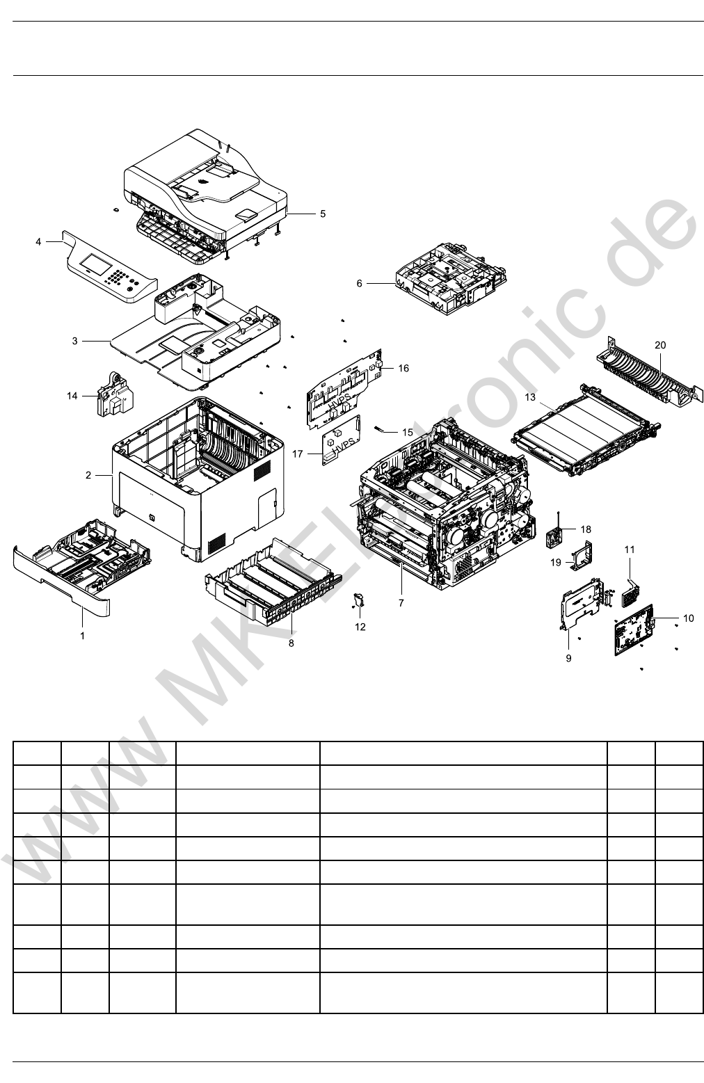 Exploded Views and Parts List 1. MAIN Exploded View Parts List No. Lvl. Loc. Material Code Description & Specification SNA Qty. 1 1 JC90-01182B CASSETTE; C3010,NON-MD SA 1 2 1 JC95-01643B COVER; SL-C3060ND,SEC SNA 1 3 1 JC95-01737E COVER-MIDDLE; SL-C3060FR,SEC SA 1 4 1 JC95-01769N OPE; SL-C3060FR,SEC,English SA 1 5 1 JC97-04751A SCANNER; SL-C3060 SNA 1 6 1 JC97-04082B LSU; C3010,SEC,CL1,COLOR,30ppm,216,BOTTOM SA 1 7 1 JC93-01290B FRAME; SL-C3010ND,SEC,SEE SNA 1 8 2 JC93-00757B FRAME-DRAWER; SL-C3010ND,SEC SA 1 9 2 JC61-07491A BRACKET-MAIN BOARD; SL-C2680FX,EGI-SECC,0 SNA 1 Copyright© 1995-2016 SAMSUNG. All rights reserved. 1 www M K-E lec tro nic de /#q=JC90-01182B /#q=JC95-01643B /#q=JC95-01737E /#q=JC95-01769N /#q=JC97-04751A /#q=JC97-04082B /#q=JC93-01290B /#q=JC93-00757B /#q=JC61-07491A Exploded Views and Parts List No. Lvl. Loc. Material Code Description & Specification SNA Qty. 10 2 JC92-02906A PBA MAIN; C3060,A2000,DDR3,GVL,USB 2.0,MD SA 1 11 2 JC61-05520A GUIDE-HARNESS SCAN; CLP-680DW,HIPS,110,HR SNA 1 12 2 JC63-03763A COVER-CONN; CLP-680DW,ABS,70,BLACK,HF-066 SNA 1 13 1 JC93-01287A ITB; C3010,SEC,WORLD,30ppm,230mm,241mm,NO SA 1 14 1 JC96-06367A CARTRIDGE-WTB; CLP-680ND SA 1 15 3 JC93-00658A FRAME-T1 TERMINAL; CLP-470N,XAA SNA 1 16 3 JC44-00242A HVPS; C30-HVPS1,CH,24V,21.6~26.4V,Max-2kV SA 1 17 3 JC44-00243A HVPS; C30-HVPS2,CH,24V,21.6~26.4V,Max 7KV SA 1 18 2 JC31-00161A FAN; Type7,24,170mA,0.949m^3/mi SA 1 19 2 JC67-00766A DUCT-FAN UPPER; C2620,HIPS,1.5,90,90,HB,5 SNA 1 20 2 JC63-03703B COVER-REAR BOTTOM; C30,HIPS,Cream White SNA 1 2 Copyright© 1995-2016 SAMSUNG. All rights reserved. www M K-E lec tro nic de /#q=JC92-02906A /#q=JC61-05520A /#q=JC63-03763A /#q=JC93-01287A /#q=JC96-06367A /#q=JC93-00658A /#q=JC44-00242A /#q=JC44-00243A /#q=JC31-00161A /#q=JC67-00766A /#q=JC63-03703B Exploded Views and Parts List 2. COVER Exploded View Copyright© 1995-2016 SAMSUNG. All rights reserved. 3 www M K-E lec tro nic de Exploded Views and Parts List Parts List No. Lvl. Loc. Material Code Description & Specification SNA Qty. 1 2 JC95-01691B COVER-FRONT; C3010,SEC SA 1 1-1 3 JC66-03640A LINK-SUPPORT R; CLP-680ND,HIPS,SPLIT GRAY SNA 1 1-2 3 JC66-03639A LINK-SUPPORT L; CLP-680ND,HIPS,SPLIT GRAY SNA 1 1-3 3 JC64-00832A BUTTON-FRONT; CLX-6260ND,ABS,SPLIT BROWN SNA 1 1-4 3 G1550 6107-001404 SPRING-CS; SWPB,WHT,PI0.65,D6.1,L16.4,ID4 SNA 1 1-5 3 JC63-03742B COVER-FRONT; HIPS,Cream White SNA 1 1-6 3 JC64-00912A LOCKER-LATCH_PUSH; SL-M4020ND,POM,BLACK,S SA 1 1-7 3 JC66-02086D LINK-COVER_MP; CLP-680ND,ABS,NAOTO GRAY(G SA 2 1-8 3 JC95-01651B COVER-MP TRAY; C3010,SEC SA 1 1-9 3 JC61-05810A BRACKET-FRONT; CLX-6260,EGI-SECC,1.2,PRES SNA 2 2 2 JC63-03802A COVER-FRONT INNER; CLP-680ND,HIPS,SPLIT G SNA 1 3 2 JC95-01657B COVER-REAR; C3060,SEC SA 1 4 2 JC95-01661B COVER-LEFT; C3010,SEC SNA 1 4-1 3 JC63-03734B COVER-WTB; C30,HIPS,Cream White SA 1 4-2 3 JC63-03744B COVER-LEFT; C30,HIPS,Cream White SA 1 5 2 JC95-01665B COVER-RIGHT; SL-C3060ND,SEC SNA 1 5-1 3 JC63-03743B COVER-RIGHT; C3060,HIPS,CREAM WHITE,S-834 SA 1 5-2 3 JC63-03732B COVER-DIMM; C30,HIPS,Cream White SA 1 4 Copyright© 1995-2016 SAMSUNG. All rights reserved. www M K-E lec tro nic de /#q=JC95-01691B /#q=JC66-03640A /#q=JC66-03639A /#q=JC64-00832A /#q=6107-001404 /#q=JC63-03742B /#q=JC64-00912A /#q=JC66-02086D /#q=JC95-01651B /#q=JC61-05810A /#q=JC63-03802A /#q=JC95-01657B /#q=JC95-01661B /#q=JC63-03734B /#q=JC63-03744B /#q=JC95-01665B /#q=JC63-03743B /#q=JC63-03732B Exploded Views and Parts List 2.1. COVER-REAR Exploded View Parts List No. Lvl. Loc. Material Code Description & Specification SNA Qty. 1 3 JC61-05421A GUIDE-TRANSFER; CLP-680ND,HIPS,HIPS-5197, SNA 1 2 3 JC95-02044A COVER-REARTRANSFER; C3010,SEC,WORLD SA 1 2-1 4 JC66-03756A ROLLER TR-TRANSFER2; Rousseau,-,KOREA,SCF SA 1 2-2 4 JC61-05463A HOLDER-T2; CLP-680ND,POM,10.4,32,BLACK,12 SNA 2 2-3 4 JC61-05471A PLATE-BIAS-TRANSFER; CLP-680ND,STS304,0.2 SNA 1 2-4 4 6107-003201 SPRING-TS; SWP,0.9,11.2,10.3,3.125,LEFT,1 SNA 1 2-5 4 JC64-00803A LOCKER-TRANSFER R; CLP-680ND,POM,WHITE,42 SNA 1 2-6 4 JC61-05472A PLATE-GROUND TRANSFER2; CLP-680ND,STS304, SNA 1 2-7 4 D1171 JC70-10232A IPR-PLATE SAW; ML-80,STS304,T0.1 SNA 1 Copyright© 1995-2016 SAMSUNG. All rights reserved. 5 www M K-E lec tro nic de /#q=JC61-05421A /#q=JC95-02044A /#q=JC66-03756A /#q=JC61-05463A /#q=JC61-05471A /#q=6107-003201 /#q=JC64-00803A /#q=JC61-05472A /#q=JC70-10232A Exploded Views and Parts List No. Lvl. Loc. Material Code Description & Specification SNA Qty. 3 3 JC90-01204A DUPLEX GUIDE-UPPER; CLP-680ND SA 1 3-1 4 JC66-02981A ROLLER IDLE-DUPLEX_OUTER; ML-5015ND,EPDM SNA 2 3-2 4 6107-003256 SPRING-TS; SUS304,NO,0.55,4.05,3.5,2-5.8, SNA 2 3-3 4 JC66-03721A GEAR-DOUBLE DRIVE DUPLEX; CLP-680ND,POM,0 SNA 1 3-4 4 JC66-03720A GEAR-IN DUPLEX; CLP-680ND,POM,0.8,16,14.8 SNA 1 4 3 JC90-01203A DUPLEX GUIDE-LOWER; CLP-680ND SNA 1 4-1 4 JC66-03635A ROLLER IDLE-DUPLEX; CLP-680ND,EPDM,SUM22, SA 1 4-2 4 A4233 6602-001588 BELT-TIMING GEAR; RUBBER,T3.2,L152 SNA 1 4-3 4 JC66-03722A GEAR-DUPLEX; CLP-680ND,POM,0.6,20,NATURAL SNA 1 4-4 4 JC66-03008A SHAFT-FEED_DUP_1; ML-2950ND,POM,58.1,3.95 SNA 1 4-5 4 JC66-03601A LEVER-ALIGN ADJUST; CLP-680ND,ABS,13.5,19 SNA 1 4-6 4 JC61-05422A BRACKET-GUIDE ALIGN; CLP-680ND,EGI-SECC,0 SNA 1 4-7 4 JC66-03010A PULLEY-DUP; ML-2950ND,POM,NATURAL,3.95,10 SNA 2 5 3 JC61-05420A GUIDE-REAR; CLP-680ND,ABS,HF-0660i,SPLIT SNA 1 6 3 JC63-03737B COVER-REAR; C30,HIPS,Cream White SA 1 6 Copyright© 1995-2016 SAMSUNG. All rights reserved. www M K-E lec tro nic de /#q=JC90-01204A /#q=JC66-02981A /#q=6107-003256 /#q=JC66-03721A /#q=JC66-03720A /#q=JC90-01203A /#q=JC66-03635A /#q=6602-001588 /#q=JC66-03722A /#q=JC66-03008A /#q=JC66-03601A /#q=JC61-05422A /#q=JC66-03010A /#q=JC61-05420A /#q=JC63-03737B Exploded Views and Parts List 3. COVER-MIDDLE Exploded View Parts List No. Lvl. Loc. Material Code Description & Specification SNA Qty. 0 1 JC95-01737E COVER-MIDDLE; SL-C3060FR,SEC SA 1 1 2 JC63-03797A COVER-MIDDLE DUMMY LEFT; CLP-68