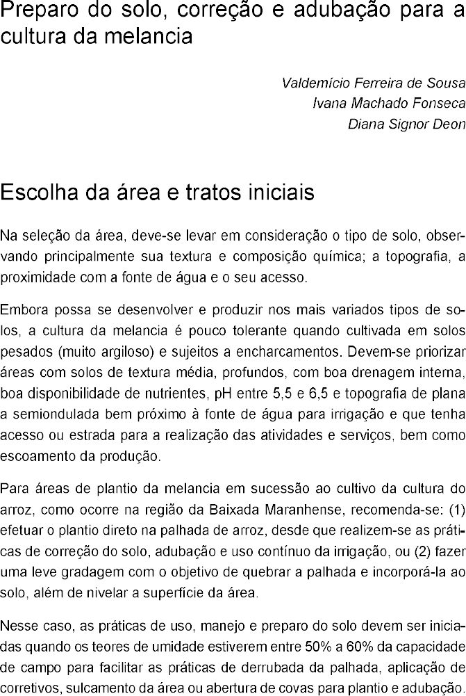 Preparo do solo, correção e adubação para a cultura da melancia Valdemício Ferreira de Sousa Ivana Machado Fonseca Diana Signor Deon Escolha da área e tratos iniciais Na seleção da área, deve-se levar em consideração o tipo de solo, obser- vando principalmente sua textura e composição química; a topografia, a proximidade com a fonte de água e o seu acesso. Embora possa se desenvolver e produzir nos mais variados tipos de so- los, a cultura da melancia é pouco tolerante quando cultivada em solos pesados (muito argiloso) e sujeitos a encharcamentos. Devem-se priorizar áreas com solos de textura média, profundos, com boa drenagem interna, boa disponibilidade de nutrientes, pH entre 5,5 e 6,5 e topografia de plana a semiondulada bem próximo à fonte de água para irrigação e que tenha acesso ou estrada para a realização das atividades e serviços, bem como escoamento da produção. Para áreas de plantio da melancia em sucessão ao cultivo da cultura do arroz, como ocorre na região da Baixada Maranhense, recomenda-se: (1) efetuar o plantio direto na palhada de arroz, desde que realizem-se as práti- cas de correção do solo, adubação e uso contínuo da irrigação, ou (2) fazer uma leve gradagem com o objetivo de quebrar a palhada e incorporá-la ao solo, além de nivelar a superfície da área. Nesse caso, as práticas de uso, manejo e preparo do solo devem ser inicia- das quando os teores de umidade estiverem entre 50% a 60% da capacidade de campo para facilitar as práticas de derrubada da palhada, aplicação de corretivos, sulcamento da área ou abertura de covas para plantio e adubação.28 DOCUMENTOS 5 e 258 Amostragem e análise química e física do solo As análises química e física das amostras de terra coletadas na área es- colhida para o plantio da melancia têm como finalidade definir as necessi- dades de calcário e/ou de fertilizantes a serem aplicados, e para o manejo adequado da fertilidade do A amostragem de terra constitui a primeira etapa da avaliação da fertilidade do solo, e é muito importante que seja bem realizada, uma vez que uma amostragem inadequada fornecerá resultados falsos e acarretará uma série de prejuízos, sobretudo, ao agricultor. Para coletar amostras de solo na área a ser plantada, é preciso seguir as recomendações práticas, tais como: (1) separar a área em glebas homogêneas quanto à vegetação, ao relevo, ao tipo solo (cor, textura), ao histórico agrícola da área, drenagem etc.; (2) retirar 20 amostras simples para cada hectare para formar uma amostra composta; essas amostras deverão se coletadas em ziguezague, obede- cendo-se à profundidade da camada arável (0,00 - 0,20 m); retirando + 500 g (meio quilo) para o envio ao laboratório, devidamente embaladas e identificadas. Aplicação e incorporação de calcário Recomenda-se aplicar calcário agrícola em quantidade suficiente para cor- rigir o pH do solo em níveis de 5,5 a 6,5 e elevar a saturação por bases (V%) a Sempre que nos resultados da análise química da terra o pH e a V% estiverem abaixo desses níveis, torna-se necessário fazer a correção com calcário agrícola, determinando a quantidade a ser aplicada por meio de um dos métodos descritos a seguir.Tecnologias para a produção de melancia irrigada na Baixada Maranhense 29 Neutralização do alumínio e elevação dos teores de cálcio magnésio NC = Em que: NC é a necessidade de calagem (t ha-1); é o teor de alumínio trocável do solo Ca2+ é o teor de cálcio trocável do solo (cmolo Mg2+ é o teor de magnésio trocável do solo 100 PRNT PRNT é o poder relativo de neutralização total do calcário. Nessa metodologia, a necessidade de calagem pode ser também calculada considerando o poder tampão do solo e a disponibilidade de Ca2+ e Mg2+ requerida pela cultura, conforme segue. NC Em que: Y é a variável relacionada à capacidade tampão do podendo ser defi- nida com a textura do solo (adotar: Y=1 para solos com teor de argila menor que 15%; Y=2 para solos com teor de argila entre 15% e 35% e Y=3 com teor de argila maior que 35%); é o teor de alumínio trocável do solo (cmol, Ca2+ é o teor de cálcio trocável do solo Mg2+ é o teor de magnésio trocável do solo Saturação por bases Com base no resultado da análise química da terra, o cálculo da quantidade de calcário a ser aplicada poderá ser feito para a elevação da porcentagem de saturação por bases para conforme a equação a seguir:30 DOCUMENTOS 5 e 258 PRNT Em que: NC é a quantidade de calcário necessária para neutralizar a acidez do solo na camada de 0,20 m de profundidade (t ha-1); é o valor da saturação por bases desejada pela cultura (%); é o valor da saturação por bases inicial do solo (%); CTC é a capacidade de troca catiônica a pH 7,0; PRNT é o poder relativo de neutralização total do calcário agrícola adquirido. A CTC pode ser calculada a partir da soma de base (SB) e acidez potencial fornecidos pela análise de solo, assim: = Ca + Mg + K + Na, em SB + (H em cmol A escolha do método deverá ser baseada em critérios técnicos, como textu- ra e capacidade tampão do solo. Após determinada a quantidade de calcário, esse deve ser aplicado metade da dose a lanço e em área total e incorporado ao solo por meio de aração; em seguida, aplica-se a outra metade da dose e incorpora por meio de gra- dagem, com antecedência de, no mínimo, 30 dias do plantio. A aplicação do calcário deve ser feita de maneira mais uniforme possível, em toda a extensão da área, de modo que haja a mais íntima mistura com as partículas do solo aumentando a superfície de contato. A incorporação do calcário deverá ser em profundidade de pelo menos até 20-25 centímetros. A reação do calcário no solo, neutralizando sua acidez, só acontece na presença de umidade, e será mais lenta quanto mais gros- seira for a granulometria de suas partículas. É importante considerar que o calcário dolom
