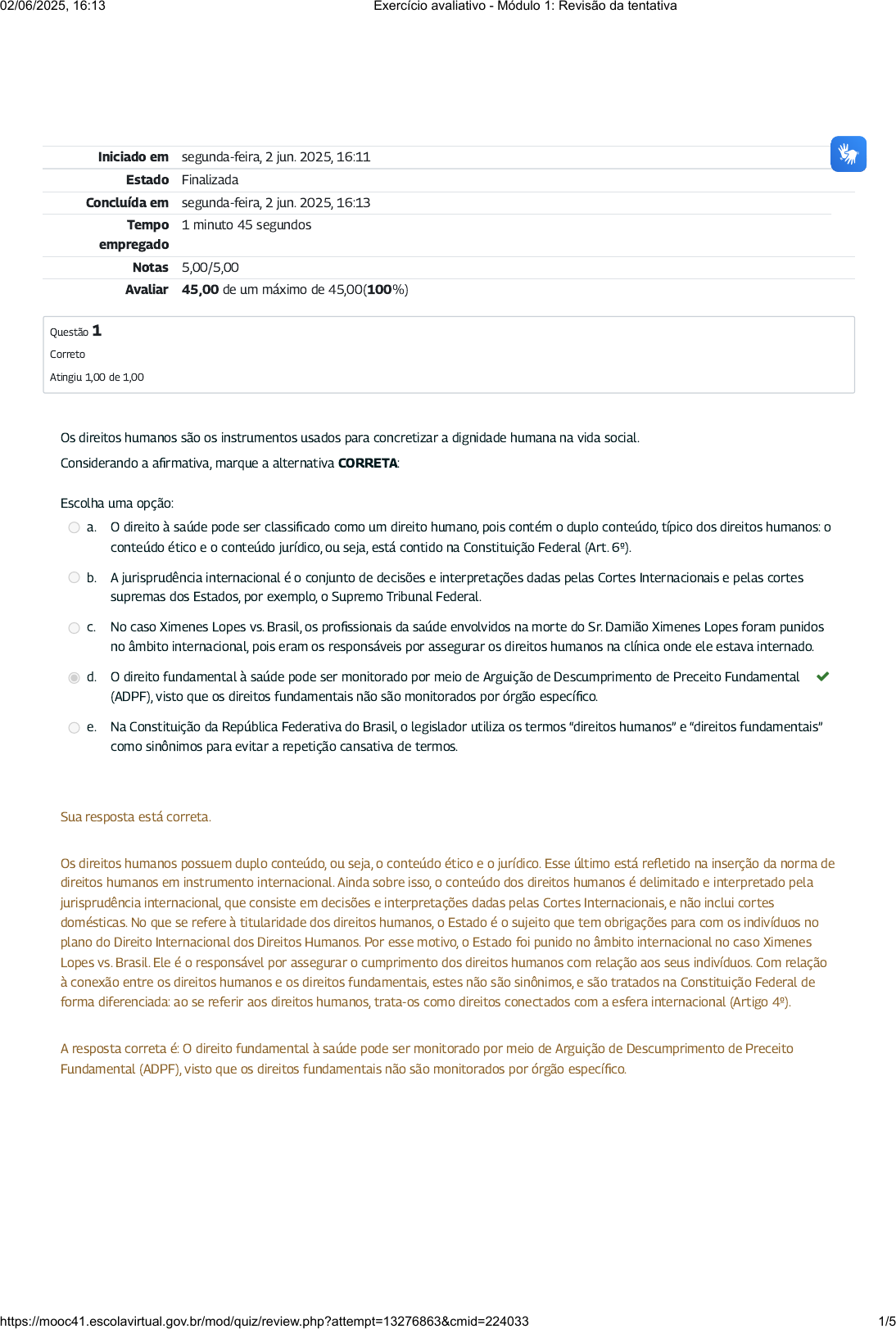 Iniciado em segunda-feira, 2 jun. 2025, 16:11 Estado Finalizada Concluída em segunda-feira, 2 jun. 2025, 16:13 Tempo empregado 1 minuto 45 segundos Notas 5,00/5,00 Avaliar 45,00 de um máximo de 45,00(100%) Questão 1 Correto Atingiu 1,00 de 1,00 Os direitos humanos são os instrumentos usados para concretizar a dignidade humana na vida social. Considerando a afirmativa, marque a alternativa CORRETA: Escolha uma opção: a. O direito à saúde pode ser classificado como um direito humano, pois contém o duplo conteúdo, típico dos direitos humanos: o conteúdo ético e o conteúdo jurídico, ou seja, está contido na Constituição Federal (Art. 6º). b. A jurisprudência internacional é o conjunto de decisões e interpretações dadas pelas Cortes Internacionais e pelas cortes supremas dos Estados, por exemplo, o Supremo Tribunal Federal. c. No caso Ximenes Lopes vs. Brasil, os profissionais da saúde envolvidos na morte do Sr. Damião Ximenes Lopes foram punidos no âmbito internacional, pois eram os responsáveis por assegurar os direitos humanos na clínica onde ele estava internado. d. O direito fundamental à saúde pode ser monitorado por meio de Arguição de Descumprimento de Preceito Fundamental (ADPF), visto que os direitos fundamentais não são monitorados por órgão específico. e. Na Constituição da República Federativa do Brasil, o legislador utiliza os termos “direitos humanos” e “direitos fundamentais” como sinônimos para evitar a repetição cansativa de termos. Sua resposta está correta. Os direitos humanos possuem duplo conteúdo, ou seja, o conteúdo ético e o jurídico. Esse último está refletido na inserção da norma de direitos humanos em instrumento internacional. Ainda sobre isso, o conteúdo dos direitos humanos é delimitado e interpretado pela jurisprudência internacional, que consiste em decisões e interpretações dadas pelas Cortes Internacionais, e não inclui cortes domésticas. No que se refere à titularidade dos direitos humanos, o Estado é o sujeito que tem obrigações para com os indivíduos no plano do Direito Internacional dos Direitos Humanos. Por esse motivo, o Estado foi punido no âmbito internacional no caso Ximenes Lopes vs. Brasil. Ele é o responsável por assegurar o cumprimento dos direitos humanos com relação aos seus indivíduos. Com relação à conexão entre os direitos humanos e os direitos fundamentais, estes não são sinônimos, e são tratados na Constituição Federal de forma diferenciada: ao se referir aos direitos humanos, trata-os como direitos conectados com a esfera internacional (Artigo 4º). A resposta correta é: O direito fundamental à saúde pode ser monitorado por meio de Arguição de Descumprimento de Preceito Fundamental (ADPF), visto que os direitos fundamentais não são monitorados por órgão específico. 02/06/2025, 16:13 Exercício avaliativo - Módulo 1: Revisão da tentativa https://mooc41.escolavirtual.gov.br/mod/quiz/review.php?attempt=13276863&cmid=224033 1/5 Questão 2 Correto Atingiu 1,00 de 1,00 Os direitos humanos não foram sempre como os vemos hoje. Eles evoluíram ao longo do tempo por meio de diferentes documentos, que estão relacionados a diversos fatos históricos. Considerando a afirmativa, marque a alternativa CORRETA: Escolha uma opção: a. Os direitos humanos se originaram na Europa e na América, e devem ser assim adotados pelo Oriente e outras regiões do globo, pois não possuem concepções próprias desses direitos. b. Os movimentos e lutas sociais, embora considerados relevantes da perspectiva histórica, tiveram pouca influência no desenvolvimento dos direitos humanos, visto que esses direitos estão contidos em instrumentos legais internacionais. c. Durante a Idade Média, os membros da plebe eram considerados inferiores aos nobres e ao clero, além de serem obrigados a pagar impostos. Essa estrutura desigual de sociedade era baseada em concepções religiosas. d. No século XVIII, uma mulher escrava, um homem nobre e uma criança tinham os mesmos direitos garantidos pelo Estado, pois, a partir da Declaração dos Direitos do Homem e do Cidadão (1789), surgiu a ideia dos direitos inatos comuns a todos os seres humanos. e. A Declaração Universal dos Direitos Humanos (1948) é considerada um marco universal por ser a primeira a proteger os direitos humanos em nível global. Graças a essa declaração, o discurso jurídico dos direitos humanos passou a ser refletido fielmente em sua implementação. Sua resposta está correta. Ao estudar os direitos humanos, é importante levar em consideração que, embora esses direitos tenham se originado na Europa e na América, isso não quer dizer que no Oriente e em outras regiões inexistissem modos de pensar com aspectos semelhantes aos apresentados pelos direitos humanos. Com relação aos movimentos sociais que permearam o progresso dos direitos humanos, podem ser considerados verdadeiros instrumentos de evolução desses direitos, e atualmente são importantes para que seu avanço continue. No que diz respeito às declarações de direitos humanos dos séculos XVIII e XIX, é importante destacar que, embora tenha havido grande avanço em prol dos direitos humanos no século XVIII, os conceitos de lei universal, igualdade entre cidadãos presentes na Declaração dos Direitos do Homem e do Cidadão (1789) não abrangeram mulheres, escravos, minorias religiosas, crianças, pessoas com deficiência e privadas de liberdade: esse progresso somente seria alcançado nos séculos seguintes. A Declaração Universal dos Direitos Humanos (1948) é considerada um marco universal por ser a primeira a proteger os direitos humanos em nível global, porém ainda hoje existe um grande distanciamento entre o discurso jurídico dos direitos humanos e sua implementação. A resposta correta é: Durante a Idade Média, os membros da plebe eram considerados inferiores aos nobres e ao clero, além de serem obrigados a pagar