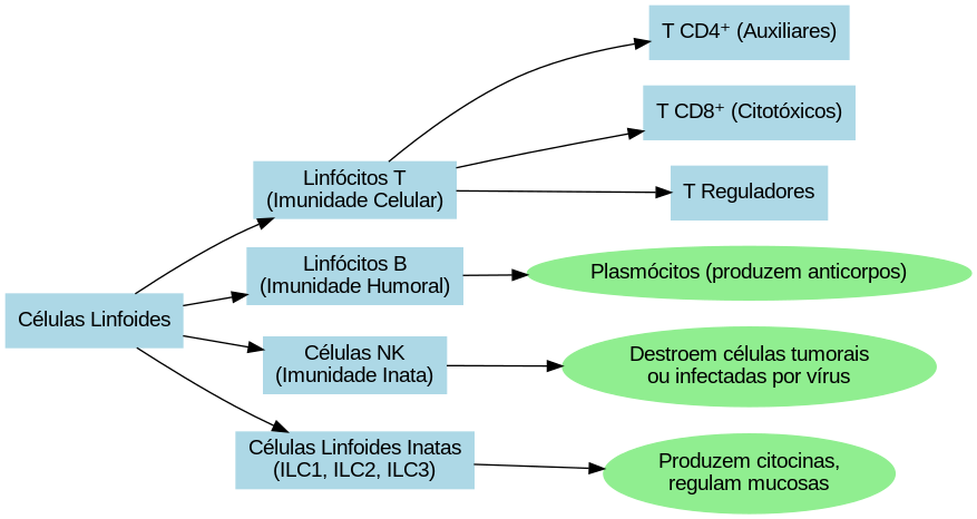 T CD8+ (Citotóxicos) Linfócitos T (Imunidade Celular) T Reguladores Linfócitos B Plasmócitos (produzem anticorpos) (Imunidade Humoral) Células Linfoides Células NK Destroem células tumorais (Imunidade Inata) ou infectadas por vírus Células Linfoides Inatas (ILC1, ILC2, ILC3) Produzem citocinas, regulam mucosas