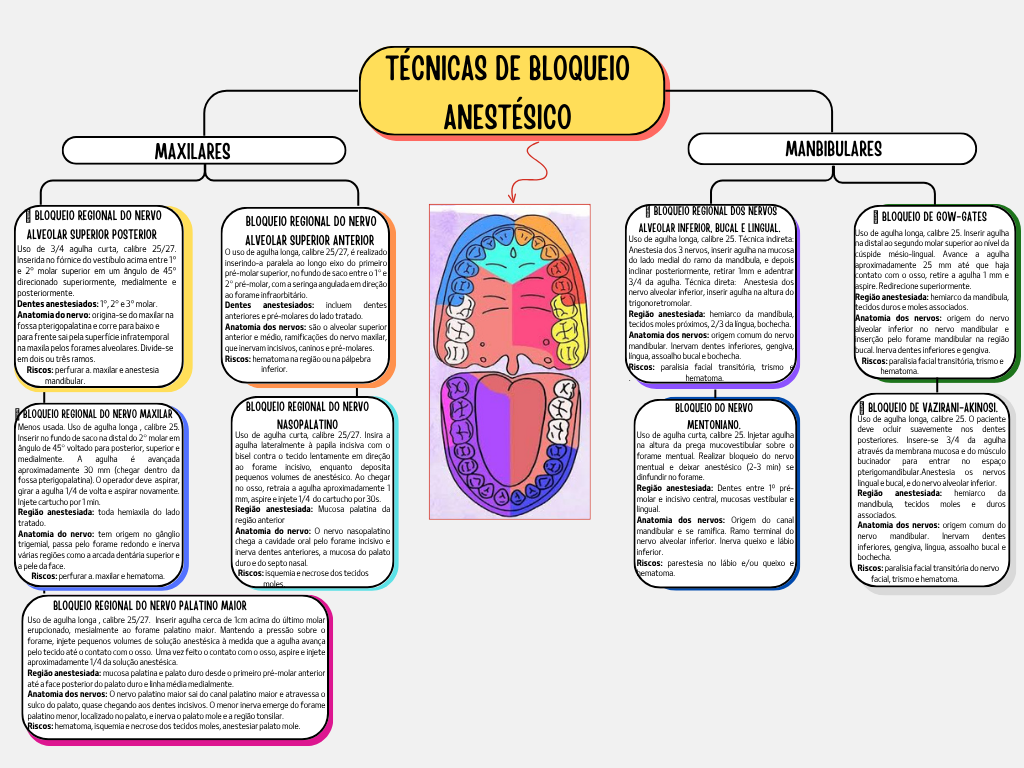 TÉCNICAS DE BLOQUEIO ANESTÉSICO MAXILARES MANBIBULARES BLOQUEIO REGIONAL NERVO BLOQUEIO REGIONAL DOS NERVOS BLOQUEIO REGIONAL DO NERVO BLOQUEIO DE GOW-GATES ALVEOLAR BUCAL E LINGUAL. ALVEOLAR SUPERIOR POSTERIOR Uso de longa, Inserir ALVEOLAR SUPERIOR ANTERIOR Uso de agulha longa, calibre 25. Técnica indireta ao segundo molar superior ao da Uso de 3/4 agulha curta, calibre 25/27 uso de agulha longa, calbre realizado Anestesia dos 3 nervos, inserir aquiha na mucosa Avance a Inserida no fórnice do vestibulo acima entre inserindo-a paralela ao longo eixo do primeiro do lado medial do ramo da e depois 25 mm até que haja e molar superior em um de é-molar no fundo de saco entre indinar posteriormente, retirar e adentrar contato com retire agulha mm e direcionado superiormente, medialmente pré-molar coma seringa em direção 3/4 da Técnica direta: Anestesia dos aspire superiormente posteriormente ao forame nervo alveolar inferior, inserir agulha na altura do Região da Dentes anestesiados: Dentes anestesiados: incluem dentes moles Anatomia do origina-se do na anteriores pré-molares do lado Região anestesiada: da Anatomia dos nervos: origem do nervo fossa e corre para e Anatomia dos nervos: são alveolar superior 2/3 da bochecha alveolar inferior no nervo mandibular e frente pela superficie infratemporal anterior do nervo Anatomia dos nervos: origem comum do nervo pelo forame mandibular na região na maxila pelos for alveolares Divide-se que caninos Inervam dentes bucal Inerva dentes inferiores em ou três Riscos: hematoma na região ou na assoalho bucal bochecha Riscos: paralisia facial transitória, trismo maxilar anestesia Riscos: paralisia facial trismo hematoma mandibular hematoma BLOQUEIO REGIONAL DO NERVO BLOQUEIO NERVO BL LOQUEIO DE VAZIRANI-AKINOSI BLOQUEIO REGIONAL DO NERVO MAXILAR Menos usada Uso de agulha longa calibre NASOPALATINO Uso de aguiha 25. 0 paciente deve ocluir suavemente nos dentes Inserir no fundo de saco na do molar em Uso de agulha curta calibre 25/27. Insira a Uso de agulha calbre 25 Injetar aquiha Insere-se 3/4 da agulha de voltado para posterior, superior e agulha lateralmente papila com na altura da prega mucovestibular sobre através da membrana mucosa do medialmente A agulha é bisel contra 0 tecido lentamente em direção forame mentual Realizar bloquelo do nervo bucinador para entrar no espaço aproximadamente 30 mm (chegar dentro da ao forame incisivo, enquanto deposita mentual anestésico (2-3 min) se fossa 0 operador deve aspirar, pequenos volumes de Ao dinfundir no forame 05 nervos girar agulha 1/4 de volta aspirar novamente no retraia agulha aproximadamente Região anestesiada: Dentes entre linquale Região anestesiada: hemiarco da Injete por min mm aspire einjete 1/4 do cartucho por 30s molar central, mucosas vestibular e tecidos moles e duros Região anestesiada: toda hemiaxila do lado Região anestesiada: Mucosa palatina da lingual associados anterior Anatomia dos nervos: Origem do canal Anatomia dos nervos: origem comum do Anatomia do nervo: origem no Anatomia do 0 nervo nasopalatino mandibular e se Ramo terminal do nervo mandibular dentes passa pelo forame redondo e inerva chega cavidade oral pelo forame incisivo e nervo alveolar Inerva queixo e várias regiões como aarcada dentária superior inerva dentes anteriores, a mucosa do palato gengiva, lingua, bucal e pele face do septo nasal Riscos: parestesia no e/ou queixo e Riscos paralisia facial transitória do nervo Riscos: perfurar a maxilar e hematoma Riscos: isquemia e necrose dos tecidos facial, trismo hematoma moles BLOQUEIO REGIONAL DO NERVO PALATINO MAIOR Uso de agulha longa calibre 25/27. Inserir cerca de acima do molar erupcionado, mesialmente ao forame palatino Mantendo a pressão sobre forame, injete pequenos volumes de solução anestésica à medida que agulha avanca pelo tecido até contato com Uma vez feito contato com 0550 aspire injete aproximadamente 1/4 da solução Região anestesiada: mucosa palatina palato desde pré-molar anterior até posterior do palato duro média medialmente Anatomia dos nervos: 0 nervo palatino sal do canal palatino maior do palato, quase chegando aos dentes 0 menor inerva emerge do forame localizado no palato e palato mole região hematoma isquemia e rose dos tecidos palato