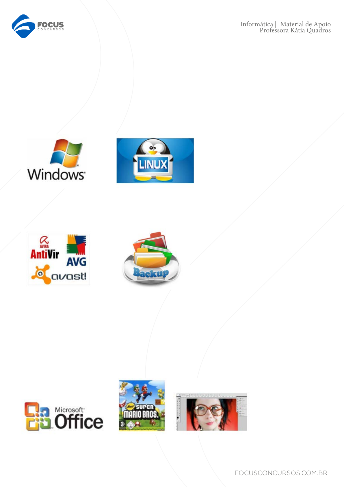 FOCUSCONCURSOS.COM.BR Informática | Material de Apoio Professora Kátia Quadros Software Software, logiciário ou suporte lógico é uma sequência de instruções a serem seguidas e/ou executadas, na manipulação, redirecionamento ou modificação de um dado/informação ou acontecimento. Classificação SISTEMAS OPERACIONAIS Um sistema operacional (SO) é uma coleção de programas que inicializam o hardware do computador. Fornece rotinas básicas para controle de dispositivos. Fornece gerência, escalonamento e interação de tarefas. Mantém a integridade de sistema. Dois exemplos bastante con hecidos do nosso público são o Windows e o Linux. Software Utilitário São softwares de menor porte com funções mais especificas tipo: Verificação de Disco, Cópias de Segurança entre outros. Estão relacionados à manutenção do computador. Software Aplicativo Neste tipo de software se enquadram todos aqueles programas que são utilizados na execução de tarefas específicas. Posso citar vários exemplos mas os mais comuns são os processadores de texto, como o Word, que servem para trabalhar com os mais diversos tipos de textos, emitir etiquetas, e fazer formulários, as planilhas eletrônicas como o Excel são poderosas ferramentas de cálculos que facilitam tanto aquele trabalho árduo de matemática, fazer gráficos com real representação dos dados é uma coisa muito boa pra quem precisa e por último o que muitos usam mas não sabem o nome ao certo que são os Browsers ou Navegadores, softwares usados para navegar na Web, dentre eles os mais conhecidos atualmente são: Windows Internet Explorer, Firefox, Google Chrome, Opera e Safári. Linguagem De Programação (Ou Ferramentas De Programação) 1 FOCUSCONCURSOS.COM.BR Informática | Material de Apoio Professora Kátia Quadros Este tem como finalidade o desenvolvimento de outros programas e sistemas de uso genérico. Utilizando este tipo de software um programador pode desenvolver sistemas como: Sistemas Contábeis, Administração de Empresas, Controle de Estoque/Venda/Compra etc. Licenças A maioria dos softwares são publicado sob uma licença de software. Essa licença define e até restringe qual a forma que se pode utilizar o software definindo números de licenças, modificações entre outros. Exemplos de licenças: Código Aberto (Open Source) Softwares que têm seu código fonte aberto. Qualquer um pode baixar o código fonte do programa, estudá-lo ou mesmo aperfeiçoá-lo. Software Livre Segundo a Free Software Foundation (Fundação para o Software Livre), é considerado livre qualquer programa que pode ser copiado, usado, modificado e redistribuído de acordo com as necessidades de cada usuário. Em outras palavras, o Software é considerado livre quando atende a esses quatro tipos de liberdades definidas pela fundação. Nada impede que um desenvolvedor cobre pelas modificações feitas, pois há custos como em qualquer outra atividade, porém a diferença está na filosofia do Software Livre, a qual visa o espírito de liberdade e não o lucro. GNU: General Public License (Licença Pública Geral), GNU GPL ou simplesmente GPL, é a designação da licença para software livre. Em termos gerais, a GPL baseia-se em 4 liberdades: A liberdade de executar o programa, para qualquer propósito. A liberdade de estudar como o programa funciona e adaptá-lo para as suas necessidades. A liberdade de redistribuir cópias de modo que você possa ajudar ao seu próximo. A liberdade de aperfeiçoar o programa, e liberar os seus aperfeiçoamentos, de modo que toda a comunidade se beneficie deles. Software proprietário Ou não livre é aquele cuja cópia, redistribuição ou modificação são em alguma medida proibidos pelo seu criador ou distribuidor. A expressão foi cunhada em oposição ao conceito de software livre. Normalmente, a fim de que se possa 2 FOCUSCONCURSOS.COM.BR Informática | Material de Apoio Professora Kátia Quadros utilizar, copiar, ter acesso ao código-fonte ou redistribuir, deve-se solicitar permissão ao proprietário, ou pagar para poder fazê-lo: será necessário, portanto, adquirir uma licença, tradicionalmente onerosa, para cada uma destas ações. Software gratuito ou freeware É qualquer programa de computador cuja utilização não implica o pagamento de licenças de uso ou royalties. É importante não confundir o free de freeware com o free de free software, pois no primeiro uso o significado é de gratuito, e no segundo de livre. Um programa licenciado como freeware não é necessariamente um software livre, pode não ter código aberto e pode acompanhar licenças restritivas, limitando o uso comercial, a redistribuição não autorizada, a modificação não autorizada ou outros tipos de restrições. Shareware É um programa de computador disponibilizado gratuitamente, porém com algum tipo de limitação. Sharewares geralmente possuem funcionalidades limitadas e/ou tempo de uso gratuito do software limitado, após o fim do qual o usuário é requisitado a pagar para acessar a funcionalidade completa ou poder continuar utilizando o programa. Um shareware está protegido por direitos autorais. Esse tipo de distribuição tem como objetivo comum divulgar o software, assim os usuários podem testá-lo antes da aquisição. Baseadas nas limitações, podemos encontrar duas sub-categorias principais (FAURI, 2009): Trial – Os programas oferecem todos os seus recursos, mas por um tempo limitado (geralmente de 15 a 30 dias); Demo – Alguns recursos estão completos, sendo necessário pagar para usufruir dos restantes. Os jogos geralmente são divulgados sob essa licença. Compactador de Arquivos Compactadores de arquivos são softwares especializados em gerar uma representação mais eficiente de vários arquivos dentro de um único arquivo de modo que ocupem menos espaço na mídia de armazenamento ou o tempo de transferência deles sobre uma rede seja reduzido. 3 FOCUSCONCURSOS.COM.BR In
