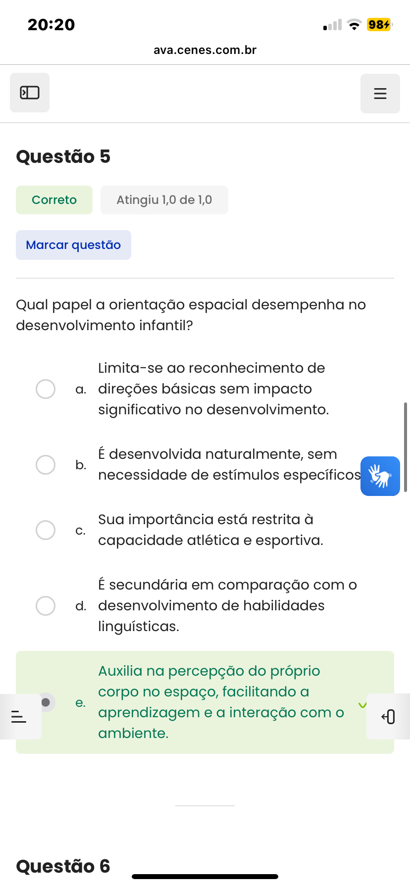 20:20 984 ava.cenes.com.br Questão 5 Correto Atingiu 1,0 de 1,0 Marcar questão Qual papel a orientação espacial desempenha no desenvolvimento infantil? Limita-se ao reconhecimento de a. direções básicas sem impacto significativo no desenvolvimento. É desenvolvida naturalmente, sem b. necessidade de estímulos específicos Sua importância está restrita à C. capacidade atlética e esportiva. É secundária em comparação com o d. desenvolvimento de habilidades linguísticas. Auxilia na percepção do próprio corpo no espaço, facilitando a e. aprendizagem e a interação com
