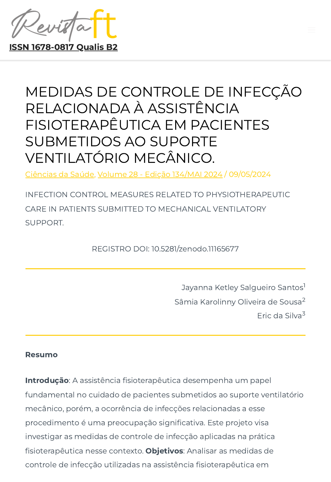 MEDIDAS DE CONTROLE DE INFECÇÃO RELACIONADA À ASSISTÊNCIA FISIOTERAPÊUTICA EM PACIENTES SUBMETIDOS AO SUPORTE VENTILATÓRIO MECÂNICO. Ciências da Saúde, Volume 28 - Edição 134/MAI 2024 / 09/05/2024 INFECTION CONTROL MEASURES RELATED TO PHYSIOTHERAPEUTIC CARE IN PATIENTS SUBMITTED TO MECHANICAL VENTILATORY SUPPORT. REGISTRO DOI: 10.5281/zenodo.11165677 Jayanna Ketley Salgueiro Santos Sâmia Karolinny Oliveira de Sousa Eric da Silva Resumo Introdução: A assistência �sioterapêutica desempenha um papel fundamental no cuidado de pacientes submetidos ao suporte ventilatório mecânico, porém, a ocorrência de infecções relacionadas a esse procedimento é uma preocupação signi�cativa. Este projeto visa investigar as medidas de controle de infecção aplicadas na prática �sioterapêutica nesse contexto. Objetivos: Analisar as medidas de controle de infecção utilizadas na assistência �sioterapêutica em 1 2 3 ISSN 1678-0817 Qualis B2 https://revistaft.com.br/category/ciencias-da-saude/ https://revistaft.com.br/category/edicao134/ https://revistaft.com.br/ https://revistaft.com.br/ https://revistaft.com.br/ pacientes sob suporte ventilatório mecânico. Identi�car as práticas recomendadas na literatura para prevenir infecções relacionadas à assistência �sioterapêutica em pacientes em ventilação mecânica. Métodos: A pesquisa terá natureza qualitativa e será conduzida por meio de revisão bibliográ�ca sistemática. Serão realizadas buscas em bases de dados eletrônicas utilizando termos relacionados ao tema. Serão incluídos estudos que abordem medidas de controle de infecção em pacientes submetidos ao suporte ventilatório mecânico e assistência �sioterapêutica. O processo de seleção dos estudos será conduzido de acordo com os critérios do PRISMA para estudos randomizados. A análise dos dados será realizada por meio da síntese qualitativa dos resultados encontrados na literatura. Resultados Esperados: Espera-se identi�car as principais medidas de controle de infecção recomendadas para a prática �sioterapêutica em pacientes sob suporte ventilatório mecânico. Além disso, espera-se contribuir para a melhoria das práticas clínicas, fornecendo evidências que possam embasar diretrizes e protocolos de prevenção de infecções relacionadas à assistência �sioterapêutica nesse contexto. Palavras-chave: Controle de Infecção; Usuários de Ventilador Mecânico; Per�l do Fisioterapeuta Hospitalar; Medidas de saúde; Impactos do Fisioterapia Hospitalar. Abstract Introduction: Physical therapy plays a key role in the care of patients undergoing mechanical ventilatory support, however, the occurrence of infections related to this procedure is a signi�cant concern. This project aims to investigate the infection control measures applied in physiotherapeutic practice in this context. Objectives: To analyze the infection control measures used in physiotherapeutic care in patients under mechanical ventilatory support. To identify the best practices in the literature to prevent infections related to physical therapy in patients on mechanical ventilation. Methods: The research will be qualitative and will be conducted through systematic literature review. Electronic databases will be searched using terms related to the theme. Studies addressing infection control measures in patients undergoing mechanical ventilatory support and physiotherapeutic assistance will be included. The selection process of the studies will be conducted according to the criteria of PRISMA for randomized studies. The data analysis will be performed through the qualitative synthesis of the results found in the literature. Expected Results: It is expected to identify the main measures of infection control recommended for physiotherapeutic practice in patients under mechanical ventilatory support. In addition, it is expected to contribute to the improvement of clinical practices, providing evidence that can support guidelines and protocols for the prevention of infections related to physical therapy in this context. Keywords: Infection Control; Ventilator Users; Hospital Physiotherapist Pro�le; Health Measures; Impacts of Hospital Physiotherapy. 1. Introdução A segurança do paciente é uma questão primordial no âmbito hospitalar, e as infecções relacionadas à assistência à saúde representam uma ameaça signi�cativa para a qualidade e a e�cácia do cuidado prestado (WHO, 2021). A disseminação de agentes infecciosos no ambiente hospitalar é um desa�o complexo que exige medidas rigorosas de controle de infecção. Para garantir a segurança dos pacientes e dos pro�ssionais de saúde, é essencial que todas as categorias pro�ssionais estejam bem-informadas e adotem práticas adequadas (CDC, 2020). A Infecção Relacionada à Assistência à Saúde (IRAS) é uma preocupação de saúde global, associada a elevados custos econômicos e, o que é ainda mais crítico, a sérios riscos para os pacientes. Em um ambiente hospitalar, onde pacientes frequentemente apresentam sistemas imunológicos comprometidos, a disseminação de infecções pode resultar em complicações graves e até mesmo em óbito. A atuação dos �sioterapeutas em ambientes hospitalares desempenha um papel crucial na reabilitação e tratamento de pacientes (Chang et al., 2019). Eles frequentemente interagem com pacientes em estado crítico e, portanto, devem ser conscientes das práticas que reduzem os riscos de infecções relacionadas à assistência à saúde. As medidas de controle de infecção incluem práticas como higiene das mãos, uso adequado de equipamentos de proteção individual e a manutenção de ambientes limpos e seguros (Houghton et al., 2018). A e�cácia dessas medidas depende da compreensão e aplicação correta por parte dos �sioterapeutas. O contexto atual da saúde global, marcado por surtos de doenças infecciosas, realça ainda mais a imp