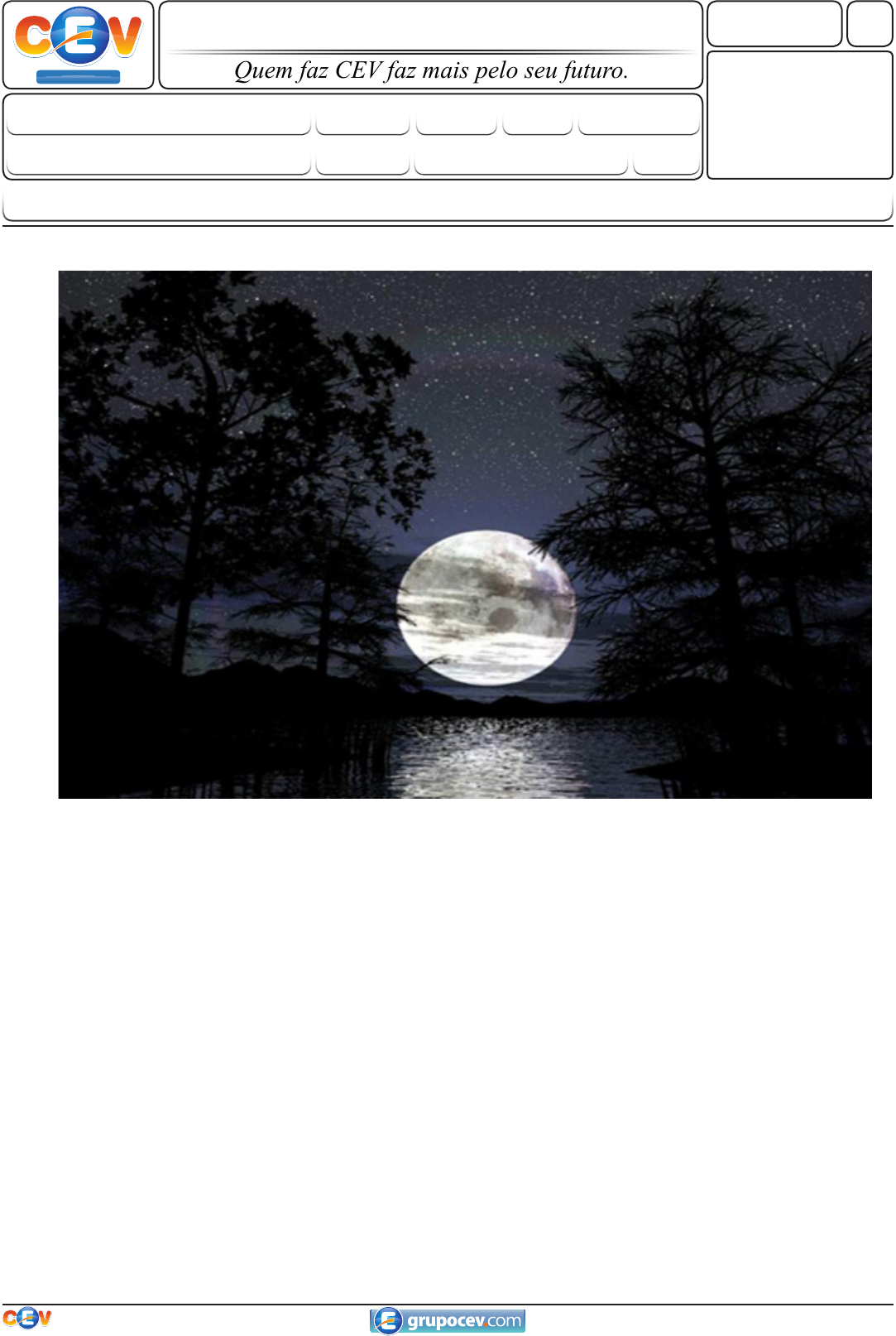 Quem faz CEV faz mais pelo seu futuro.Grupo Educacional Data 1 S.Alencar Grupo Educacional CEV Colégio - 2016 Aluno(a): “Sonhos sem disciplina produzem pessoas frustradas, e disciplina sem sonhos produz pessoas autômatas, que só sabem obedecer a ordens”. Augusto Cury Professor Disciplina Série Turma TurnoGrau Prova Avaliação Tipo THE MYSTERIES OF THE MOON The moon has attracted man’s attention since the beginning of the civilization. Ancient Greeks discovered the influence of the moon upon the tides. Poets have looked at the moon with romantic eyes. Space scientists have not only studied it with their telescopes, but have also sent astronauts there. Nobody however, has found out all the answers to the mysteries of the moon. The origin of moon craters, for example is still obscure. According to one theory, thousands of meteors have crashed against the surface of the moon. The impact of these crashes has formed the craters. They are pits and depressions on the lunar surface. They have many sizes and forms. Some scientists have tried to prove this theory with plaster. They have dropped objects into wet plaster, trying to reproduce the formation of craters. Unfortunately, they have not been suc- cessful. According to other theories, the craters have appeared because of eruption either of gas or lava. En- glish physicist Robert Hook said, “The craters are the solidified residues of enormous bubbles”. This dispute has not ended yet. It has been very difficult to prove these theories. Scientists have al- ready progressed a lot, but poets can be glad – the moon is still a romantic mystery to man. Inglês Mensal Manhã 19/03/2016 a 8º ano P1 e.F Grupo Educacional 2 AssinAturA: Grupo Educacional Colégio S.Alencar nota da Questão 0,0 0,2 0,4 0,6 0,8 1,0 1,2 1,4 1,6 1,8 2,0 CaMPo De Uso exclusIvo do (a) ProFessor (a) 1. Answer the questions in Portuguese. Find the answers in the text. A) Uma teoria diz que milhares de meteoros trombaram na superfície da Lua e que o impacto dessas “trom- badas” formou as crateras. O que são as crateras? B) Por que alguns cientistas deixavam cair objetos em gesso úmido? nota da Questão 0,0 0,2 0,4 0,6 0,8 1,0 1,2 1,4 1,6 1,8 2,0 CaMPo De Uso exclusIvo do (a) ProFessor (a) 2. There are some mistakes in some sentences about the text above. Underline and correct them: A) The moon appeared because of eruptions of gas or lava. B) Astronauts went to the moon. C) The moon influences the tides. D) Space scientists consider the moon a romantic mystery. nota da Questão 0,0 0,2 0,4 0,6 0,8 1,0 1,2 1,4 1,6 1,8 2,0 CaMPo De Uso exclusIvo do (a) ProFessor (a) 3. Answer the questions according to the text in English: A) Who discovered the influence of the moon upon the tides? B) Is the origin of the moon craters clear? C) What does Robert Hook’s theory say? D) What are moon craters? Colégio 3 Grupo Educacional Grupo Educacional S.Alencar AssinAturA: nota da Questão 0,0 0,2 0,4 0,6 0,8 1,0 1,2 1,4 1,6 1,8 2,0 CaMPo De Uso exclusIvo do (a) ProFessor (a) 4. Complete the text. Use the verbs in parentheses in the Present Progressive. From the top of the hill I can see the village in th valley: the houses, the streets, the school, everything. The children _________________ (play) in the school yard. Mr. Gardner _________________(to talk) to a friend). Some ladies_______________(walk) to the church. Some people _________________ (run) around the lake. The Taylors _______________ (open) their store now and Mrs. Swanson ____ certainly ____________ (buy) some bread for breakfast. It is 8:00 now and the sun ________________ ( shine) brightly. I am here on the top of the hill. I _________________ ( think) about my life!! nota da Questão 0,0 0,2 0,4 0,6 0,8 1,0 1,2 1,4 1,6 1,8 2,0 CaMPo De Uso exclusIvo do (a) ProFessor (a) 5. Complete this paragraph about the routine of a V.J in São Paulo using the Simple Present of the verbs given below: LIVE – WORK (2X) – ARRIVE (2X) – LEAVE – SLEEP – WAKE – EAT – VISIT – TAKE Carlos __________ in São Paulo and _____________ for a TV station. He _______________ at work at mid- night and __________________ all night. He ________________ work at 7:00 am. He __________________ home at around 7:45 am. He ________________ a sandwich and then ________________ from (9:00 am to 4:00 pm. When he _______________ up, he ___________________ a shower and sometimes ______________ his friends. nota da Questão 0,0 0,2 0,4 0,6 0,8 1,0 1,2 1,4 1,6 1,8 2,0 CaMPo De Uso exclusIvo do (a) ProFessor (a) QUESTÃO EXTRA COMICS THE MARVEL CATALOG Grupo Educacional 4 AssinAturA: Grupo Educacional Colégio S.Alencar THE X-MEN # 173: The Story Bizarre Love triangle Gambit and Rogue’s tumultuous relationship reaches its ultimate breaking point! Will Gambit give in to his desires and find love in the arms of another woman? Also, X-Men consider a new member – one of their greatest foes of all time! Part 3(of 3). . 32 pgs/T+ (suggested for teens and Up) $2,50. In stores: 07-27-2005. X-MEN: THE END – HEROES AND MARTYRS #4: The story Things fall apart and the center cannot hold... as the jaw-dropping true secret of Sinister is revealed! . 32pgs./T+(suggested for teens and Up) $2.99. In stores: 06-08-2005. PHOENIX – ENDSONG #1-5 The story The mysterious and powerful Phoenix Force is life incarnate, and yet it consumes whole worlds in a moment. Its long history with the X-Men is fraught with tragedy... especially concerning one of the most beloved of their number, Jean Grey. What will happen when the Phoenix returns to Earth in search of the one mortal who could ever contain its power... only to find her dead? . 120 pgs./T+ (suggested for teens and Up) $ 19.99. In stores: 06-29-2005. Encontre no texto as informações pedidas. Dê respostas completas. A) Quanto custa a PHOENIX – ENDSONG ? B) Quanto você pagaria pelos 3 gibis? C) Qual a data que X-Men: The End – Heroes and Martyrs #4 estará disponível para a compra? D) Quantas p