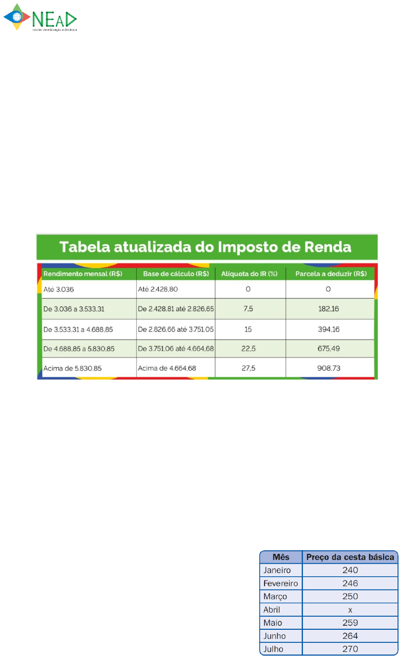 UNIVERSIDADE FEDERA RURAL DO SEMI-ÁRIDO – UFERSA NÚCLEO DE EDUCAÇÃO À DISTÂNCIA – NEaD Tópicos Fundamentais de Matemática – 2025.1 Prof. Antonio Diego Silva Farias TERCEIRA ATIVIDADE ON-LINE NOME: _________________________________________ POLO: ______________ 1. Três sócios, A, B e C, investiram R$ 80.000,00, R$ 90.000,00 e R$ 120.000,00, respectivamente, na construção de uma casa. A casa foi vendida por R$ 360.000,00. Quanto coube a cada sócio, se cada um recebeu uma quantia diretamente proporcional ao valor que investiu? 2. Em maio de 2025, vigora no Brasil a seguinte tabela para o cálculo do imposto de renda sobre os salários: a. Qual o imposto de renda de quem ganha um salário mensal de R$ 2.000,00? b. Qual o imposto de renda de quem ganha um salário mensal de R$ 2.500,00? c. Qual o imposto de renda de quem ganha um salário mensal de R$ 4.000,00? d. Qual o imposto de renda de quem ganha um salário mensal de R$ 5.000,00? e. Explique o significado da parcela de R$ 182,16 a deduzir. 3. A tabela abaixo fornece os preços de uma cesta básica de janeiro a julho de certo ano. a. Qual a taxa de inflação de fevereiro, março, junho e julho? b. Qual o valor de x para que a taxa de inflação de abril seja 1,5%? c. Qual o valor de x para que a taxa de inflação de maio seja 1%? 4. Num período em que a taxa de inflação é de 100%, qual a perda do poder aquisitivo da moeda? 5. Um investidor norte-americano traz para o Brasil 50 000 dólares; faz a conversão de dólares para reais; aplica os reais por um ano à taxa de 18% ao ano, e no resgate converte os reais recebidos para dólares e os envia para os Estados Unidos. No dia da aplicação, um dólar valia R$ 1,10 e, um ano depois, na data do resgate, um dólar valia R$ 1,20. a. Qual a taxa de rendimento dessa aplicação, considerando os valores expressos em dólares? b. Quanto deveria valer um dólar na data de resgate (um ano após a aplicação) para que a taxa de rendimento em dólares tivesse sido de 12% ao ano? 6. Roberto pretende comprar um carro usado cujo preço é R$ 12 000,00 para pagamento daqui a 4 meses. Se ele conseguir aplicar seu dinheiro a juros simples e à taxa de 2% a.m.: a. Quanto deverá aplicar no ato da compra para fazer frente ao pagamento? b. Se o preço para pagamento à vista for R$ 11 200,00, é melhor ele pagar à vista ou a prazo? 7. Um investidor aplicou R$ 12 000,00 a juros compostos, durante 2 anos, à taxa de 1,5% a.m. Qual o valor dos juros recebidos? Considerando o valor de juros recebidos o mesmo do item anterior, e o regime de juros simples, qual seria a taxa mensal com o mesmo prazo de aplicação? 8. Um capital de R$ 4 000,00 foi aplicado a juros compostos à taxa de 25% a.a. Calcule o montante, considerando cada um dos seguintes prazos de aplicação: a. 90 dias b. 1 mês c. 120 dias 9. Uma televisão é vendida à vista por R$ 900,00 ou a prazo em 3 prestações mensais de R$ 305,00 cada uma. A primeira prestação vence um mês após a compra. Qual a melhor alternativa de pagamento para um comprador que aplica seu dinheiro a juros compostos, se a taxa for: a. 1,5% a.m. b. 0,5% a.m. 10. Um microcomputador é encontrado à venda em duas condições de pagamento: a. Em 3 prestações mensais de R$ 1 024,00 cada uma, sem entrada; b. Em 4 prestações mensais de R$ 778,00 cada uma, sem entrada. Qual a melhor alternativa de pagamento para um comprador que aplica seu dinheiro a juros compostos à taxa de 1% a.m.? 11. Um automóvel 0 km é vendido à vista por R$ 32 000,00 ou a prazo com 20% de entrada mais 24 prestações mensais iguais. Qual o valor de cada prestação se a taxa de juros compostos do financiamento for de 1,8% a.m.? 12. Num país sem inflação, o sr. Olavo recebeu $ 100 000,00 de prêmio em uma loteria. Se ele aplicar esse valor num fundo que rende juros compostos à taxa de 0,5% a.m. e sacar $ 1 000,00 por mês (começando 1 mês após o depósito), durante quantos meses aproximadamente ele poderá efetuar os saques até esgotar seu saldo? Qual seria a resposta se ele sacasse $ 2 000,00 por mês?