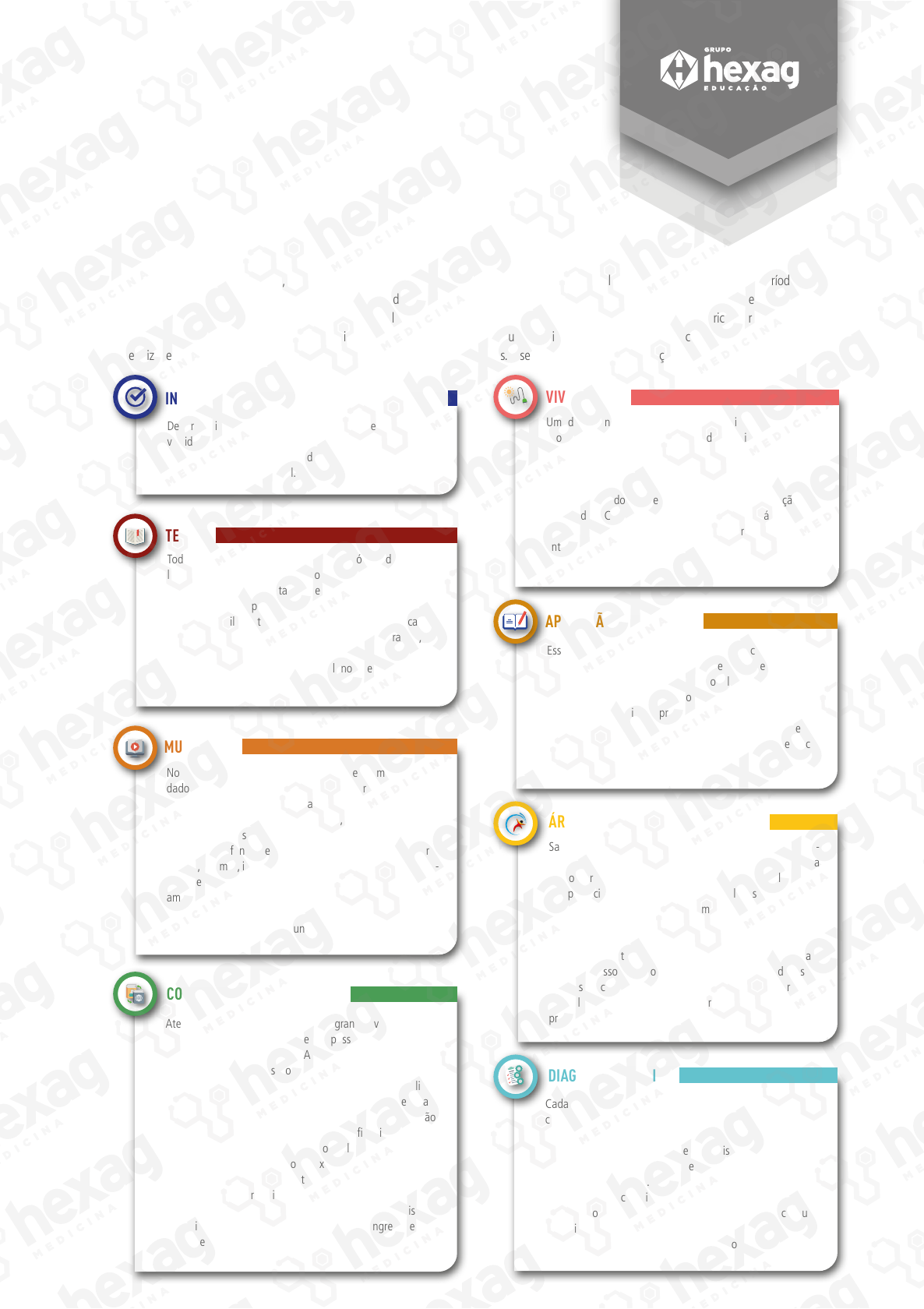 Caro aluno Ao elaborar o seu material inovador, completo e moderno, o Hexag considerou como principal diferencial sua exclusiva metodologia em período integral, com aulas e Estudo Orientado (E.O.), e seu plantão de dúvidas personalizado. O material didático é composto por 6 cadernos de aula e 107 livros, totali- zando uma coleção com 113 exemplares. O conteúdo dos livros é organizado por aulas temáticas. Cada assunto contém uma rica teoria que contempla, de forma objetiva e transversal, as reais necessidades dos alunos, dispensando qualquer tipo de material alternativo complementar. Para melhorar a aprendizagem, as aulas possuem seções específicas com determinadas finalidades. A seguir, apresentamos cada seção: De forma simples, resumida e dinâmica, essa seção foi desen- volvida para sinalizar os assuntos mais abordados no Enem e nos principais vestibulares voltados para o curso de Medicina em todo o território nacional. INCIDÊNCIA DO TEMA NAS PRINCIPAIS PROVAS Todo o desenvolvimento dos conteúdos teóricos de cada co- leção tem como principal objetivo apoiar o aluno na resolu- ção das questões propostas. Os textos dos livros são de fácil compreensão, completos e organizados. Além disso, contam com imagens ilustrativas que complementam as explicações dadas em sala de aula. Quadros, mapas e organogramas, em cores nítidas, também são usados e compõem um conjunto abrangente de informações para o aluno que vai se dedicar à rotina intensa de estudos. TEORIA No decorrer das teorias apresentadas, oferecemos uma cui- dadosa seleção de conteúdos multimídia para complementar o repertório do aluno, apresentada em boxes para facilitar a compreensão, com indicação de vídeos, sites, filmes, músicas, livros, etc. Tudo isso é encontrado em subcategorias que fa- cilitam o aprofundamento nos temas estudados – há obras de arte, poemas, imagens, artigos e até sugestões de aplicati- vos que facilitam os estudos, com conteúdos essenciais para ampliar as habilidades de análise e reflexão crítica, em uma seleção realizada com finos critérios para apurar ainda mais o conhecimento do nosso aluno. MULTIMÍDIA Atento às constantes mudanças dos grandes vestibulares, é elaborada, a cada aula e sempre que possível, uma seção que trata de interdisciplinaridade. As questões dos vestibulares atuais não exigem mais dos candidatos apenas o puro co- nhecimento dos conteúdos de cada área, de cada disciplina. Atualmente há muitas perguntas interdisciplinares que abran- gem conteúdos de diferentes áreas em uma mesma questão, como Biologia e Química, História e Geografia, Biologia e Ma- temática, entre outras. Nesse espaço, o aluno inicia o contato com essa realidade por meio de explicações que relacionam a aula do dia com aulas de outras disciplinas e conteúdos de outros livros, sempre utilizando temas da atualidade. Assim, o aluno consegue entender que cada disciplina não existe de forma isolada, mas faz parte de uma grande engrenagem no mundo em que ele vive. CONEXÃO ENTRE DISCIPLINAS Um dos grandes problemas do conhecimento acadêmico é o seu distanciamento da realidade cotidiana, o que difi- culta a compreensão de determinados conceitos e impede o aprofundamento nos temas para além da superficial me- morização de fórmulas ou regras. Para evitar bloqueios na aprendizagem dos conteúdos, foi desenvolvida a seção “Vi- venciando“. Como o próprio nome já aponta, há uma preo- cupação em levar aos nossos alunos a clareza das relações entre aquilo que eles aprendem e aquilo com que eles têm contato em seu dia a dia. VIVENCIANDO Essa seção foi desenvolvida com foco nas disciplinas que fa- zem parte das Ciências da Natureza e da Matemática. Nos compilados, deparamos-nos com modelos de exercícios re- solvidos e comentados, fazendo com que aquilo que pareça abstrato e de difícil compreensão torne-se mais acessível e de bom entendimento aos olhos do aluno. Por meio dessas resoluções, é possível rever, a qualquer momento, as explica- ções dadas em sala de aula. APLICAÇÃO DO CONTEÚDO Sabendo que o Enem tem o objetivo de avaliar o desem- penho ao fim da escolaridade básica, organizamos essa seção para que o aluno conheça as diversas habilidades e competências abordadas na prova. Os livros da “Coleção Vestibulares de Medicina” contêm, a cada aula, algumas dessas habilidades. No compilado “Áreas de Conhecimento do Enem” há modelos de exercícios que não são apenas resolvidos, mas também analisados de maneira expositiva e descritos passo a passo à luz das habilidades estudadas no dia. Esse recurso constrói para o estudante um roteiro para ajudá-lo a apurar as questões na prática, a identificá-las na prova e a resolvê-las com tranquilidade. ÁREAS DE CONHECIMENTO DO ENEM Cada pessoa tem sua própria forma de aprendizado. Por isso, criamos para os nossos alunos o máximo de recursos para orientá-los em suas trajetórias. Um deles é o ”Diagrama de Ideias”, para aqueles que aprendem visualmente os conte- údos e processos por meio de esquemas cognitivos, mapas mentais e fluxogramas. Além disso, esse compilado é um resumo de todo o conteúdo da aula. Por meio dele, pode-se fazer uma rápida consulta aos principais conteúdos ensinados no dia, o que facilita a organização dos estudos e até a resolução dos exercícios. DIAGRAMA DE IDEIAS © Hexag SiStema de enSino, 2018 Direitos desta edição: Hexag Sistema de Ensino, São Paulo, 2023 Todos os direitos reservados. Coordenador-geral Murilo de Almeida Gonçalves reSponSabilidade editorial, programação viSual, reviSão e peSquiSa iConográfiCa Hexag Editora editoração eletrôniCa Letícia de Brito Matheus Franco da Silveira projeto gráfiCo e Capa Raphael de Souza Motta imagenS Freepik (https://www.freepik.com) Shutterstock (https://www.shutterstock.com) Pixabay (https://www.pixabay.com) iSbn 978-85-9542-262-9 Todas as citações de t