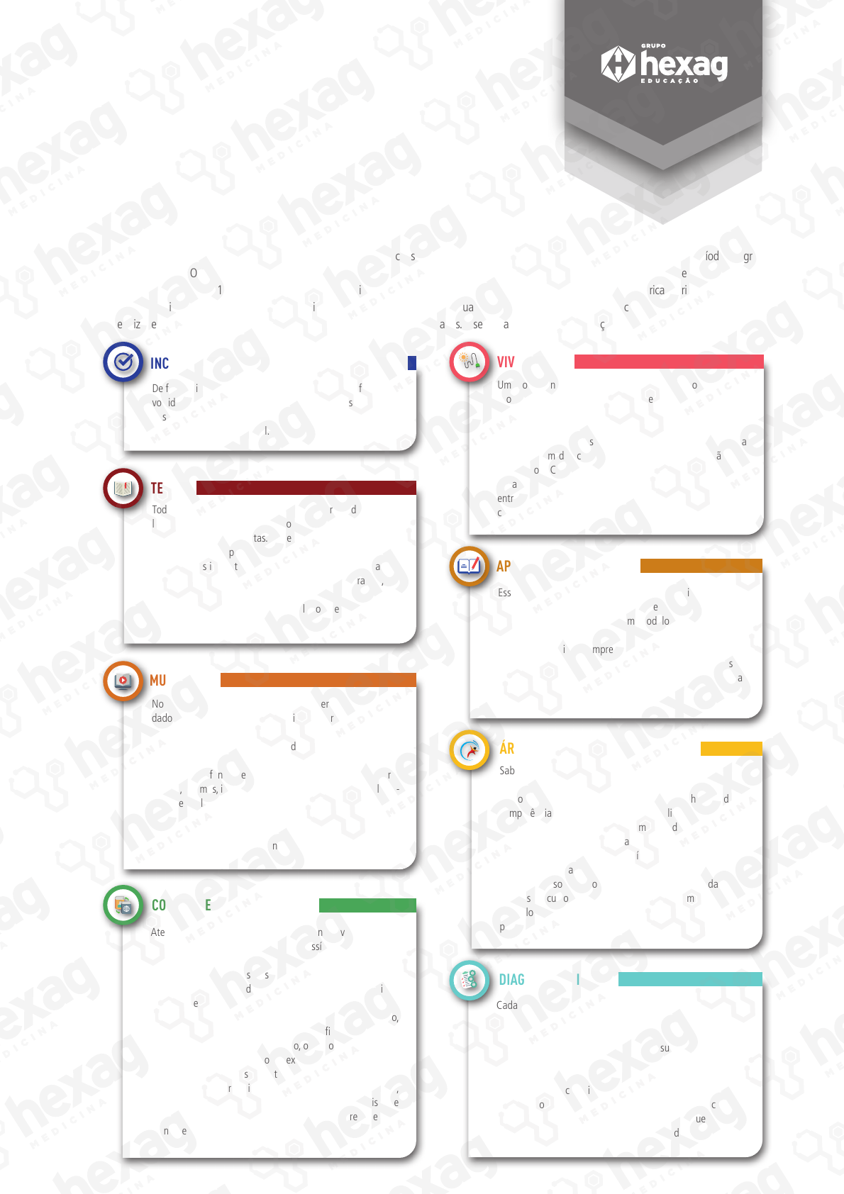 <p>Caro aluno</p><p>Ao elaborar o seu material inovador, completo e moderno, o Hexag considerou como principal diferencial sua exclusiva metodologia em período integral,</p><p>com aulas e Estudo Orientado (E.O.), e seu plantão de dúvidas personalizado. O material didático é composto por 6 cadernos de aula e 107 livros, totali-</p><p>zando uma coleção com 113 exemplares. O conteúdo dos livros é organizado por aulas temáticas. Cada assunto contém uma rica teoria que contempla,</p><p>de forma objetiva e transversal, as reais necessidades dos alunos, dispensando qualquer tipo de material alternativo complementar. Para melhorar a</p><p>aprendizagem, as aulas possuem seções específicas com determinadas finalidades. A seguir, apresentamos cada seção:</p><p>De forma simples, resumida e dinâmica, essa seção foi desen-</p><p>volvida para sinalizar os assuntos mais abordados no Enem e</p><p>nos principais vestibulares voltados para o curso de Medicina</p><p>em todo o território nacional.</p><p>INCIDÊNCIA DO TEMA NAS PRINCIPAIS PROVAS</p><p>Todo o desenvolvimento dos conteúdos teóricos de cada co-</p><p>leção tem como principal objetivo apoiar o aluno na resolu-</p><p>ção das questões propostas. Os textos dos livros são de fácil</p><p>compreensão, completos e organizados. Além disso, contam</p><p>com imagens ilustrativas que complementam as explicações</p><p>dadas em sala de aula. Quadros, mapas e organogramas, em</p><p>cores nítidas, também são usados e compõem um conjunto</p><p>abrangente de informações para o aluno que vai se dedicar</p><p>à rotina intensa de estudos.</p><p>TEORIA</p><p>No decorrer das teorias apresentadas, oferecemos uma cui-</p><p>dadosa seleção de conteúdos multimídia para complementar</p><p>o repertório do aluno, apresentada em boxes para facilitar a</p><p>compreensão, com indicação de vídeos, sites, filmes, músicas,</p><p>livros, etc. Tudo isso é encontrado em subcategorias que fa-</p><p>cilitam o aprofundamento nos temas estudados – há obras</p><p>de arte, poemas, imagens, artigos e até sugestões de aplicati-</p><p>vos que facilitam os estudos, com conteúdos essenciais para</p><p>ampliar as habilidades de análise e reflexão crítica, em uma</p><p>seleção realizada com finos critérios para apurar ainda mais</p><p>o conhecimento do nosso aluno.</p><p>MULTIMÍDIA</p><p>Atento às constantes mudanças dos grandes vestibulares, é</p><p>elaborada, a cada aula e sempre que possível, uma seção que</p><p>trata de interdisciplinaridade. As questões dos vestibulares</p><p>atuais não exigem mais dos candidatos apenas o puro co-</p><p>nhecimento dos conteúdos de cada área, de cada disciplina.</p><p>Atualmente há muitas perguntas interdisciplinares que abran-</p><p>gem conteúdos de diferentes áreas em uma mesma questão,</p><p>como Biologia e Química, História e Geografia, Biologia e Ma-</p><p>temática, entre outras. Nesse espaço, o aluno inicia o contato</p><p>com essa realidade por meio de explicações que relacionam</p><p>a aula do dia com aulas de outras disciplinas e conteúdos de</p><p>outros livros, sempre utilizando temas da atualidade. Assim,</p><p>o aluno consegue entender que cada disciplina não existe de</p><p>forma isolada, mas faz parte de uma grande engrenagem no</p><p>mundo em que ele vive.</p><p>CONEXÃO ENTRE DISCIPLINAS</p><p>Um dos grandes problemas do conhecimento acadêmico</p><p>é o seu distanciamento da realidade cotidiana, o que difi-</p><p>culta a compreensão de determinados conceitos e impede</p><p>o aprofundamento nos temas para além da superficial me-</p><p>morização de fórmulas ou regras. Para evitar bloqueios na</p><p>aprendizagem dos conteúdos, foi desenvolvida a seção “Vi-</p><p>venciando“. Como o próprio nome já aponta, há uma preo-</p><p>cupação em levar aos nossos alunos a clareza das relações</p><p>entre aquilo que eles aprendem e aquilo com que eles têm</p><p>contato em seu dia a dia.</p><p>VIVENCIANDO</p><p>Essa seção foi desenvolvida com foco nas disciplinas que fa-</p><p>zem parte das Ciências da Natureza e da Matemática. Nos</p><p>compilados, deparamos-nos com modelos de exercícios re-</p><p>solvidos e comentados, fazendo com que aquilo que pareça</p><p>abstrato e de difícil compreensão torne-se mais acessível e</p><p>de bom entendimento aos olhos do aluno. Por meio dessas</p><p>resoluções, é possível rever, a qualquer momento, as explica-</p><p>ções dadas em sala de aula.</p><p>APLICAÇÃO DO CONTEÚDO</p><p>Sabendo que o Enem tem o objetivo de avaliar o desem-</p><p>penho ao fim da escolaridade básica, organizamos essa</p><p>seção para que o aluno conheça as diversas habilidades e</p><p>competências abordadas na prova. Os livros da “Coleção</p><p>Vestibulares de Medicina” contêm, a cada aula, algumas</p><p>dessas habilidades. No compilado “Áreas de Conhecimento</p><p>do Enem” há modelos de exercícios que não são apenas</p><p>resolvidos, mas também analisados de maneira expositiva e</p><p>descritos passo a passo à luz das habilidades estudadas no</p><p>dia. Esse recurso constrói para o estudante um roteiro para</p><p>ajudá-lo a apurar as questões na prática, a identificá-las na</p><p>prova e a resolvê-las com tranquilidade.</p><p>ÁREAS DE CONHECIMENTO DO ENEM</p><p>Cada pessoa tem sua própria forma de aprendizado. Por isso,</p><p>criamos para os nossos alunos o máximo de recursos para</p><p>orientá-los em suas trajetórias. Um deles é o ”Diagrama de</p><p>Ideias”, para aqueles que aprendem visualmente os conte-</p><p>údos e processos por meio de esquemas cognitivos, mapas</p><p>mentais e fluxogramas.</p><p>Além disso, esse compilado é um resumo de todo o conteúdo</p><p>da aula. Por meio dele, pode-se fazer uma rápida consulta</p><p>aos principais conteúdos ensinados no dia, o que facilita a</p><p>organização dos estudos e até a resolução dos exercícios.</p><p>DIAGRAMA DE IDEIAS</p><