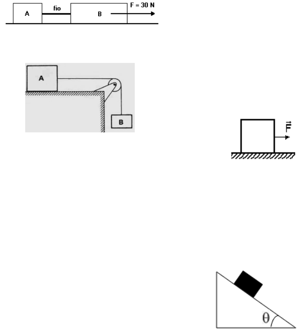 Exercícios de Fixação 1ª série – Capítulos 9 a 11 – Prof. Marcelo Elias 1) Calcule o módulo da força elástica em uma mola de constante k = 20N/m que sofre uma deformação de 50cm. 2) Dois blocos A e B, com massas mA = 5kg e mB = 10kg, são colocados sobre uma superfície plana horizontal (o atrito entre os blocos e a superfície é nulo) e ligados por um fio inextensível e com massa desprezível (conforme a figura a seguir). O bloco B é puxado para a direita por uma força horizontal F com módulo igual a 30N. Nessa situação, determine a aceleração do sistema, as forças que atuam sobre o corpo A e a tração no fio que une os blocos. 3) No esquema abaixo, os blocos A e B tem massas respectivamente iguais a 3,0 kg e 7,0 kg. Desprezando os atritos e a resistência do ar, considerando o fio leve e inextensível, a roldana ideal e g = 10m/s2, determine: a) a aceleração adquirida pelo sistema; b) a intensidade da força de tração no fio. 4) Uma pessoa aplica uma força F sobre um bloco que se move com velocidade sobre uma superfície horizontal. Sobre a força de atrito entre o bloco e a superfície podemos dizer que: a) é maior que a força F; b) é menor que a força F; c) é igual a força F; d) é nula. 5) Considere um objeto que possui uma massa de 2kg que se move em movimento retilíneo uniforme (velocidade constante) em uma superfície horizontal, sofrendo a ação de uma F também horizontal. Considere o coeficiente de atrito dinâmico entre o objeto e o plano igual a 0,1 e a aceleração da gravidade igual a 10 m/s². Determine o módulo da força F, em Newtons. 6) O motor de um carrinho de controle remoto faz uma força de 20N sobre ele, realizando um deslocamento horizontal sem haver deslizamento entre as rodas e o chão. O carrinho possui uma massa de 3kg. Os coeficientes de atrito estático e cinético valem, respectivamente, 0,5 e 0,2. Considerando g = 10m/s2, determine a força de atrito que o chão exerce nas rodas do carrinho. 7) Um caixa de 500kg está sobre uma superfície plana e horizontal e sofre a ação de uma força de 2000N se movendo com uma aceleração de 0,5m/s2. Determine a intensidade da força de atrito entre a caixa e a superfície. 8) Um corpo de massa 1 kg está em repouso. O coeficiente de atrito estático e cinético entre o corpo e a mesa são, respectivamente, 0,5 e 0,4. Considere g = 10 m/s2. Uma força de intensidade F é aplicada sobre o corpo. Determine as intensidades da força de atrito nos casos: a) F = 2N b) F = 5N c) F = 8N 9) Um bloco de massa 100 kg é puxado por uma força F, de intensidade 1000 N, sobre um plano horizontal, como mostra a figura. O coeficiente de atrito entre o bloco e o plano é = 0,20. Sendo g = 10 m/s2, determine a aceleração adquirida pelo bloco. 10) Um bloco de 50 kg, em repouso sobre um chão horizontal, está na iminência de entrar em movimento devido a uma força de 100 N que age sobre ele. Sendo g = 10 m/s2, calcule o coeficiente de atrito estático entre o chão e o objeto. Qual seria o valor deste coeficiente se esse bloco estivesse em MRU. 11) Um corpo de massa 10kg move-se num plano inclinado sem atrito, sendo: g = 10m/s2, sen = 0,60 e cos = 0,80. Calcule a aceleração com que ele desce o plano e a intensidade da forca normal que o plano exerce sobre ele. O enunciado abaixo serve para resolver as questões 12 e 13. Um homem de peso igual a 600N, apoiado em patins é puxado para cima, por meio de uma corda, paralela ao plano inclinado. Os atritos são desprezíveis. 12) Se o movimento tem velocidade constante, determine o módulo da força aplicada para fazer o homem subir. 13) Considere que o movimento do homem agora se faz com aceleração de 1m/s2 ascendente. Determine o módulo da força aplicada para fazer o homem subir. 14) No esquema representado na figura abaixo, o bloco C tem massa 0,5 kg e está em repouso sobre o plano inclinado de 37° com a horizontal, preso pelo fio AB. Não há atrito entre o bloco e o plano. Dados: g = 10,0 m/s2, sen37º = 0,60 e sen53º = 0,80. a) Qual a tração exercida pelo fio? b) Cortando-se o fio, qual é a aceleração adquirida pelo bloco? 15) Na montagem a seguir o bloco de massa desce o plano inclinado com o qual possui um coeficiente de atrito de 0,10. Sendo g = 10m/s2, sen = 0,60 e cos = 0,80, determine a aceleração do bloco. 16) No sistema a seguir, que força deverá ser feita na corda 1 para levantar uma massa de 200 kg? Dado: g = 10 m/s2. 17) Um sistema de polias, composto de duas polias móveis e uma fixa, é utilizado para equilibrar os corpos A e B. As polias e os fios são ideais. Determine o peso do corpo B considerando o peso do corpo A PA = 500 N. 18) Na figura a seguir, temos uma combinação de roldanas móveis e fixas, constituindo uma talha exponencial. Determine a força de ação (FA), a ser aplicada para erguer e manter em equilíbrio uma força de resistência (FR) de 5000N. 19) Um sistema de polias é constituído de modo que a força necessária para içar um objeto de 1 tonelada é dezesseis vezes menor. Quantas polias soltas existem nessa associação de polias? 20) Diversos aparelhos de musculação possuem polias, principalmente os denominados “pulleys”, que, em inglês, significa polia. O pulley da imagem a seguir tem uma polia móvel ligada ao bloco de anilhas e está ajustado para elevar uma carga de 2,5 kg. Considerando que uma pessoa, ao utilizar essa máquina, aplica uma força no puxador, fazendo as anilhas subirem com velocidade constante, e que g = 10 m/s2, determine: a) a intensidade da força aplicada; b) a vantagem mecânica. 21) Muitas máquinas possuem a função de diminuir a intensidade da força necessária para elevar uma carga. Imagine uma máquina composta de um sistema de 4 polias móveis acopladas, como na figura seguinte. a) Qual é a vantagem mecânica do sistema? b) Se a força resistente for de 32 N, qual é a força total aplicada pelas cordas no teto e na polia fixa durante o equi
