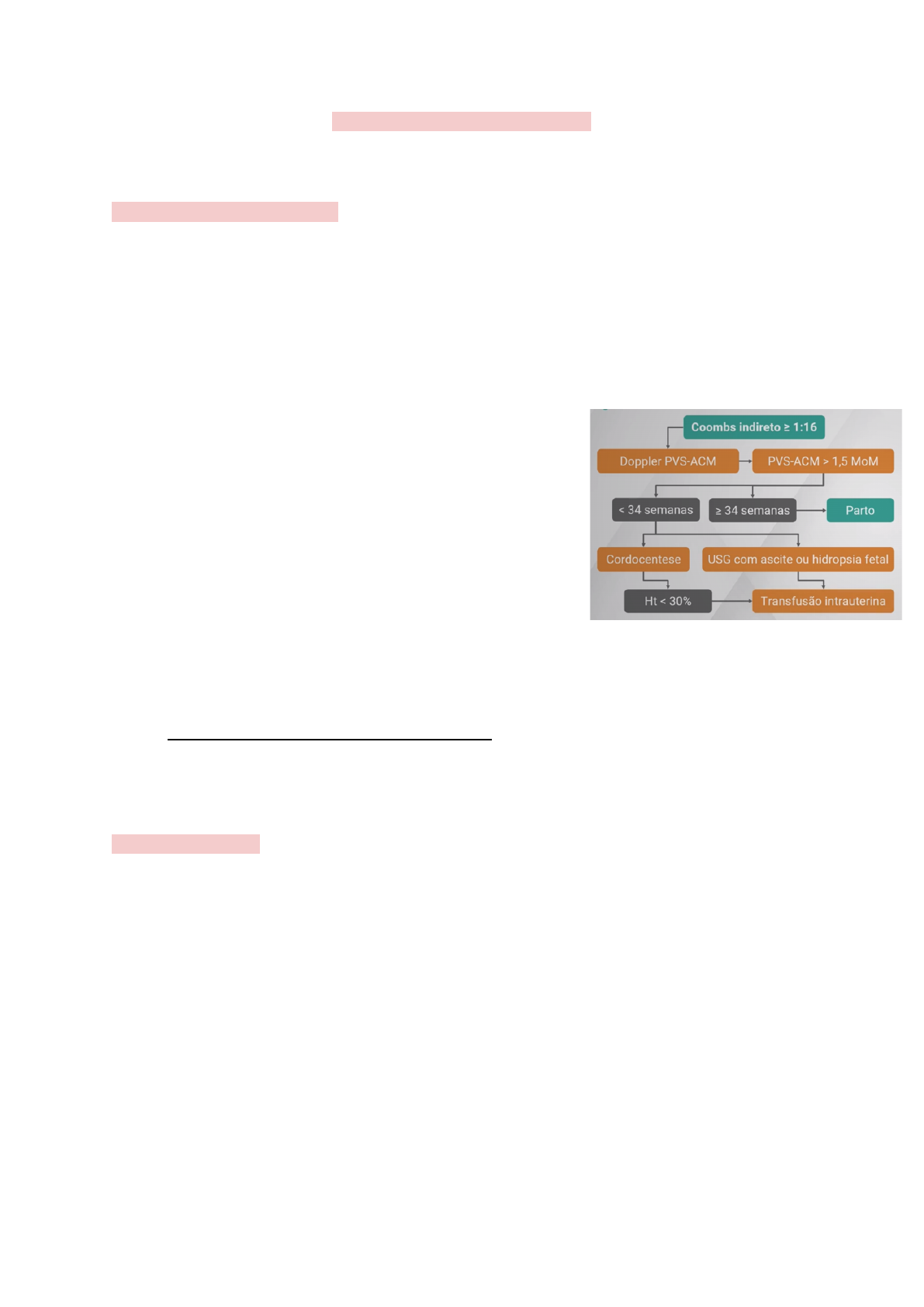 HEMORRAGIAS NA GESTAÇÃO HEMORRAGIAS NA PRIMEIRA METADE DA GESTAÇÃO Doença hemolítica perinatal ● Anemia fetal por hemólise (hipertensão portal, hidropsia, hiperbilirrubinemia e icterícia neonatal) ● Gestante RH → Antígeno D ● 2ª exposição atravessa placenta ● Coombs indireto → mãe → pede no pré-natal - Solicitar primeira consulta - Se vier negativo: seguimento mensal - Positivo: pesquisa de anticorpos irregulares - Se títulos = 1:16 avaliação fetal → DNA fetal, USG com Doppler (aumento do líquido amniótico, ascite, hidropsia fetal) e pico da velocidade diastólica diminui viscosidade sanguínea e aumento da velocidade → PVS > 1,5 → cordocentese - Profilaxia: coombs positivo por 12 semanas ● Coombs direto → bebê ● Tratamento: se doppler alterado + hematócrito 1500 ● Cavidade endometrial vazia ● Culdocentese (não se usa mais) Conduta ● Expectante se BHCG 5000 ● Salpingectomia*** Abortamento de colo fechado IG 25mm sem embrião ou CCN > 6 mm sem BCE Abortamento de colo aberto Aborto inevitável ● útero = ou 12 semanas: misoprostol + curetagem HEMORRAGIAS NA GESTAÇÃO HEMORRAGIAS NA SEGUNDA METADE DA GESTAÇÃO Descolamento Prematuro de Placenta - Grau 0: nada - Grau 1: apenas sangue - Grau 2: clássico - Grau 3: morte fetal Fatores de risco: - Cordão curto - Versão uterina - Trauma (carro) - Trombofilias - Drogas (cocaína**) - Retração uterina - RPMO - Hipertensão ********* Sangramento → Hematoma retroplacentário → descolamento Se sangue passar pro sangre materno: CIVD Diagnóstico é clínico! Cliníca - Hipertensão - Hipertonia - Sangramento escuro (20% é oculto) - Sofrimento fetal Tratamento: parto pela via mais rápida - Amniotomia: diminuir a pressão na cavidade uterina e retardar o descolamento Feto vivo: tempo Feto morto: tolerar Útero de Couvelaire → hemorragia pós parto Placenta Prévia Somente após 28 semanas Recobre orifício INTERNO Fatores de risco ● Cicatriz no útero (cesárea, curetagens, miomectomia, multiparidade) Cliníca ● Sangramento progressivo, repetitivo, espontâneo, vermelho-vivo ● Indolor ● Ausência de hipertonia e sofrimento fetal Sangramento: - Não fazer toque vaginal - USG - Acretismo placentário (complicação) doppler e RNM Conduta: - Termo: parto → cesárea! - Pré-termo: internação hospitalar, corticóide (até 34 semanas), reserva de sangue Rotura Uterina - Parcial: miométrio - Total: chega até a serosa Fatores de risco: cicatriz uterina. Má assistência no parto, adenomiose. Cliníca: iminência (Bandl e Frommel (fronte de frente) e ruptura consumada (Clark e Recasens subida do feto) Conduta: evitar rotura, laparotomia, histerorrafia ou histerectomia Indução de parto: cuidar caso tenha cicatriz uterina, desproporção, apresentação anômala, placenta prévia e vitalidade fetal comprometida Acretismo placentário Placenta prévia! Cesáreas prévias, idade extrema, multiparidade, Sd Asherman Retenção placentária com sangramento maciço Se checa na serosa: increta Se ultrapassar: precreta USG com doppler RNM → adelgaçamento do miométrio Diagnóstico prévio!!!! Não tirar retirar placenta e partir para histerectomia Pode ocorrer uma cesárea programada com balão endovascular Rotura de seio marginal ● Vermelho vivo, indolor, placenta alta e feto bem ● Periparto e histopatológico ● Observar Vasa prévia ● Sangramento de origem fetal ● Inserção velamentosa ● Gemelaridade ● Anormalidades placentárias ● Vasos entre feto e canal ● Vermelho vivo, amniotomia, indolor e placenta baixa → tava bem e feto fica mal ● Cesariana eletiva a partir de 36 semanas CONCEITOS MATADORES ● Placenta prévia: sangramento vivo, indolor, não precisa interromper gestação, não fazer toque, solicitar USG ● DPP: hemorragia pós parto por atonia uterina ● Gestação ectópica rota: grito de Douglas positivo + Blumberg positivo ● Ameaça de abortamento: BCF presente ● Placenta prévia → RM ● Mola: dilatação cervical com velas de Hegar e aspiração intrauterina