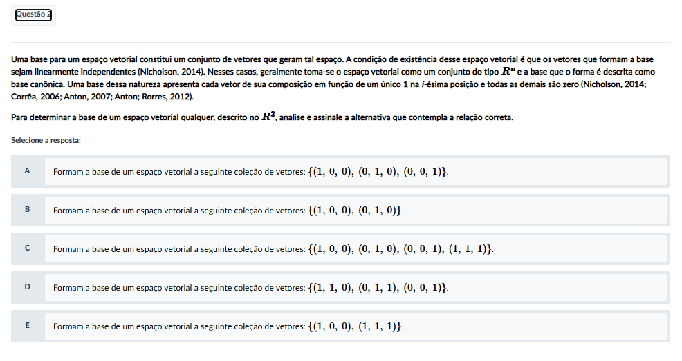Questão 2 Uma base para um espaço vetorial constitui um conjunto de vetores que geram tal espaço. A condição de existência desse espaço vetorial é que os vetores que formam a base sejam linearmente independentes (Nicholson, 2014). Nesses casos, geralmente toma-se o espaço vetorial como um conjunto do tipo e a base que forma é descrita como base canônica. Uma base dessa natureza apresenta cada vetor de sua composição em função de um 1 na i-ésima posição e todas as demais são zero (Nicholson, 2014; Corrêa, 2006; Anton, 2007; Anton; Rorres, 2012). Para determinar a base de um espaço vetorial qualquer, descrito no analise e assinale a alternativa que contempla a relação correta. Selecione a resposta: A Formam a base de um espaço vetorial a seguinte coleção de vetores: {(1, 0, 0), (0, 1, 0), (0, 0, 1)}. B Formam a base de um espaço vetorial a seguinte coleção de vetores: {(1, 0, 0), (0, 1, 0)}. C Formam a base de um espaço vetorial a seguinte coleção de vetores: {(1, 0, 0), (0, 1, 0), (0, 0, 1), (1, 1, 1)}. D Formam a base de um espaço vetorial a seguinte coleção de vetores: {(1, 1, 0), (0, 1, 1), (0, 0, 1)}. E Formam a base de um espaço vetorial a seguinte coleção de vetores: {(1, 0, 0), (1, 1, 1)}.