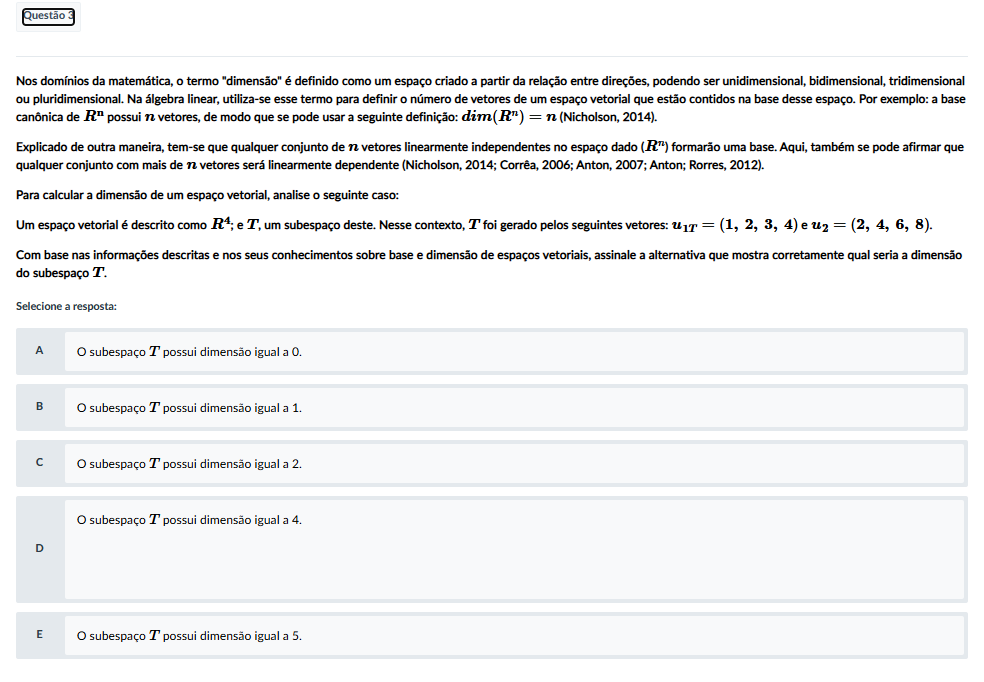 Questão Nos domínios da matemática, termo "dimensão" é definido como um espaço criado a partir da relação entre direções, podendo ser unidimensional, bidimensional, tridimensional ou pluridimensional. Na álgebra linear, utiliza-se esse termo para definir de vetores de um espaço vetorial que estão contidos na base desse espaço. Por exemplo: a base canônica de R" possui n vetores, de modo que se pode usar a seguinte definição: = n (Nicholson, 2014). Explicado de outra maneira, tem-se que qualquer conjunto de n vetores linearmente independentes no espaço dado formarão uma base. Aqui, também se pode afirmar que qualquer conjunto com mais de n vetores será linearmente dependente (Nicholson, 2014; Corrêa, 2006; Anton, 2007; Anton; Rorres, 2012). Para calcular a dimensão de um espaço vetorial, analise seguinte caso: Um espaço vetorial é descrito como e T. um subespaço deste. Nesse contexto, T foi gerado pelos seguintes = Com base nas informações descritas e nos seus conhecimentos sobre base e dimensão de espaços vetoriais, assinale a alternativa que mostra corretamente qual seria a dimensão do subespaço T. Selecione a resposta: A subespaço T possui dimensão igual a B subespaço T possui dimensão igual a 1. subespaço T possui dimensão igual a 2. subespaço T possui dimensão igual a 4. D E subespaço T possui dimensão igual a 5.