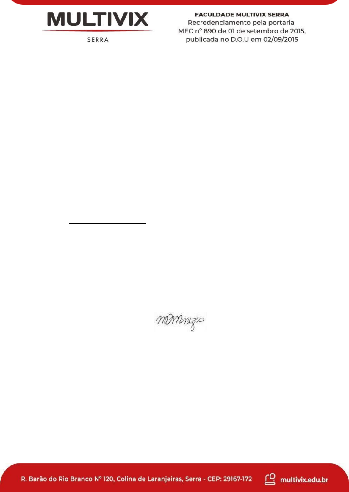CARTA DE APRESENTAÇÃO DO ESTAGIÁRIO A Faculdade Multivix Serra acredita que a formação de seus alunos deve conjugar, desde o princípio, momentos de discussão teórica e momentos de vivências e experimentações das práticas cotidianas das escolas, dos sujeitos que nela convivem todos os dias – alunos, professores, funcionários não docentes e comunidade mais ampla, favorecendo uma percepção mais completa da dinâmica do processo educativo. Assim, a Faculdade encaminha para estágio na , o aluno do 10º PERÍODO do Curso de Engenharia de Produção, regularmente matriculado nesta instituição de ensino, sob a matrícula nº____. O regime da Faculdade Multivix Serra é semestral e a cargahorária total do Estágio em questão é de 300 horas no período conforme Matriz Curricular Vigente. Michelle Oliveira Menezes Coordenação Acadêmica EAD DECLARAÇÃO DE ACEITE DO ESTAGIÁRIO Declaro, para fins de comprovação junto à Coordenação de Estágio do Curso de Engenharia de Produção da Faculdade Multivix Serra, que o(a) aluno(a) ___ ___________________________________________________________________, regularmente matriculado sob a matricula nº , no semestre letivo de 202_/_ desta Instituição, foi aceito como estagiário(a). _, de de 202_. Assinatura do responsável e carimbo da Instituição FICHA DE ESTÁGIO DE ACOMPANHAMENTO MENSAL ESTÁGIO SUPERVISIONADO FICHA DE ESTÁGIO DE ACOMPANHAMENTO MENSAL Estagiário(a): Semestre: Nº de Matrícula: Curso: Cidade: Período do Estágio: Professor Supervisor do Estágio: Data Horário Atividades Assinatura do Aluno Inicio Término Data Horário Atividades Assinatura do Aluno Inicio Término Total de Horas no semestre: / , / / Assinatura do(a) estagiário(a): Assinatura do(a) Supervisor(a) de campo: (todos os documentos deverão ser assinados e carimbados pelo Supervisor de Campo)
