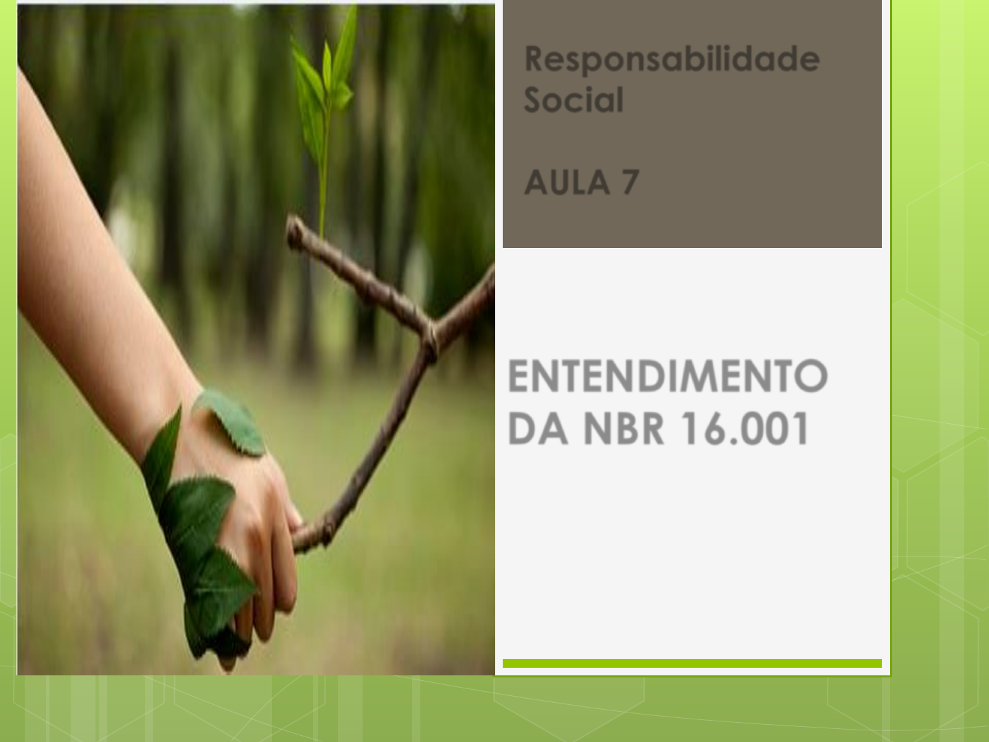 Responsabilidade Social AULA 7 ENTENDIMENTO DA NBR 16.001 O Sistema de Gestão da Responsabilidade Social é esboçado no Brasil palas normas NBR da série 16.000. Em 2004, a Associação Brasileira de Normas Técnicas (ABNT), concluiu a norma NBR 16.001 – Responsabilidade Social: Sistema da Gestão, elaborada por uma comissão formada por representantes do governo, setor produtivo, organizações não governamentais, entidades de classe e academia. Tanto sua estrutura, quanto parte do seu conteúdo se assemelham as IS0 9.000 e a 14000, seguem como base o Modelo PDCA (plan, do, check, act) que proporciona facilidade de integração dos sistemas de gestão já existentes, evitando-se assim a criação de sistemas e departamentos isolados NBR 16.000 A ABNT NBR 16001 estabelece requisitos mínimos relativos a um sistema de gestão da Responsabilidade Social, permitindo à organização formular e implementar uma política e objetivos que levem em conta as exigências legais, seus compromissos éticos e sua preocupação com a promoção da cidadania e do desenvolvimento sustentável, além da transparência das suas atividades. Escopo NBR 16.000 Com a Norma foi estruturada com requisitos é passível de autoria possibilitando para a organização a certificação de seu sistema de gestão da Responsabilidade Social junto a uma organização externa. Este é um grande diferencial em relação a ISO 26.000. Importante salientar que o atendimento aos requisitos da norma não significa que a organização é socialmente responsável, mas que possui um sistema de gestão da Responsabilidade Social - SGRS. NBR 16.001 Em 2012 a NBR 16001:2004 sofreu uma atualização passando a vigorar NBR 16001:2012. As empresas tiveram um prazo de 3 anos para aderir a nova Normativa. Em 2005, foi aprovada a NBR 16002 que trata da qualificação dos auditores e em 2009 foi lançada a NBR 16003 que trata da execução das auditorias. Em 2015 foi lançada a NBR 16.003 que atualiza a NBR 16.003 de 2009 e substitui a NBR 16.002 de 2005. NBR 16.001 NBR 16.001 CICLO PDCA Diagnóstico ISO 14.001 Diagnóstico NBR 16.001 NBR 16.001 NBR 16.001 2005-2015 – Competência dos Auditores 2009-2015 – Execução da Auditoria 19011 - 2012 2004-2012 Requisitos NBR 16.001 Benefícios da ISO 16.001 PRINCIPAIS MOTIVADORES E BENEFÍCIOS DA IMPLANTAÇÃO DA NBR 16.001 •Suporte à licença de operação de uma organização; • Geração de inovação; • Prevenção ou redução de possíveis conflitos com consumidores referente a produtos ou serviços. • Melhoria da saúde e segurança dos trabalhadores de ambos os sexos; • Aumento da fidelidade, do envolvimento, da participação e da moral dos colaboradores. REFERÊNCIAS MELO, Cristiana Malfacini et al. NBR 16001: a norma brasileira de gestão da responsabilidade social. 2007. MINISTÉRIO DO MEIO AMBIENTE - Compreendendo a Responsabilidade Social ISO 26000 e ABNT NBR 16001. Brasília, 2015. Associação Brasileira de Normas Técnicas – ABNT. NBR 16001:2012. Rio de Janeiro: ABNT. 48 p