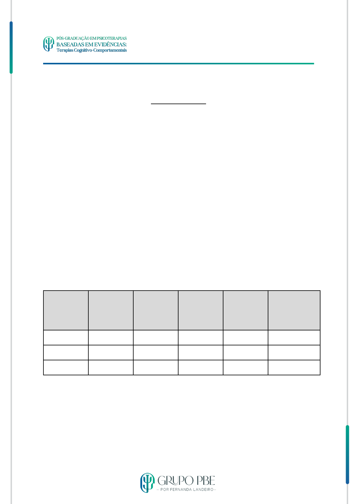 1 Disciplina - Transtorno Obsessivo-Compulsivo TOC DIÁRIO DO TOC INSTRUÇÕES PARA O PREENCHIMENTO Escolha um ou mais dias da semana que você considere os piores, nos quais você apresenta o maior número de sintomas, e preencha o diário ou mapa do TOC. Anote na planilha a data, o horário, a situação ou o local que desencadeou a obsessão, qual o medo obsessivo, o ritual que realizou ou o que evitou e o grau da perturbação sentido: 0. Nenhuma perturbação 1. Leve 2. Moderada 3. Grave 4. Muito grave Data Horário Local ou situação O que passou na minha cabeça O que fiz ou evitei Grau da perturbação sentida REFERÊNCIA CORDIOLI, A. V. TOC: manual de terapia cognitivo-comportamental para o transtorno obsessivo-compulsivo. 2. ed. Porto Alegre: Artmed, 2014. p. 423-424.