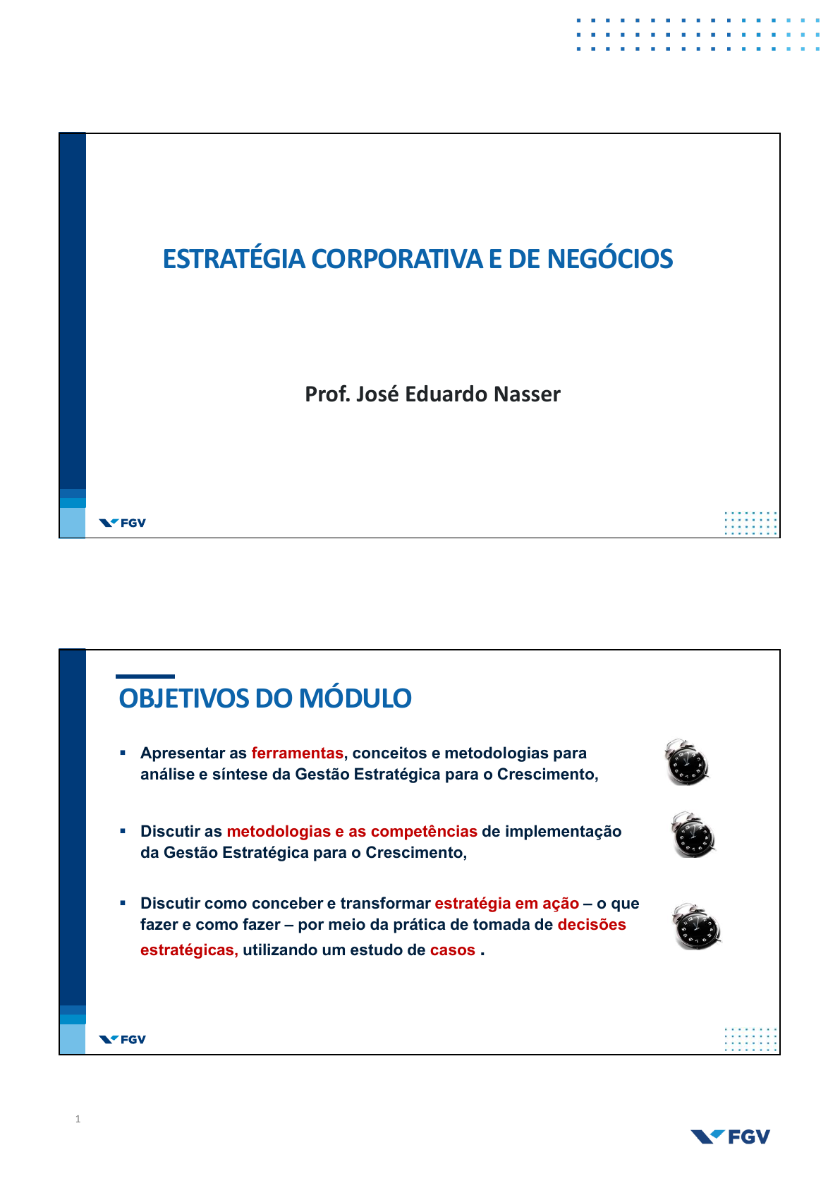 Prof. José Eduardo Nasser ESTRATÉGIA CORPORATIVA E DE NEGÓCIOS OBJETIVOS DO MÓDULO Apresentar as ferramentas, conceitos e metodologias para análise e síntese da Gestão Estratégica para o Crescimento, Discutir as metodologias e as competências de implementação da Gestão Estratégica para o Crescimento, Discutir como conceber e transformar estratégia em ação – o que fazer e como fazer – por meio da prática de tomada de decisões estratégicas, utilizando um estudo de casos . 1 A palavra governança refere-se ao conjunto de processos, políticas, regulamentos, leis e instituições que determinam como uma organização é gerenciada, operada e controlada. A governança é fundamental para garantir que uma organização atue de forma eficaz, eficiente, transparente e ética, além de assegurar a responsabilidade e prestação de contas em relação aos resultados e impactos que ela produz. IBGC 2024 A EVOLUÇÃO DA GOVERNANÇA Governança corporativa surgiu nos Estados Unidos na década como uma resposta à Grande Depressão e aos escândalos financeiros que abalaram a confiança dos investidores no mercado de capitais Cadbury Report: Boas práticas de governança são essenciais Criação do IBGC por um grupo de empresários e executivos brasileiros com o objetivo de promover a prática da governança corporativa no Brasil Sarbanes-Oxley Act: Essência sobre a forma e responsabilização de gatekeepers Crise financeira global: Importância da gestão de riscos, controles internos e compliance Início Lava-jato: Contribuiu para o impeachment da ex- presidente Dilma Rousseff General Data Protection Regulation(LGPD): Organizações têm responsabilidade sobre dados pessoais ESG (environmental, social, and governance): Capitalismo de stakeholders 1 9 9 2 1 9 9 51 9 3 0 2 0 0 2 2 0 0 8 2 0 1 4 2 0 1 6 2 0 1 9 Escândalos (Arthur Andersen, Enron, Worldcom, Tyco Parmalat, Banco Panamericano...) A EVOLUÇÃO DA GOVERNANÇA 2 DESAFIO ATUAL DA GOVERNANÇA C O M O A L I A R L E G A L I D A D E , E F I C I Ê N C I A E I N T E G R I D A D E P A R A G E R A R L E G I T I M I DA D E ? ESTRUTUR A PROCESSOS PESSOAS CULTURA RELAÇÕES EMPRESARIAIS E STAKEHOLDERS PARTES INTERESSADAS CLIENTES ACIONISTAS COMUNIDADE FUNCIONÁRIOS FORNECEDORES ÓRGÃOS REGULADORES IMPRENSA CONCORRENTES ENTIDADES DE CLASSE ORGANIZAÇÕES DO TERCEIRO SETOR PÚBLICO INFLUENCIADOR GOVERNOS SINDICATOS BENEFÍCIOS 3 PROTEÇÃO DE DIREITOS E OBRIGAÇÕES SISTEMA DE RELAÇÕES ESTRUTURA E EQUILÍBRIO DE PODER O QUE É GOVERNANÇA CORPORATIVA? Governança corporativa é o sistema pelo qual as sociedades são dirigidas e monitoradas, envolvendo os relacionamentos entre acionistas, conselho de administração, diretoria, auditoria independente e conselho fiscal. O objetivo das práticas de governança corporativa é criar e operacionalizar um conjunto de mecanismos que visam fazer com que as decisões sejam tomadas de forma a otimizar o desempenho de longo prazo das empresas. SISTEMA DE RELAÇÕES GOVERNANÇA CORPORATIVA COMO: 4 Sistema, estruturas e processos para dirigir e controlar corporações e prestar contas a respeito delas. As regras e as melhores práticas de governança definem os papéis, as responsabilidades, os processos e as estruturas. ESTRUTURA E EQUILÍBRIO DE PODER GOVERNANÇA CORPORATIVA COMO: Garante a distribuição de direitos e responsabilidades entre os diferentes participantes da corporação, além de definir regras e procedimentos para as tomadas de decisão. Adaptação OCDEPROTEÇÃO DE DIREITOS E OBRIGAÇÕES GOVERNANÇA CORPORATIVA COMO: 5 Governança Corporativa: Relacionamentos, Responsabilidades e papéis 1 1 DIFERENÇA DE GOVERNANÇA E GESTÃO 6 GOVERNANÇ A Fonte : 6ª Edição IBGC GOVERNANÇA CORPORATIVA - PILARES 7 Mercado Acionistas • Fornecedores • Clientes • Concorrentes Controladores e minoritários Governo Órgãos normativos do mercado de capitais Investidores institucionais Sindicatos Colaboradores Meio ambiente Sociedade Instituições financiadoras Agências reguladoras RELAÇÕES EMPRESARIAIS E STAKEHOLDERS - PARTES INTERESSADAS Capital Intelectual Patentes Concessões Fidelidade do consumidor Boa Gestão de riscos e crises Responsabilidade Social Capital Intelectual Patentes Concessões Fidelidade do consumidor Boa Gestão de riscos e crises Responsabilidade Social In ta ng ív ei s In ta ng ív ei s Reputação Valor de Marca Credibilidade Integridade Reputação Valor de Marca Credibilidade Integridade $ Valor de Mercado (ou Valor Real) $ Valor de Mercado (ou Valor Real) Ativo PermanenteAtivo Permanente Ativo CirculanteAtivo Circulante Ta ng ív ei s Ta ng ív ei s CAPACIDADE ESTRATÉGICA CAPACIDADE ESTRATÉGICA CAPACIDADE FINANCEIRA CAPACIDADE FINANCEIRA A GERAÇÃO DE VALOR 8 qualidade preço justo crédito atendimento preço justo regularidade adimplência ética nos negócios concorrência geração de emprego receita fiscal não geração de passivos socioambientais LUCROS great place to work segurança reconhecimento remuneração VALOREXPECTATIVAS MERCADO zona de baixa pressão COLABORADORES CLIENTES & CONSUMIDORES FORNECEDORES ESTADO & COMUNIDADE CONCORRENTES Política de Comunicação institucional Decisão de investimento nas relações com stakeholders A GERAÇÃO DE VALOR 9 365 DIAS CERTEZA RISCO INCERTEZA ATITUDES FACE AO FUTURO “ É impossível prever o que vai acontecer, mas é possível antecipar o que pode acontecer.” 10 “ o homem está destinado a decidir..... “ a vida do homem, de cada um de nós, é um incessante processo de tomada de DECISÕES 11 O nosso CONHECIMENTO é sobre o PASSADO e todas as nossas DECISÕES são sobre o FUTURO ! A Estratégia Corporativa e de Negócios é o processo de desenvolvimento e execução de uma série de ações competitivas para ampliar o sucesso da organização, tanto no presente como no futuro . Por meio da reflexão e ação sistemática e continuada ,uma Estratégia de Crescimento avalia a situa
