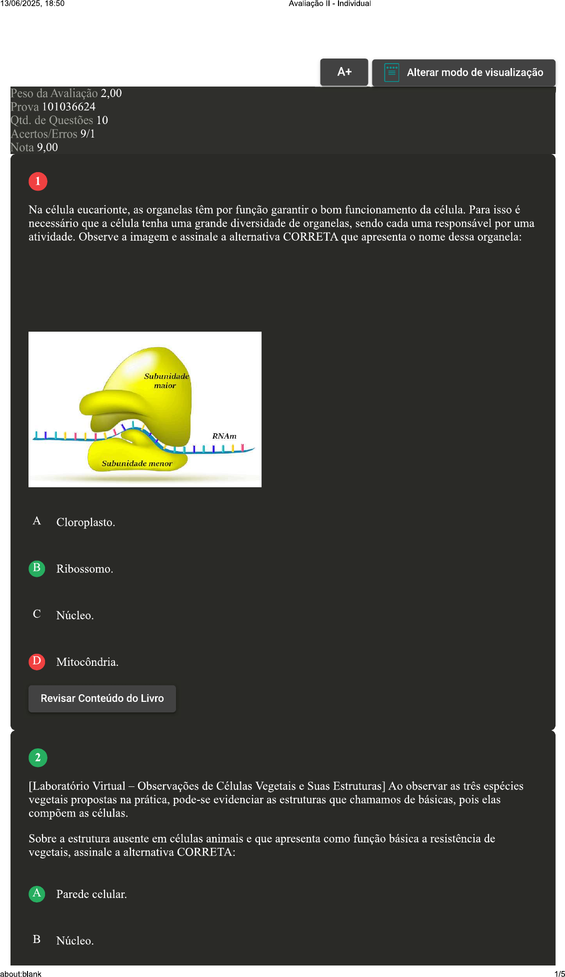13/06/2025, 18:50 Avaliação Individual A+ Alterar modo de visualização Peso da Avaliação 2,00 Prova 101036624 Qtd. de Questões 10 Acertos/Erros 9/1 Nota 9,00 1 Na célula eucarionte, as organelas têm por função garantir bom funcionamento da célula. Para isso é necessário que a célula tenha uma grande diversidade de organelas, sendo cada uma responsável por uma atividade. Observe a imagem e assinale a alternativa CORRETA que apresenta nome dessa organela: Subunidade maior RNAm Subunidade menor A Cloroplasto. B Ribossomo. C Núcleo. D Mitocôndria. Revisar Conteúdo do Livro 2 [Laboratório Virtual - Observações de Células Vegetais e Suas Estruturas] Ao observar as três espécies vegetais propostas na prática, pode-se evidenciar as estruturas que chamamos de básicas, pois elas compõem as células. Sobre a estrutura ausente em células animais e que apresenta como função básica a resistência de vegetais, assinale a alternativa CORRETA: A Parede celular.13/06/2025, 18:50 Avaliação Individual C Citoplasma. D Membrana plasmática. 3 As células vegetais possuem diversas semelhanças com as células animais, tanto na sua estrutura molecular de membranas como pelas diversas organelas presentes, a replicação do DNA, a transcrição em RNA, toda a síntese proteica e a energia proveniente. Qual organela participa da produção de energia na célula? A Complexo de Golgi B Mitocôndria. C Cloroplasto. D Ribossomo. 4 [Laboratório Virtual Observações de Células Vegetais e Suas Estruturas] Na prática realizada de forma virtual, foi possível observar três tipos de células diferentes: de cebola, de tomate e de pera. Considerando que as três espécies compartilham algumas características, assinale a alternativa CORRETA: A São procariontes, pluricelulares e desprovidas de mitocôndrias. B São eucariontes, pluricelulares e desprovidas de cloroplastos. São eucariontes, pluricelulares e D São eucariontes, unicelulares e desprovidas de cloroplastos. 5 O Complexo de Golgi é formado por um conjunto de cisternas em formato de bolsas, assemelhando-se a uma pilha de pires ou panquecas empilhadas. O complexo pode diferir em tamanho e compacidade. Ele funciona como locais das células onde compostos secretados são coletados e concentrados. Sobre complexo, analise as sentenças a seguir: I- O Complexo de Golgi pode atuar na formação dos lisossomos. II- As proteínas produzidas pelo retículo endoplasmático rugoso são armazenadas no Complexo de Golgi III- O Complexo de Golgi é responsável por absorver e armazenar diferentes substâncias que serão utilizadas dentro da célula. Assinale a alternativa CORRETA: about:blank 2/513/06/2025, 18:50 Avaliação Individual FONTE: RIZZO, Donald C. Fundamentos de Anatomia e Fisiologia. São Paulo: Cengage Learning, 2012. A Somente a sentença II está correta. B As sentenças I e III estão corretas. C Somente a sentença III está correta. D As sentenças I e II estão corretas. 6 A maioria das moléculas de ATP que as células utilizam em suas atividades metabólicas formam-se de maneira específica. Sobre a formação dessas moléculas, assinale a alternativa CORRETA: A Nos lisossomos. B No núcleo celular. Nas mitocôndrias. D Na membrana plasmática. 7 Essa organela celular poderia ser utilizada para inserção de transgenes em leveduras. A que exposto se refere? A Peroxissomo. B Mitocôndria. C Complexo golgiense. D Lisossomo. 8 Ao compararmos uma célula animal com uma célula vegetal vamos observar várias estruturas no citoplasma que as diferenciam. Além das organelas, as células vegetais se diferenciam dos animais pela presença da parede celular. Sobre a parede celular, classifique V para as sentenças verdadeiras e F para as falsas: ( ) A parede celular fica internamente a membrana plasmática. ( ) É muito resistente, graças à composição ser celulose. ( ) A composição química é igual à parede celular das bactérias. ( ) Serve para dar resistência à célula vegetal. about:blank 3/513/06/2025, 18:50 Avaliação Individual Assinale a alternativa que apresenta a sequência CORRETA: A F-V-F-V B V - V V - F C F-F-F-V D 9 São conhecidos dois processos pelos quais as substâncias atravessam as membranas biológicas: processos passivos e ativos. Sobre transporte passivo, classifique V para as sentenças verdadeiras e F para as falsas: ( ) Ocorre com gasto de energia, ou seja, metabolismo celular precisa fornecer a energia para que ocorra a passagem através da membrana plasmática ou de qualquer outra membrana lipoproteica. ( ) Ocorre sem gasto de energia, pois movimento da substância é na mesma direção de um gradiente de concentração. A substância passa de um local de alta concentração para outro de baixa concentração. ( ) Na difusão facilitada, transporte acontece através das proteínas que se ligam à molécula que será transportada. O papel dessas proteínas é facilitar a passagem de certas substâncias. Assinale a alternativa que apresenta a sequência CORRETA: A B C F F - V. D 10 No interior do citoplasma das células estão as organelas citoplasmáticas. Essas estruturas apresentam formatos diferentes e executam funções que garantem a sobrevivência dos seres vivos. Sobre os cloroplastos, analise as sentenças a seguir: São organizados nas células de acordo com a incidência luminosa. II- Servem para armazenar amido III- São organelas características de seres autotróficos. IV- Participam da síntese proteica. Assinale a alternativa CORRETA: A As sentenças I, III e IV estão corretas. B As sentenças I, II e III estão corretas. C As sentenças I e III estão corretas. about:blank 4/513/06/2025, 18:50 Avaliação Individual D As sentenças II e III estão corretas. Imprimir about:blank 5/5