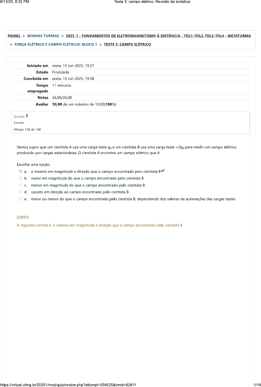 6/13/25, 8:32 PM Teste 3: campo elétrico: Revisão da tentativa PAINEL > MINHAS TURMAS > 2025 1 - FUNDAMENTOS DE ELETROMAGNETISMO À DISTÂNCIA - TOL1-TOL2-TOL3-TOL4 METATURMA > FORÇA ELÉTRICA E CAMPO ELÉTRICO: BLOCO 1 > TESTE 3: CAMPO ELÉTRICO Iniciado em sexta, 13 Jun 2025, 19:27 Estado Finalizada Concluída em sexta, 13 Jun 2025, 19:38 Tempo 11 minutos empregado Notas 26,00/26,00 Avaliar 10,00 de um máximo de 10,00(100%) Questão 1 Correto Atingiu 1,00 de 1,00 Vamos supor que um cientista A usa uma carga teste 90 e um cientista B usa uma carga teste - -290 para medir um campo elétrico produzido por cargas estacionárias. cientista A encontra um campo elétrico que é: Escolha uma opção: a. o mesmo em magnitude e direção que o campo encontrado pelo cientista B b. maior em magnitude do que o campo encontrado pelo cientista B C. menor em magnitude do que o campo encontrado pelo cientista B d. oposto em direção ao campo encontrado pelo cientista B e. maior ou menor do que o campo encontrado pelo cientista B, dependendo dos valores de acelerações das cargas testes CERTO! A resposta correta é: o mesmo em magnitude e direção que o campo encontrado pelo cientista 1/146/13/25, 8:32 PM Teste 3: campo elétrico: Revisão da tentativa Questão 2 Correto Atingiu 1,00 de 1,00 Sobre o campo vetorial podemos afirmar que (pode haver mais de uma alternativa verdadeira): Escolha uma opção: a. Esse campo é representado no plano cartesiano como uma seta horizontal partindo da origem e terminando em = 2. b. Esse campo pode ser representado no plano cartesiano através de setas horizontais de tamanho 2, distribuídas uniformemente no plano. C. Esse expressão significa que em qualquer ponto (x,y) há um campo elétrico Sua resposta está correta. As respostas corretas são: Esse campo pode ser representado no plano cartesiano através de setas horizontais de tamanho 2, distribuídas uniformemente no Esse expressão significa que em qualquer ponto (x,y) há um campo elétrico N/C Questão 3 Correto Atingiu 1,00 de 1,00 Escolha a afirmação correta sobre linhas de campo elétrico: Escolha uma opção: a. linhas de campo podem cruzar-se entre si b. linhas de campo aproximam-se em regiões onde o campo elétrico é grande C. uma linha de campo pode começar e terminar na mesma carga. d. podemos ter uma linha de campo fechada, em formato circular, por exemplo. e. nenhuma das afirmações anteriores está correta CERTO! A resposta correta é: linhas de campo aproximam-se em regiões onde o campo elétrico é grande https://virtual.ufmg.br/20251/mod/quiz/review.php?attempt=254525&cmid=82811 2/146/13/25, 8:32 PM Teste 3: campo elétrico: Revisão da tentativa Questão 4 Correto Atingiu 1,00 de 1,00 diagrama mostra as linhas de campo elétrico em uma região do espaço contendo duas esferas pequenas carregadas Pode- se afirmar que: Y Z Escolha uma opção: a. a esfera Y está carregada negativamente e a esfera Z carregada positivamente. b. a magnitude do campo elétrico é a mesma em qualquer lugar. C. as esferas Y e Z possuem cargas de mesmo sinal. d. a esfera Y está carregada positivamente e a esfera Z carregada negativamente CERTO! A resposta correta é: a esfera Y está carregada positivamente e a esfera Z carregada negativamente Questão 5 Correto Atingiu 1,00 de 1,00 Duas partículas pontuais, com a mesma carga, estão localizadas em dois vértices de um triângulo equilátero. Uma terceira partícula carregada é colocada de modo que o campo elétrico no terceiro vértice é nulo. A terceira partícula deve: Escolha uma opção: a. estar localizada sobre a mediatriz da linha que une as duas primeiras cargas b. estar localizada sobre a linha que une as duas primeiras cargas C. ter a mesma carga que as duas primeiras partículas d. ter carga de mesma magnitude que as duas primeiras partículas, mas sua carga pode ter sinal diferente e. estar localizada no centro do triângulo CERTO! A resposta correta é: estar localizada sobre a mediatriz da linha que une as duas primeiras cargas 3/146/13/25, 8:32 PM Teste 3: campo elétrico: Revisão da tentativa Questão 6 Correto Atingiu 1,00 de 1,00 Uma partícula pontual carregada isolada produz um campo elétrico com magnitude E em um ponto distante 2m dela. Em um ponto distante 1m da partícula a magnitude do campo é igual a: Escolha uma opção: a. E b. 2E C. 4E d. E/4 e. E/2 CERTO! A resposta correta é: 4E Questão 7 Correto Atingiu 1,00 de 1,00 Considere uma distribuição de cargas puntiformes. Suponha que queremos calcular o campo elétrico em um ponto P próximo à distribuição. Analise as seguintes afirmativas e assinale quais são verdadeiras: I. Como o campo elétrico obedece o Princípio da Superposição, podemos somar os campos que cada uma das cargas produz no ponto P. II. campo que cada carga produz no ponto depende da distância dela até o ponto. III. Cada carga interfere no campo das demais e dessa forma, o campo de cada uma delas depende da distância até o ponto e das distâncias até as outras cargas. IV. Devemos escolher uma das cargas para ser a origem do sistema de referência. V. Se a soma das cargas for nula, o campo elétrico no ponto P também será nulo. Escolha uma opção: a. I e são verdadeiras. b. I, e III são verdadeiras. C. e IV são verdadeiras. d. I, e V são verdadeiras. e. II, IV e V são verdadeiras. Sua resposta está correta. A resposta correta é: e II são verdadeiras. 4/148:32 PM Teste 3: campo elétrico: Revisão da tentativa Questão 8 Correto Atingiu 1,00 de 1,00 Os diagramas abaixo mostram quatro diferentes distribuições de carga. As partículas carregadas estão todas à mesma distância da origem. campo elétrico na origem é: 5q 5q 5q 5q 2q -3q 3q 3q 2q - 2q 2q 2q 5q 5q 1 2 3 4 Escolha uma opção: a. menor na configuração 1 b. maior na configuração 3 C. nulo na configuração 4 d. direcionado para baixo na configuração 1 e. direcionado para baixo na configuração 3 CERTO! A respos