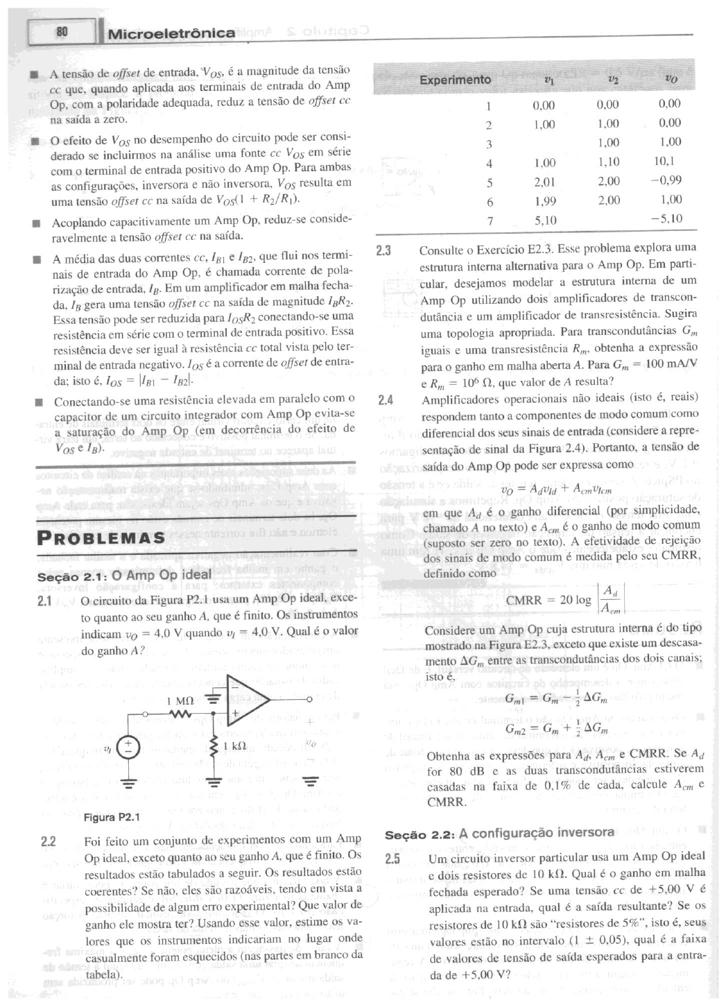 80 Microeletrônica A tensão de offset de entrada, é a magnitude da tensão cc que, quando aplicada aos terminais de entrada do Amp Experimento Op, com a polaridade adequada, reduz a tensão de offset cc 1 0,00 0,00 0,00 na saída a zero. 2 1,00 1,00 0,00 efeito de Vos no desempenho do circuito pode ser consi- 3 1,00 1,00 derado se incluirmos na análise uma fonte cc Vos em série com o terminal de entrada positivo do Amp Op. Para ambas 4 1,00 1,10 10,1 as configurações, inversora e não inversora, Vos resulta em 5 2,01 2,00 -0,99 uma tensão offset na saída de + 6 2,00 1,00 Acoplando capacitivamente um Amp Op, reduz-se conside- 7 5,10 -5,10 ravelmente a tensão offset cc na saída. A média das duas correntes e que flui nos termi- 2.3 Consulte o Exercício E2.3. Esse problema explora uma nais de entrada do Amp Op, é chamada corrente de pola- estrutura interna alternativa para o Amp Op. Em parti- rização de entrada, Em um amplificador em malha fecha- desejamos modelar a estrutura interna de um da, gera uma tensão offset cc na saída de magnitude Amp Op utilizando dois amplificadores de transcon- Essa tensão pode ser reduzida para conectando-se uma dutância e um amplificador de Sugira resistência em série com o terminal de entrada positivo. Essa uma topologia apropriada. Para transcondutâncias Gm resistência deve ser igual à resistência cc total vista pelo ter- iguais e uma transresistência Rm, obtenha a expressão minal de entrada negativo. los é a corrente de offset de entra- para o ganho em malha aberta A. Para Gm = 100 mA/V isto e Rm = 106 que valor de A resulta? Conectando-se uma resistência elevada em paralelo com o 2.4 Amplificadores operacionais não ideais (isto é, reais) capacitor de um circuito integrador com Amp Op evita-se respondem tanto a componentes de modo comum como a saturação do Amp Op (em decorrência do efeito de diferencial dos seus sinais de entrada (considere a repre- Vos e sentação de sinal da Figura 2.4). Portanto, a tensão de saída do Amp Op pode ser expressa como Advid + em que é o ganho diferencial (por simplicidade, chamado A no texto) e Acm é o ganho de modo comum PROBLEMAS (suposto ser zero no texto). A efetividade de rejeição dos sinais de modo comum é medida pelo seu CMRR, Seção 2.1: Amp Op ideal definido como A 2.1 circuito da Figura P2.1 usa um Amp Op ideal, exce- CMRR = 20 log to quanto ao seu ganho A, que é finito. Os instrumentos Acm indicam = 4,0 V quando = 4,0 V. Qual é o valor Considere um Amp Op cuja estrutura interna é do tipo do ganho A? mostrado na Figura E2.3, exceto que existe um descasa- mento AGm entre as transcondutâncias dos dois canais; isto MO Gml Gm + Gm2 = Gm + AGm Obtenha as expressões para Ad, e CMRR. Se for 80 dB e as duas transcondutâncias estiverem casadas na faixa de 0,1% de calcule Acm e CMRR. Figura P2.1 2.2 Foi feito um conjunto de experimentos com um Amp Seção 2.2: A configuração inversora Op ideal, exceto quanto ao seu ganho A, que é finito. Os Um circuito inversor particular usa um Amp Op ideal resultados estão tabulados a seguir. Os resultados estão e dois resistores de 10 Qual é o ganho em malha coerentes? Se não, eles são razoáveis, tendo em vista a fechada esperado? Se uma tensão cc de +5,00 V é possibilidade de algum erro experimental? Que valor de aplicada na entrada, qual é a saída resultante? Se os ganho ele mostra ter? Usando esse valor, estime os va- resistores de são "resistores de isto seus lores que os instrumentos indicariam no lugar onde valores estão no intervalo (1 + 0,05), qual é a faixa casualmente foram esquecidos (nas partes em branco da de valores de tensão de saída esperados para a entra- tabela). da de +5,00 V?Capítulo 2 Amplificadores operacionais 81 2.6 Supondo os amplificadores ideais, calcule o ganho de que a corrente drenada da fonte de sinal de entrada, tensão e a resistência de entrada Rin para cada um aonde vai a corrente adicional? dos circuitos da Figura P2.6. 10 100 1 10 -1V + + (a) Figura P2.8 2.9 circuito da Figura P2.9 é usado para 10 fornecer uma tensão de saída proporcional a um sinal de corrente de entrada Determine as expressões para a transresistência Rm e a resistência de entrada vili para os seguintes casos: (a) com A infinito e (b) (b) com A finito. R1 10 A Figura P2.9 (c) *2.10 Rearranje a Equação 2.5 para dar o ganho em malha aberta A necessário para obter o ganho em malha fecha- 10 da desejado (Gnominal = dentro de um erro de ganho E especificado, + G - E = (d) Para o ganho em malha fechada de -100 e erro de Figura P2.6 ganho82 Microeletrônica (a) Obtenha as resistências vistas do nó 1, nó 2, P2.16 A Figura P2.16 mostra um circuito para um voltímetro nó 3, R3; e nó 4, R4 analógico de bobina móvel com resistência de entrada (b) Obtenha as correntes e em função da cor- muito alta e de baixo custo do medidor de bobina rente de entrada I. móvel. voltímetro mede a tensão V aplicada entre o (c) Calcule as tensões nos nós 1, 3 e 4, isto é, terminal da entrada positiva do Amp Op e o terra. V3 e V4 em termos de (IR). Suponha que o fundo de escala do medidor de bobina 2.13 Usando o esquema ilustrado na Figura 2.10, projete um móvel seja de 100 calcule o valor de R tal que a circuito com entradas e que forneça = leitura de corrente de fundo de escala seja obtida quan- + + empregando resistores maiores do V for de +10 V. A resistência do medidor mostrado que afeta a calibração do voltímetro? 2.14 A Figura P2.14 mostra o circuito de um conversor di- Medidor de bobina móvel gital-analógico (D/A). circuito aceita uma entrada de 4 bits com palavra binária em que ao, a2 e podem assumir os valores 0 ou 1, fornecendo uma tensão de saída analógica proporcional ao valor da entrada digital. Cada um dos bits da palavra de entrada controla R as chaves numeradas. Por exem- plo, se é 0, então a chave S2 conecta o resistor de 20 ao terra, ao passo que se é 1, então a chave S2 + conecta o resisto