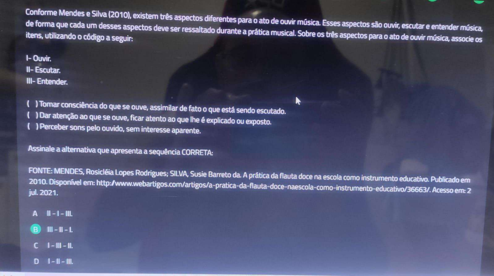 Conforme Mendes e Silva (2010), existem três aspectos diferentes para ato de ouvir música. Esses aspectos são ouvir, escutar e entender música, de forma que cada um desses aspectos deve ser ressaltado durante a prática musical. Sobre três aspectos para ato de ouvir música, associe os itens, utilizando o código a seguir: I- Ouvir. II- Escutar. III- Entender. ( ) Tomar consciência do que se ouve, assimilar de fato que está sendo escutado. ( ) Dar atenção ao que se ouve, ficar atento ao que lhe é explicado ou exposto. ( ) Perceber sons pelo ouvido, sem interesse aparente. Assinale a alternativa que apresenta a sequência CORRETA: FONTE: MENDES, Rosicléia Lopes Rodrigues; SILVA, Susie Barreto da. A prática da flauta doce na escola como instrumento educativo. Publicado em 2010. em: 2 jul. 2021. A D