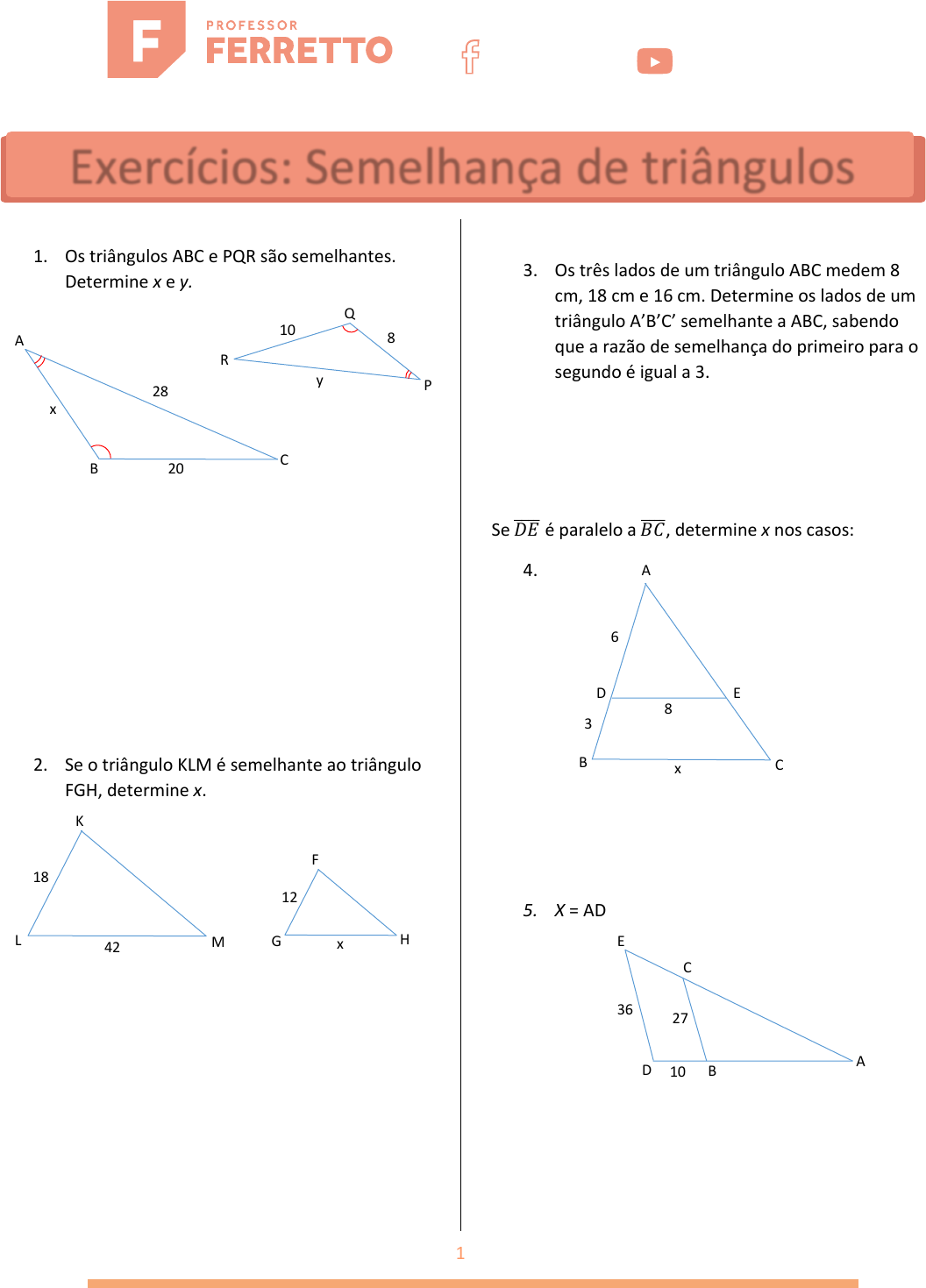 1 1. Os triângulos ABC e PQR são semelhantes. Determine x e y. 2. Se o triângulo KLM é semelhante ao triângulo FGH, determine x. 3. Os três lados de um triângulo ABC medem 8 cm, 18 cm e 16 cm. Determine os lados de um triângulo A’B’C’ semelhante a ABC, sabendo que a razão de semelhança do primeiro para o segundo é igual a 3. Se 𝐷𝐸#### é paralelo a 𝐵𝐶####, determine x nos casos: 4. 5. X = AD Exercícios: Semelhança de triângulos www.professorferretto.com.br ProfessorFerretto ProfessorFerretto A B C x 20 28 Q P R y 10 8 K L M 18 42 F G H 12 x A B C 6 x 3 8 D E E D A 36 10 27 C B 2 6. O perímetro de um triângulo é 60 m e um dos lados tem 25 m. Qual o perímetro do triângulo semelhante cujo lado homólogo ao lado dado mede 15 m? 7. Os lados de um triângulo medem 8,4 cm, 15,6 cm e 18 cm. Esse triângulo é semelhante a um triângulo cujo perímetro mede 35 cm. Calcule o maior lado do segundo triângulo. 8. Num triângulo ABC os lados medem AB = 4 cm, BC = 5 cm e AC = 6 cm. Calcule os lados de um triângulo semelhante a ABC, cujo perímetro mede 20 cm. Se 𝛼 = 𝛽, determine x e y em cada caso: 9. 10. 11. Sendo r e s retas paralelas, determine o valor de x: 8 6 2 x y 4 𝛼 𝛽 6 y 8 12 x 8 𝛼 𝛽 s 21 12 r 8 x 3 12. Dada a figura, determine o valor de x. 13. Determine a medida do lado do quadrado da figura abaixo. 14. As bases de um trapézio ABCD medem 50 cm e 30 cm e a altura 10 cm. Prolongando-se os lados não paralelos, eles se interceptam num ponto E. Determine a altura 𝐸𝐹#### do triângulo ABE e a altura 𝐸𝐺#### do triângulo CDE. 15. Num triângulo isósceles de 20 cm de altura e 50/3 cm de base está inscrito um retângulo de 8 cm de altura com base na base do triângulo. Calcule a medida da base do retângulo. GABARITO: 1. 16; 14 2. 28 3. 8/3 cm; 6 cm; 16/3 cm 4. 12 5. 40 6. 36 m 7. 15 cm 8. 20/3 cm; 8 cm; 16/3 cm 9. 9; 32/3 10. 7; 10 11. 6 12. 45/4 13. 12/5 14. 15 cm; 25 cm 15. 10 cm 15 20 x 15 10 4 6 A B C D E F G