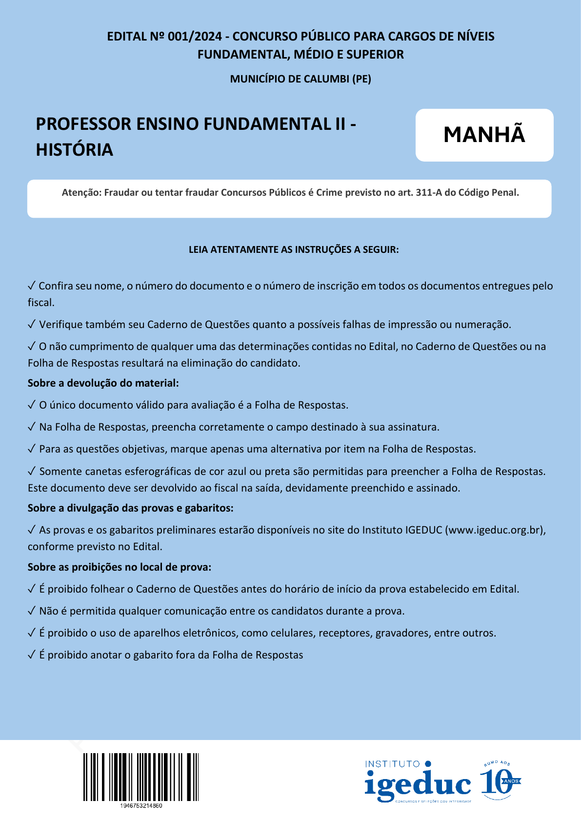pcimarkpci MDAwMDowMDAwOjAwMDA6MDAwMDowMDAwOmZmZmY6MmRlYTowYjVj:RnJpLCAwNiBKdW4gMjAyNSAxODozOTowMSAtMDMwMA== www.pciconcursos.com.br PROFESSOR ENSINO FUNDAMENTAL II - HISTÓRIA EDITAL Nº 001/2024 - CONCURSO PÚBLICO PARA CARGOS DE NÍVEIS FUNDAMENTAL, MÉDIO E SUPERIOR MUNICÍPIO DE CALUMBI (PE) LEIA ATENTAMENTE AS INSTRUÇÕES A SEGUIR: ✓ Confira seu nome, o número do documento e o número de inscrição em todos os documentos entregues pelo fiscal. ✓ Verifique também seu Caderno de Questões quanto a possíveis falhas de impressão ou numeração. ✓ O não cumprimento de qualquer uma das determinações contidas no Edital, no Caderno de Questões ou na Folha de Respostas resultará na eliminação do candidato. Sobre a devolução do material: ✓ O único documento válido para avaliação é a Folha de Respostas. ✓ Na Folha de Respostas, preencha corretamente o campo destinado à sua assinatura. ✓ Para as questões objetivas, marque apenas uma alternativa por item na Folha de Respostas. ✓ Somente canetas esferográficas de cor azul ou preta são permitidas para preencher a Folha de Respostas. Este documento deve ser devolvido ao fiscal na saída, devidamente preenchido e assinado. Sobre a divulgação das provas e gabaritos: ✓ As provas e os gabaritos preliminares estarão disponíveis no site do Instituto IGEDUC (www.igeduc.org.br), conforme previsto no Edital. Sobre as proibições no local de prova: ✓ É proibido folhear o Caderno de Questões antes do horário de início da prova estabelecido em Edital. ✓ Não é permitida qualquer comunicação entre os candidatos durante a prova. ✓ É proibido o uso de aparelhos eletrônicos, como celulares, receptores, gravadores, entre outros. ✓ É proibido anotar o gabarito fora da Folha de Respostas MANHÃ Atenção: Fraudar ou tentar fraudar Concursos Públicos é Crime previsto no art. 311-A do Código Penal. pcimarkpci MDAwMDowMDAwOjAwMDA6MDAwMDowMDAwOmZmZmY6MmRlYTowYjVj:RnJpLCAwNiBKdW4gMjAyNSAxODozOTowMSAtMDMwMA== www.pciconcursos.com.br CONHECIMENTOS GERAIS Questão 01 De acordo com a teoria de Vygotsky, certos processos mentais, como o pensamento abstrato, a memória voluntária e o uso intencional da linguagem, são considerados habilidades desenvolvidas socialmente e mediadas por ferramentas culturais. Esses processos complexos são conhecidos como: (A) Funções Psicológicas Inferiores. (B) Funções Psicológicas Superiores. (C) Zonas de Desenvolvimento Proximal. (D) Mediações Cognitivas. Questão 02 Na Psicologia da Educação, a teoria de aprendizagem significativa de David Ausubel é paradigmática. Qual das alternativas abaixo descreve uma aplicação prática dessa teoria em sala de aula? (A) Ministrar aulas expositivas, permitindo que os alunos façam perguntas após a apresentação completa dos conceitos. (B) Introduzir novos conteúdos partindo de exemplos e temas familiares aos alunos, relacionando-os ao que já conhecem e entendem. (C) Elaborar uma revisão geral de conteúdo antes de cada aula, para além do nível de compreensão individual de cada aluno. (D) Aplicar testes ao final de cada unidade, para verificar se os alunos conseguem reproduzir o conteúdo ensinado de forma fiel. Questão 03 Em análise sintática, a classificação dos termos da oração é essencial para uma correta interpretação da estrutura gramatical. Qual das alternativas abaixo apresenta a classificação correta do termo destacado na oração "O professor discutiu com os alunos sobre os projetos interdisciplinares"? (A) Predicativo do sujeito, pois "com os alunos" caracteriza o sujeito "professor" durante a ação do verbo "discutir". (B) Adjunto adverbial de companhia, pois o termo "com os alunos" indica quem acompanha o sujeito na ação da discussão. (C) Complemento nominal, pois o termo se refere ao substantivo "professor", indicando quem estava presente na discussão. (D) Objeto indireto, já que "com os alunos" completa o sentido do verbo "discutir" exigindo preposição. Questão 04 Considerando o Ensino Fundamental na Lei nº 9.394/96, julgue as sentenças abaixo como VERDADEIRAS ou FALSAS: (__)O ensino fundamental obrigatório, com duração de 9 (nove) anos, gratuito na escola pública, iniciando-se aos 6 (seis) anos de idade, terá por objetivo a formação básica do cidadão. (__)O estudo sobre os símbolos nacionais será incluído como tema transversal nos currículos do ensino fundamental. (__)É obrigatório aos sistemas de ensino desdobrar o ensino fundamental em ciclos. A sequência CORRETA é: (A) V, V, V. (B) F, V, F. (C) V, V, F. (D) V, F, V. Questão 05 De acordo com a Lei nº 9.394/96 que define despesas de manutenção e desenvolvimento do ensino, considera-se como despesa válida para os objetivos educacionais: (A) Apenas as despesas relacionadas à remuneração dos docentes e construção de instalações educacionais. (B) A concessão de bolsas de estudo para alunos exclusivamente de escolas públicas. (C) O financiamento de operações de crédito para atividades de pesquisa acadêmica geral. (D) A realização de atividades curriculares complementares voltadas ao aprendizado, como feiras de ciências e exposições culturais. Questão 06 Na Educação Infantil,a Base Nacional Comum Curricular (BNCC) é organizada em torno de campos de experiências e tem como foco o desenvolvimento integral da criança, considerando as especificidades da faixa etária de zero a cinco anos. Os campos de experiências são, EXCETO: (A) Traços, sons, cores e formas. (B) Corpo, gestos e movimentos. (C) O eu, o outro e o nós. (D) Espaços, qualidades, sabedorias e evoluções. PROFESSOR ENSINO FUNDAMENTAL II ? HISTÓRIA - 1 1 pcimarkpci MDAwMDowMDAwOjAwMDA6MDAwMDowMDAwOmZmZmY6MmRlYTowYjVj:RnJpLCAwNiBKdW4gMjAyNSAxODozOTowMSAtMDMwMA== www.pciconcursos.com.br Questão 07 No trecho "A incerteza e o medo do desconhecido fazem parte do cotidiano de muitos", a palavra "incerteza" exerce qual função morfo