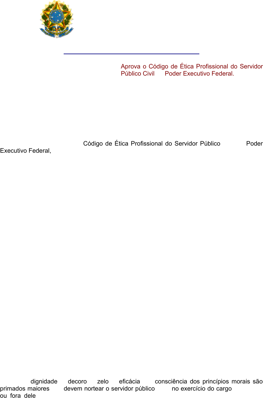 Presidência da República Casa Civil Subchefia para Assuntos Jurídicos DECRETO Nº 1.171, DE 22 DE JUNHO DE 1994 Aprova o Código de Ética Profissional do Servidor Público Civil do Poder Executivo Federal. 0 PRESIDENTE DA REPÚBLICA, no uso das atribuições que lhe confere o art. 84, incisos IV e VI, e ainda tendo em vista o disposto no art. 37 da Constituição, bem como nos arts. 116 e 117 da Lei n° 8.112, de 11 de dezembro de 1990, e nos arts. 10, 11 e 12 da Lei n° 8.429, de 2 de junho de 1992, DECRETA: Art. 1° Fica aprovado o Código de Ética Profissional do Servidor Público Civil do Poder Executivo Federal, que com este baixa. Art. 2° Os órgãos e entidades da Administração Pública Federal direta e indireta implementarão, em sessenta dias, as providências necessárias à plena vigência do Código de Ética, inclusive mediante a Constituição da respectiva Comissão de Ética, integrada por três servidores ou empregados titulares de cargo efetivo ou emprego permanente. Parágrafo único. A constituição da Comissão de Ética será comunicada à Secretaria da Administração Federal da Presidência da República, com a indicação dos respectivos membros titulares e suplentes. Art. 3° Este decreto entra em vigor na data de sua publicação. Brasília, 22 de junho de 1994, 173° da Independência e 106° da República. ITAMAR FRANCO Romildo Canhim Eate texto não substitui o publicado no DOU de 23.6.1994. ANEXO Código de Ética Profissional do Servidor Público Civil do Poder Executivo Federal CAPÍTULO I Seção I Das Regras Deontológicas I - A dignidade, o decoro, o zelo, a eficácia e a consciência dos princípios morais são primados maiores que devem nortear o servidor público, seja no exercício do cargo ou função, ou fora dele, já que refletirá o exercício da vocação do próprio poder estatal. Seus atos, comportamentos e atitudes serão direcionados para a preservação da honra e da tradição dos serviços públicos. PRIMADOS MAIORES DIGNIDADE DECORO ZELO EFICÁCIA CONSCIÊNCIA DOS PRINCÍPIOS MORAIS Highlight APLICÁVEL > PODER EXECUTIVO FEDERAL CELETISTAS ENTIDADES/ATIVID/DELEG ESTATUTÁRIOS NÃO SE APLICA PODERES JUD/LEG E/M/DF FORÇAS ARMADAS CÓDIGO DE ÉTICA # REGIME DISCIPLINAR Highlight Highlight SERVIDOR PÚBLICO TODO AQUELE > LEI/CONTRATO/ATO JURÍDICO SERVIÇOS> PERMANENTE/TEMPORÁRIO/EXCEPCIONAL AINDA QUE > S/REMUNERAÇÃO Highlight Highlight Highlight Highlight Highlight Highlight Highlight Highlight Highlight devem nortear o servidor público no exercício do cargo OU fora dele Highlight II - O servidor público não poderá jamais desprezar o elemento ético de sua conduta. Assim, não terá que decidir somente entre o legal e o ilegal, o justo e o injusto, o conveniente e o inconveniente, o oportuno e o inoportuno, mas principalmente entre o honesto e o desonesto, consoante as regras contidas no art. 37, caput, e § 4°, da Constituição Federal. III - A moralidade da Administração Pública não se limita à distinção entre o bem e o mal, devendo ser acrescida da idéia de que o fim é sempre o bem comum. O equilíbrio entre a legalidade e a finalidade, na conduta do servidor público, é que poderá consolidar a moralidade do ato administrativo. IV- A remuneração do servidor público é custeada pelos tributos pagos direta ou indiretamente por todos, até por ele próprio, e por isso se exige, como contrapartida, que a moralidade administrativa se integre no Direito, como elemento indissociável de sua aplicação e de sua finalidade, erigindo-se, como conseqüência, em fator de legalidade. V - O trabalho desenvolvido pelo servidor público perante a comunidade deve ser entendido como acréscimo ao seu próprio bem-estar, já que, como cidadão, integrante da sociedade, o êxito desse trabalho pode ser considerado como seu maior patrimônio. VI - A função pública deve ser tida como exercício profissional e, portanto, se integra na vida particular de cada servidor público. Assim, os fatos e atos verificados na conduta do dia-a- dia em sua vida privada poderão acrescer ou diminuir o seu bom conceito na vida funcional. VII - Salvo os casos de segurança nacional, investigações policiais ou interesse superior do Estado e da Administração Pública, a serem preservados em processo previamente declarado sigiloso, nos termos da lei, a publicidade de qualquer ato administrativo constitui requisito de eficácia e moralidade, ensejando sua omissão comprometimento ético contra o bem comum, imputável a quem a negar. VIII - Toda pessoa tem direito à verdade. O servidor não pode omiti-la ou falseá-la, ainda que contrária aos interesses da própria pessoa interessada ou da Administração Pública. Nenhum Estado pode crescer ou estabilizar-se sobre o poder corruptivo do hábito do erro, da opressão ou da mentira, que sempre aniquilam até mesmo a dignidade humana quanto mais a de uma Nação. IX - A cortesia, a boa vontade, o cuidado e o tempo dedicados ao serviço público caracterizam o esforço pela disciplina. Tratar mal uma pessoa que paga seus tributos direta ou indiretamente significa causar-lhe dano moral. Da mesma forma, causar dano a qualquer bem pertencente ao patrimônio público, deteriorando-o, por descuido ou má vontade, não constitui apenas uma ofensa ao equipamento e às instalações ou ao Estado, mas a todos os homens de boa vontade que dedicaram sua inteligência, seu tempo, suas esperanças e seus esforços para construí-los. X - Deixar o servidor público qualquer pessoa à espera de solução que compete ao setor em que exerça suas funções, permitindo a formação de longas filas, ou qualquer outra espécie de atraso na prestação do serviço, não caracteriza apenas atitude contra a ética ou ato de desumanidade, mas principalmente grave dano moral aos usuários dos serviços públicos. XI - 0 servidor deve prestar toda a sua atenção às ordens legais de seus superiores, velando atent