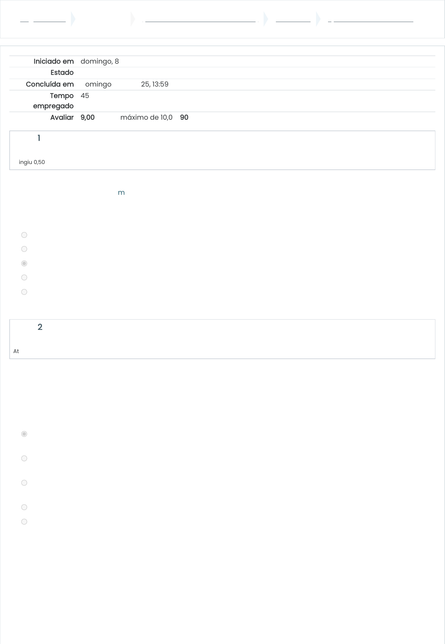 Página inicial Meus cursos [20251.2.13EAAE.1N.POS.0484 51599] Semana 4 Questionário - Semana 4 Iniciado em domingo, 8 jun 2025, 13:13 Estado Finalizada Concluída em domingo, 8 jun 2025, 13:59 Tempo empregado 45 minutos 49 segundos Avaliar 9,00 de um máximo de 10,00(90%) Questão 1 Completo Atingiu 0,50 de 0,50 Questão 2 Completo Atingiu 0,50 de 0,50 Qual das alternativas abaixo melhor representa os principais desafios enfrentados na implementação das Políticas Públicas de Atendimento Educacional Especializado (AEE) no contexto brasileiro? Escolha uma opção: a. A escassez de espaços adequados para atividades extracurriculares. b. A falta de recursos financeiros para a construção de novas escolas inclusivas. c. A falta de formação continuada para professores nas escolas regulares. d. A resistência dos pais em matricular seus filhos em escolas regulares. e. A sobrecarga de trabalho dos professores nas salas de aula comuns. Com base no texto sobre o Atendimento Educacional Especializado (AEE), quais das seguintes alternativas descrevem adequadamente o papel dos recursos pedagógicos e de acessibilidade, como tecnologias assistivas e materiais adaptados, no processo de inclusão escolar para estudantes com deficiência e Altas Habilidades/Superdotação? Escolha uma opção: a. Servem como complementos à formação acadêmica, permitindo que os estudantes desenvolvam habilidades específicas em um ambiente adaptado. b. São considerados substitutivos das atividades do ensino regular, permitindo que os estudantes não frequentem mais as aulas regulares. c. Servem apenas para realizar avaliações de desempenho, sem contribuir para o desenvolvimento de habilidades práticas. d. Proporcionam apenas apoio técnico para a realização de atividades específicas em ambientes informais. e. Focam exclusivamente em atividades recreativas, sem conexão com o aprendizado acadêmico formal. 08/06/2025, 13:59 Questionário - Semana 4: Revisão da tentativa https://ead.ifpi.edu.br/mod/quiz/review.php?attempt=441846&cmid=394270 1/10 https://ead.ifpi.edu.br/ https://ead.ifpi.edu.br/course/view.php?id=6529 https://ead.ifpi.edu.br/course/view.php?id=6529§ion=8 https://ead.ifpi.edu.br/mod/quiz/view.php?id=394270 Questão 3 Completo Atingiu 0,50 de 0,50 Questão 4 Completo Atingiu 0,50 de 0,50 Questão 5 Completo Atingiu 0,50 de 0,50 De que maneira o Atendimento Educacional Especializado (AEE) pode contribuir para o desenvolvimento da autonomia e autoestima dos estudantes, considerando a importância do apoio socioemocional na inclusão escolar? Escolha uma opção: a. Exclusivamente com a oferta de materiais didáticos e pedagógicos, sem foco na diversidade emocional. b. Através de um currículo rígido que ignora as individualidades e limita as opções de aprendizado. c. Limitando-se ao atendimento em centros especializados, sem considerar as necessidades do ensino regular. d. Através da promoção de um ambiente educacional que valoriza as individualidades e potencialidades de cada estudante. e. Por meio de atividades que apenas substituem as aulas regulares, sem considerar o desenvolvimento pessoal. Qual das alternativas a seguir melhor descreve a relação entre o Atendimento Educacional Especializado (AEE) e o ensino comum, considerando a complementaridade e a suplementação dos serviços oferecidos? Escolha uma opção: a. O Atendimento Educacional Especializado (AEE) é opcional e não se relaciona com o ensino comum, pois atende apenas estudantes com dificuldades em aprender. b. O Atendimento Educacional Especializado (AEE) substitui o ensino comum, oferecendo uma formação exclusiva para estudantes com deficiência e Altas Habilidades/Superdotação. c. O Atendimento Educacional Especializado (AEE) é oferecido apenas em horários regulares, sem relação com o contraturno escolar, e não complementa o ensino comum. d. O Atendimento Educacional Especializado (AEE) opera de forma independente do ensino comum, proporcionando atividades que não têm relação com o currículo regular. e. O Atendimento Educacional Especializado (AEE) complementa e suplementa o ensino comum, oferecendo suporte e estratégias que enriquecem a experiência educacional e atendem às necessidades específicas dos estudantes. Qual das seguintes alternativas melhor reflete a importância do Atendimento Educacional Especializado (AEE) para estudantes com Altas Habilidades/Superdotação no contexto da inclusão escolar? Escolha uma opção: a. O AEE é uma modalidade que deve ser realizada apenas em horários regulares, sem possibilidade de contraturno escolar. b. O AEE deve ser considerado uma abordagem secundária à matrícula no ensino regular, oferecendo uma formação limitada. c. O AEE busca apenas atender alunos com deficiência, não oferecendo suporte para estudantes com Altas Habilidades/Superdotação. d. O AEE busca maximizar o potencial e as habilidades dos estudantes, oferecendo intervenções pedagógicas criativas e enriquecedoras no contraturno escolar. e. O AEE é um serviço opcional que as escolas podem ignorar caso não haja demanda de alunos. 08/06/2025, 13:59 Questionário - Semana 4: Revisão da tentativa https://ead.ifpi.edu.br/mod/quiz/review.php?attempt=441846&cmid=394270 2/10 Questão 6 Completo Atingiu 0,50 de 0,50 Questão 7 Completo Atingiu 0,50 de 0,50 Qual das alternativas abaixo melhor descreve a evolução do Atendimento Educacional Especializado (AEE) no Brasil, considerando a transição da educação especial para a educação inclusiva? Escolha uma opção: a. A Política Nacional de Educação Especial assegura que o AEE seja uma atividade secundária, sem ligação com a formação na educação comum. b. O AEE é um serviço obrigatório que deve ser disponibilizado somente a estudantes com dificuldades de aprendizagem. c. O AEE é um programa que se destina exclusivamente a alunos que não frequentam o ensino regular. d. O AEE deve ser oferecido apenas em escola