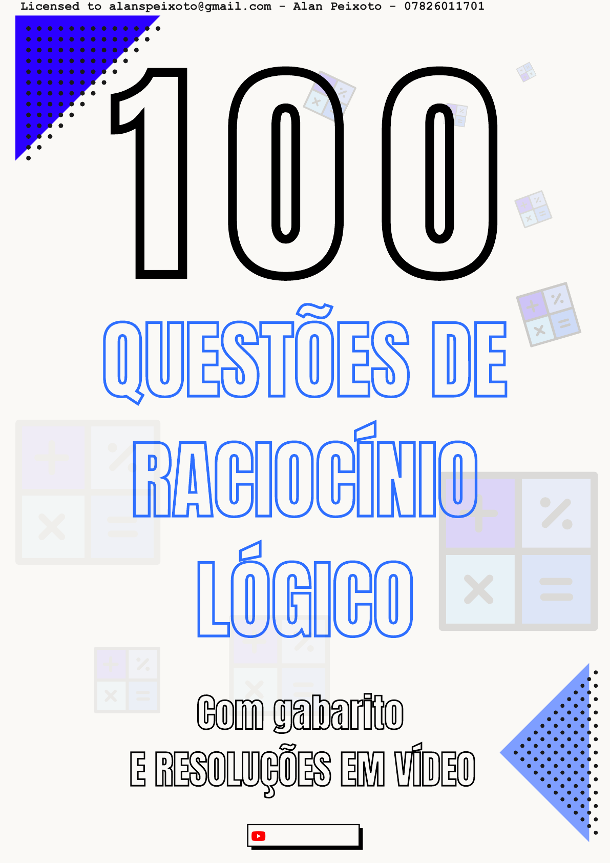 QUESTÕES DEQUESTÕES DE RACIOCÍNIORACIOCÍNIO LÓGICOLÓGICO Canal Marcemática Com gabaritoCom gabarito E RESOLUÇÕES EM VÍDEOE RESOLUÇÕES EM VÍDEO 1 0 01 0 0 Licensed to alanspeixoto@gmail.com - Alan Peixoto - 07826011701 É com muita alegria que eu te desejo BOAS-VINDAS! Obrigado por acompanhar o canal Marcemática nas redes sociais e por adquirir esta apostila. Você pode ter certeza que ela foi feita com muita dedicação e pensando justamente em ajudar você. Espero que aproveite cada questão. Sobre a Apostila deSobre a Apostila de Raciocínio LógicoRaciocínio Lógico Nesta apostila, veremos 100 questões de Raciocínio Lógico resolvidas, passo à passo, em vídeo. Instruções:Instruções: Siga as instruções abaixo para ter o melhor aproveitamento. Desde já te desejo um forte abraço e bons estudos. — Prof.Marcelo do canal Marcemática Canal Marcemática Licensed to alanspeixoto@gmail.com - Alan Peixoto - 07826011701 Para ver a resolução da questão que você desejar, basta clicar em cima da figura que estará ao lado da questão. No final da apostila, na página 26, contém o gabarito de cada uma das questões. Bons estudos! Nossas redes sociais:Nossas redes sociais: Clique na rede social do canal que você deseja acessar! Suporte: canalmarcematica@gmail.com Licensed to alanspeixoto@gmail.com - Alan Peixoto - 07826011701 https://youtube.com/@marcematica9223?si=sdJbTvL6YMpHaf7w https://www.instagram.com/canalmarcematica/ https://t.me/canalmarcematica https://www.tiktok.com/@marcematica 1) Se Célia tem um celta e Olinda tem um opala, a dona do fusca é: a) Fabiana b) Jovana c) Bruna d) Carolina 2) Se Bruna é calma, Bia é decidida e João é mal, então Lara é: a) boa b) mau c) gentil d) perfeito 3) Decifre o código lógico: PET a) 20615 b) 15206 c) 20516 d) 16520 4) Qual o quinto nome seguindo a lógica? Carol- Emily- Telma- ? a) Alice b) Lilian c) Isabel d) Laura e) Pâmela Questões de Raciocínio LógicoQuestões de Raciocínio Lógico Página 1Canal Marcemática Licensed to alanspeixoto@gmail.com - Alan Peixoto - 07826011701 https://youtu.be/5i51TcvDi5c?si=2bpAkB_0FnHWMENk&t=82 https://youtu.be/SGDwABN5Om8?si=BqG5laI6w97EUO2w&t=108 https://youtu.be/FXpKIsvHI_0?si=KL14rOJm_zYuyEML&t=99 https://youtu.be/swWSHmPK9F8?si=1U9V48NwOSwokbhe&t=90 5) Se tenho 4 gatos vendo 3 gatos e ganho mais 5 gatos, com quantos gatos eu fico? a) 9 b) 6 c) 12 d) 8 6) Se José tem 4 anos, Daniel tem 9, Florentino tem 36, João tem: a) 1 b) 9 c) 16 d) 38 7) Se tomei banho, bebi suco e lanchei lasanha, estudei: a) redação b) matemática c) história d) inglês e) lógica 8) Se lanchei abacaxi e almocei abacate, então jantei: a) banana b) macarrão c) couve d) cenoura Página 2Canal Marcemática Licensed to alanspeixoto@gmail.com - Alan Peixoto - 07826011701 https://youtu.be/YHSYHAZTTIQ?si=1cCST7pMDK-21Xnh&t=69 https://youtu.be/oj1MhfPvShI?si=l46LXzrAT5uA3UrZ&t=106 https://youtu.be/Ggsm6Kth1Fo?si=ZfvVa_nYTYEvBVHl&t=108 https://youtu.be/5bocs85IkLE?si=Lp-XdvHSGRKi0WjL&t=69 9) Se Ana é 6 e Paulo é 120, Joveno é: a) jovem b) 6 c) 360 d) 720 10) Se Alice entrou 5 vezes, quantas vezes ela saiu? a) 5 b) 4 c) 6 d) nenhuma 11) A próxima palavra é: Galileu- Dor- Figo- Peixe- ? a) barco b) celular c) alface d) garota 12) Se joguei peteca, pulei corda e comi açaí, então estudei: a) geometria b) física c) biologia d) álgebra e) história Página 3Canal Marcemática Licensed to alanspeixoto@gmail.com - Alan Peixoto - 07826011701 https://youtu.be/4Fao_StmVjw?si=qpokY_2tW6Lxe6sU&t=88 https://youtu.be/t6Lu6tCZ3HQ?si=he5b8JhodkZZrmM9&t=108 https://youtu.be/8nRkPqnDggA?si=DKAUnTGGWqY6F8tJ&t=76 https://youtu.be/V1xtQqX7pzI?si=mIaRb7bK63w-6xmB&t=98 13) Se meu carro é prata, meu ônibus é branco, meu caminhão é: a) azul b) amarelo c) verde d) vermelho 14) Quando ela tinha 39 anos, eu tinha 12. Hoje ela tem o dobro da minha idade. Qual a minha idade? a) 21 b) 23 c) 25 d) 27 15) Se Helena bebe leite e Luana bebe água, então quem bebe vinho? a) Ana b) Felipe c) Jéssica d) Gael 16) Se siri é 6, polvo é 8 e lagosta é 12, então lula é: a) 13 b) 11 c) 7 d) 6 Página 4Canal Marcemática Licensed to alanspeixoto@gmail.com - Alan Peixoto - 07826011701 https://youtu.be/4eyzZkl0NfY?si=Th0ffmJpJbxYIXex&t=109 https://youtu.be/rZugKV9My5I?si=Z5aIbXnoUlShb-i2&t=82 https://youtu.be/qceblosEIs8?si=37ruI7cj8Y1a6ffS&t=93 https://youtu.be/xrpUbQeaFmQ?si=uFC86X_KmGO8nSLP&t=83 17) Se Messi tinha 24 anos, Neymar terá 35, Cristiano terá: a) 81 b) 80 c) 63 d) 38 18) Num carro está: 1 avô, 2 pais, 2 filhos e 1 neto quantas pessoas há no carro? a) 6 b) 5 c) 4 d) 3 19) Se Silvia tem um coelho e Mara tem uma vaca, quem será o dono da ovelha? a) Renata b) Raimundo c) Jorge d) Gabriel 20) Se mamão é 3, maçã 3 e banana é 3, então, Caju é: a) 2 b) 3 c) 4 d) 5 Página 5Canal Marcemática Licensed to alanspeixoto@gmail.com - Alan Peixoto - 07826011701 https://youtu.be/Njv3uQhG1kQ?si=riAqgAc831UCmX_V&t=96 https://youtu.be/Zgq5cc9FrKU?si=EXTwONcg-XA-Q6Bm https://youtu.be/vKYnAcKur50?si=SJGIVbVeSv5ZHBtj&t=82 https://youtu.be/NZ-hJ-xsjgo?si=4ETAXvsfIKK__69e&t=102 21) Qual a negação de “Todos os políticos são ladrões”? a) Nenhum político é ladrão. b) Não existe políticos ladrões. c) Todos os políticos são honestos. d) Algum político não é ladrão. 22) A próxima palavra é: Pá- Xale- Japeri- ? a) Casa b) Café c) Roupa d) Anseio 23) Se Fábia tem um Fusca e Caroline tem um Chevette a dona do Opala é ? a) Olívia b) Odete c) Olga d) Ohana 24) Qual a negação de “Nenhuma vaca voa”? a) Pelo menos uma vaca voa. b) Alguns animais que voam são vacas. c) Todas as vacas voam. d) Todos os animais que voam são vacas. Página 6Canal Marcemática Licensed to alanspeixoto@gmail.com - Alan Peixoto - 07826011701 https://youtu.be/GG34dKHSdlI?si=4Riu1h1H8-60xnjy&t=94 https://youtu.be/PcwEL5Yip60?si=0Een7GoblF2Lw2kk&t=90 https://youtu.be/o23YTPclCJE?si=iMeYBJZ8EhNc-n-H&t=83 https://youtu.be/z2kd