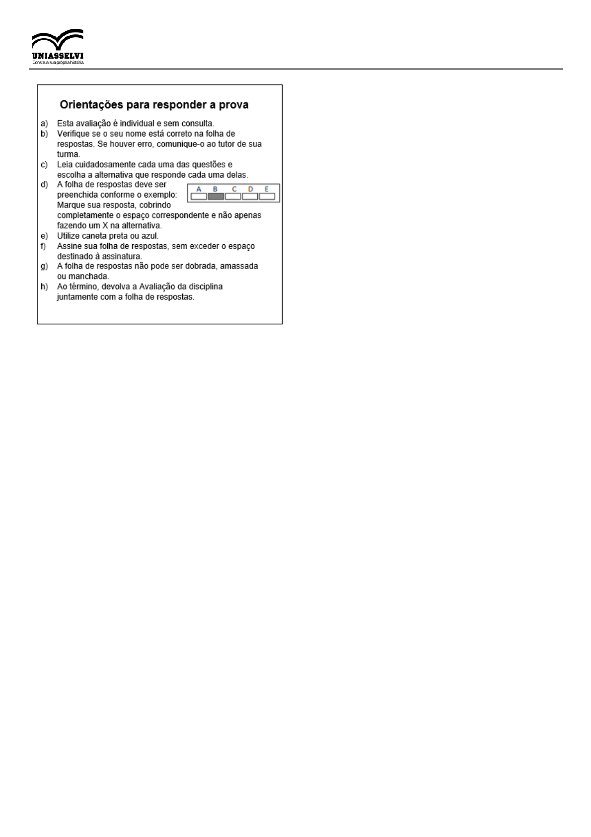 28/09/2022 17:53 Impresso de Prova - Grupo UNIASSELVI https://www.uniasselvi.com.br/extranet/o-2.0/prova_ead/impressao_v2/impressao_prova_html.php 1/5 1.A glicólise é uma das principais etapas do processo de metabolização dos carboidratos, ou seja, do conjunto de transformações químicas que os carboidratos sofrem no interior das células dos organismos vivos. Assim, considerando a glicólise, classifique V para as sentenças verdadeiras e F para as falsas: ( ) É o processo de catabolismo da glicose. ( ) É o processo de anabolismo da glicose. ( ) É a etapa inicial do metabolismo dos carboidratos. ( ) É a etapa que gera mais energia no metabolismo de carboidratos. Assinale a alternativa que apresenta a sequência CORRETA: A. ( ) V - F - V - F. B. ( ) F - V - F - V. C. ( ) V - F - V - V. D. ( ) F - V - V - F. 2. Como bactérias fotossintéticas, algas verdes e plantas vasculares podem usar o dióxido de carbono da atmosfera como sua única fonte de carbono, a partir do qual formam todas as suas biomoléculas constituídas de carbono. Alguns, como as cianobactérias, também podem utilizar nitrogênio atmosférico para gerar todos os seus componentes. Como são conhecidos esses seres? A. ( ) Herbívoros. B. ( ) Heterotróficos. C. ( ) Autotróficos. D. ( ) Eucariontes. 3. São as ligações que ocorrem entre as moléculas de água e que são fundamentais nos processos bioquímicos celulares. Do que estamos falando? A. ( ) Interações hidrofílicas. B. ( ) Ligações de hidrogênio. C. ( ) Covalentes polares. D. ( ) Covalentes apolares. 4. As moléculas de acetil-CoA sofrem uma oxidação e, ao final, formam-se uma coenzima A intacta e duas moléculas de CO2. Essas reações que garantem a oxidação da acetil- CoA constituem o quê? A. ( ) Ciclo de Krebs. B. ( ) Cadeia fehada. C. ( ) Ciclo celular. D. ( ) Cadeia aberta. 5.A glicose tem fórmula estrutural C6H12O6, contendo grupos alcoólicos e um grupo aldeído, sendo classificada, portanto, como uma aldo- hexose. Se apresenta como um cristal sólido esbranquiçado e de sabor doce, de onde origina seu nome. Assim, considerando a molécula de glicose, classifique V para as sentenças verdadeiras e F para as falsas: ( ) A glicose não é uma molécula de importância para os processos metabólicos da maioria dos seres vivos. ( ) A glicose é uma molécula classificada como um sacarídeo simples. ( ) Por meio da glicólise, a glicose é transformada no piruvato, uma molécula orgânica que contém três átomos de carbono. ( ) O processo de glicólise é o processo de transformação da glicose em carboidratos mais complexos (de maior massa molar). Assinale a alternativa que apresenta a sequência CORRETA: A. ( ) F - V - V - F. B. ( ) F - V - F - V. CENTRO UNIVERSITÁRIO LEONARDO DA VINCI Período Letivo: 2022/2 - Turma: BBI4062/2 - Segunda/Matutino Disciplina: Bioquímica Básica e Metabolismo (17492) Prova: 55898615 - Avaliação Final (Objetiva) - Individual Acadêmico: Danubia Araujo de Oliveira (4328838) 28/09/2022 17:53 Impresso de Prova - Grupo UNIASSELVI https://www.uniasselvi.com.br/extranet/o-2.0/prova_ead/impressao_v2/impressao_prova_html.php 2/5 C. ( ) V - F - V - F. D. ( ) F - V - V - V. 6. A respiração celular acontece em três estágios principais. O primeiro, a glicólise, ocorre quando a glicose é transformada em duas moléculas de piruvato. Esse estágio acontece onde? A. ( ) Bitosol. B. ( ) Vitosol. C. ( ) Citosol. D. ( ) Zitosol. 7.Muitas moléculas podem interagir em reações ácido-base, ocasionando uma modificação funcional em suas propriedades. Por isso, para que os organismos vivos funcionem adequadamente, é fundamental a existência de ambientes em que o pH se mantenha estável. Neste contexto, os sistemas tampão executam um papel essencial. Sobre estes sistemas, classifique V para as sentenças verdadeiras e F para as falsas: ( ) O fenômeno que leva ao aumento do pH é chamado de alcalose. ( ) Tampões são sistemas aquosos que tendem a resistir a mudanças de pH quando pequenas quantidades de ácido ou base são adicionadas. ( ) A medida do pH é um dos procedimentos usados com mais frequência na bioquímica, pois o pH influencia na estrutura e na atividade de compostos biológicos. ( ) No interior das células, o pH é mantido em torno de 7, ou seja, o ambiente celular é levemente básico. Assinale a alternativa que apresenta a sequência CORRETA: A. ( ) F - V - F - V. B. ( ) F - V - V - F. C. ( ) V - V - V - F. D. ( ) V - F - V - V. 8. É uma forma de anemia causada por uma mutação que faz com que a forma da hemácia seja modificada, levando ao transporte ineficiente de oxigênio. Do que estamos falando? A. ( ) Talassemia. B. ( ) Anemia hemolítica. C. ( ) Anemia falciforme. D. ( ) Leucemia. 9. O corpo humano, no decorrer de nossas vidas, sofre com as mais diversificadas mudanças, sejam elas corporais, funcionais, estruturais ou patológicas. A grande maioria dos processos bioquímicos ocorrem no interior das células do nosso corpo. Com relação a esse contexto, podemos afirmar que: A. ( ) Os processos metabólicos ocorrem, geralmente, fora do ambiente celular. B. ( ) O corpo humano é classificado como um organismo multicelular. C. ( ) Os diferentes tipos de células encontrados no corpo humano podem ser estudados por processos in vivo, ou seja, processos biológicos que têm lugar fora dos sistemas vivos. D. ( ) A grande maioria das células do corpo humano são classificadas como procariontes. 10. As células fotossintéticas absorvem a energia radiante do sol e a utilizam para retirar elétrons da molécula de água e adicioná-la à molécula de dióxido de carbono, formando produtos ricos em energia. Sobre esses produtos, classifique V para as opções verdadeiras e F para as falsas: ( ) Amido. ( ) Sacarose. ( ) Celulose. ( ) Polissacarídeo. Assinale a alternativa que apresenta a sequência CORRETA: A. ( ) F - F - V - F. B. ( ) V - V - F - F. C. ( ) V - F - V - F. D. ( ) F - V - V