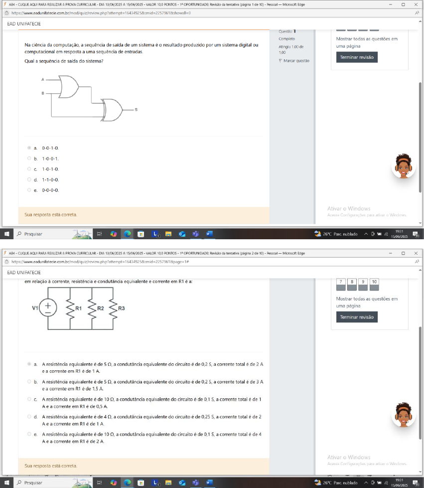 AB4 CLIQUE AQUI PARA REALIZAR PROVA CURRICULAR DIA 13/06/2025 A 15/06/2025 VALOR 10.0 PONTOS Revisão da tentativa de 10) Pessoal - Microsoft Edge EAD UNIFATECIE Questão Completo Mostrar todas as questões em Na ciência da computação, a sequência de saída de um sistema é resultado produzido por um sistema digital ou Atingiu 1.00 de uma página computacional em resposta a uma sequência de Terminar revisão Qual sequência de saída do sistema? P Marcar questão A B 0-0-1-0 b. 1-0-1-0 d. 0-0-0-0 Ativar Windows Sua resposta está correta. Acesse Configurações para ativar Windows a Pesquisar 19:31 L 26°C nublado ^ 15/06/2025 AB4 CLIQUE AQUI PARA REALIZAR PROVA CURRICULAR DIA 13/06/2025 A 15/06/2025 VALOR 10.0 PONTOS Revisão da tentativa de 10) Pessoal - Microsoft Edge A EAD UNIFATECIE em relação à corrente, resistência e condutância equivalente e corrente em R1 é a: 7 8 9 10 Mostrar todas as questões em V1 R1 R2 R3 uma página Terminar revisão A resistência equivalente é de 5 a condutância equivalente do circuito é de a corrente total é de 2 A e a corrente em R1 é de A A resistência equivalente é de a condutância equivalente do circuito é de a corrente total é de 3 A e a corrente em R1 é de 1,5 A. A resistência equivalente é de a condutância equivalente do circuito é de a corrente total é de 1 A e a corrente em R1 é de 0,5 A d. A resistência equivalente é de 4 a condutância equivalente do circuito é de 0.25 S a corrente total é de 2 A e a corrente em R1 é de A A resistência equivalente é de a condutância equivalente do circuito é de a corrente total é de 4 A e corrente em R1 é de 2 A Ativar Windows Sua resposta está Acesse Configurações para ativar Windows 19:31 a Pesquisar L. 26°C Parc. nublado ^ 15/06/2025, AB4 CLIQUE AQUI PARA REALIZAR A PROVA CURRICULAR DIA A 15/06/2025 VALOR 10.0 PONTOS Revisão da tentativa de 10) Pessoal - Microsoft Edge EAD UNIFATECIE AUTOMAÇÃO INDUSTRIAL Questão 3 Completo Navegação do JFET ou transistor de efeito de campo de junção é um dos tipos mais simples de transistor de efeito de campo. Ao Atingiu 1,00 de contrário do transistor de junção bipolar, os JFETs são dispositivos controlados por tensão. No JFET, fluxo de questionário 1.00 corrente é devido à maioria dos portadores de carga. P Marcar questão 1 2 3 4 5 6 7 8 9 10 Analisando um dispositivo JFET vemos que a corrente de saturação do dreno é menor que então esse dispositivo age como um. Mostrar todas as questões em uma página a Fonte de Terminar revisão b. Fonte de tensão. d. TJB. Sua resposta está correta. Ativar Windows Acesse Configurações para ativar Windows 19:31 a Pesquisar L 26°C nublado 1 15/06/2025 AB4-CLIQUE AQUI PARA REALIZAR A PROVA CURRICULAR DIA 13/06/2025 A 15/06/2025 VALOR 10.0 PONTOS OPORTUNIDADE Revisão da tentativa (página de 10) Pessoal - Microsoft Edge EAD UNIFATECIE Questão 4 Completo Determine as transformadas de Laplace das funções a Navegação do Atingiu 1,00 de questionário - 1.00 P Marcar questão 1 2 3 4 5 6 7 8 9 10 Assinale a alternativa que apresenta as transformadas Mostrar todas as questões em uma página 5S 1 4 Terminar revisão H(s) = + e P(s) b. S 1 H(s) P(s) 8,415 H(s) P(s) d. 8,415 6 H(s) 2 1 4 e. H(s) + e P(s) Sua resposta está Ativar Windows Acesse Configurações para ativar Windows 19:32 a Pesquisar 26°C Parc nublado 15/06/2025AB4 AQUI PARA REALIZAR A PROVA CURRICULAR DIA 13/06/2025 A 15/06/2025 VALOR PONTOS Revisão da tentativa de 10) - Microsoft Edge EAD UNIFATECIE características dos capacitores e uma página Terminar revisão I. Em um circuito que apresenta regime de corrente (CC), um capacitor funcionará como um circuito aberto. II. Um capacitor real apresenta um resistor associado em paralelo, o qual pode ser desprezado devido ao valor quase nulo que possui. III. Em um circuito que apresenta regime de corrente (CC), um indutor funcionará como um circuito aberto, impedindo o fluxo da corrente. IV. Apesar do indutor ser feito com material condutor, o indutor real apresenta uma resistência associada em série, a qual, geralmente, é desprezada Está correto apenas o que se afirma em: a. IV. b. III. C. III. d. III. e. le IV. Ativar Windows Acesse Configurações para ativar Windows Sua resposta está 19:32 a Pesquisar L 26°C nublado ^ 15/06/2025 AB4 AQUI PARA REALIZAR A PROVA CURRICULAR DIA 13/06/2025 A 15/06/2025 VALOR 10.0 PONTOS OPORTUNIDADE Revisão da tentativa (página de 10) Pessoa - Microsoft Edge EAD UNIFATECIE AUTOMAÇÃO INDUSTRIAL Questão 6 Completo A resistência do diodo é a resistência que um diodo oferece em um circuito. Navegação do Atingiu 1,00 de questionário Assim como um resistor ou qualquer outra carga (motor ou lâmpada) em um circuito, um diodo tem uma resistência 1.00 elétrica 1 2 P Marcar questão 3 4 5 6 Partindo da análise do datasheet do 1N4001 a resistência do corpo deste diodo é de: 7 8 9 10 0,23 Mostrar todas as questões em uma página b. Terminar revisão 00 d. 10 Sua resposta está correta. Ativar o Windows Acesse Configurações para ativar o Windows - Página anterior Próxima página 19:32 a Pesquisar L 26°C nublado ^ 15/06/2025AB4 CLIQUE AQUI PARA REALIZAR A PROVA CURRICULAR - DIA 13/06/2025 A 15/06/2025 VALOR 10,0 PONTOS OPORTUNIDADE Revisão da tentativa de 10) Pessoal Microsoft Edge EAD UNIFATECIE Questão 7 Completo Navegação do Qual é a diferença entre circuitos sequenciais e assincronos? Selecione as alternativas Atingiu 0.00 de questionário P Marcar questão 1 2 3 4 5 6 I Circuitos sequenciais síncronos são projetados com flip-flops, enquanto os utilizam II Circuitos sequenciais síncronos possuem um sinal de relógio que sincroniza todas as operações, enquanto os 7 8 9 10 assincronos não dependem de um sinal de relógio. III Circuitos sequenciais funcionam apenas em sistemas digitais, enquanto os assincronos podem ser Mostrar todas as questões em utilizados em sistemas analógicos e uma página I
