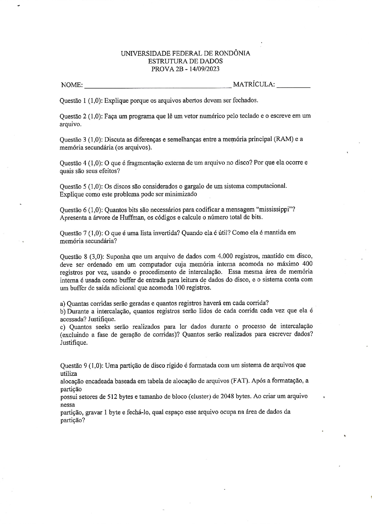 UNIVERSIDADE FEDERAL DE RONDÔNIA ESTRUTURA DE DADOS PROVA 2B 14/09/2023 NOME: MATRÍCULA: Questão 1 (1,0): Explique porque os arquivos abertos devem ser fechados. Questão 2 (1,0): Faça um programa que um vetor numérico pelo teclado e o escreve em um arquivo. Questão 3 (1,0): Discuta as diferenças e semelhanças entre a memória principal (RAM) e a memória secundária (os arquivos). Questão 4 (1,0): que é fragmentação externa de um arquivo no disco? Por que ela ocorre e quais são seus efeitos? Questão 5 (1,0): Os discos são considerados o gargalo de um sistema computacional. Explique como este problema pode ser minimizado Questão 6 (1,0): Quantos bits são necessários para codificar a mensagem "mississippi"? Apresenta a árvore de Huffman, os códigos e calcule o número total de bits. Questão 7 (1,0): O que é uma lista invertida? Quando ela é útil? Como ela é mantida em memória secundária? Questão 8 (3,0): Suponha que um arquivo de dados com 4.000 registros, mantido em disco, deve ser ordenado em um computador cuja memória interna acomoda no máximo 400 registros por vez, usando o procedimento de intercalação. Essa mesma área de memória interna é usada como buffer de entrada para leitura de dados do disco, e o sistema conta com um buffer de saída adicional que acomoda 100 registros. a) Quantas corridas serão geradas e quantos registros haverá em cada corrida? b) Durante a intercalação, quantos registros serão lidos de cada corrida cada vez que ela é acessada? Justifique. c) Quantos seeks serão realizados para ler dados durante o processo de intercalação (excluindo a fase de geração de corridas)? Quantos serão realizados para escrever dados? Justifique. Questão 9 (1,0): Uma partição de disco rígido é formatada com um sistema de arquivos que utiliza alocação encadeada baseada em tabela de alocação de arquivos (FAT). Após a formatação, a partição possui setores de 512 bytes e tamanho de bloco (cluster) de 2048 bytes. Ao criar um arquivo nessa partição, gravar 1 byte e fechá-lo, qual espaço esse arquivo ocupa na área de dados da partição?UNIVERSIDADE FEDERAL DE RONDÔNIA ESTRUTURA DE DADOS PROVA 3A DATA: / ALUNO: Questão 1 (1,0): Uma árvore B é um tipo de árvore que se mantém balanceada com o decorrer do tempo. Para tanto, ela usa uma série de operações que garantem a manutenção de uma série de propriedades importantes, uma das quais é a ordem da árvore que pode ser definida como o número máximo de elementos que podem ser armazenados em um nó da árvore. Com base nesses conceitos, qual das situações a seguir representa uma propriedade das árvores B? A) Em uma árvore B de ordem maior do que 1, não é permitido que uma folha armazene apenas um elemento. B) Em uma árvore B de ordem d, a raiz armazena um número de elementos n tal que 2d. C) Em uma árvore B de ordem d, pode haver folhas em alturas diferentes da árvore até que tenham sido inseridos, pelo menos, 2d+1 elementos. D) Em um nó de uma árvore B que contenha n elementos não vazios, podem-se ter, no máximo, n/2 ponteiros apontando para vazio (nil ou null). E) Em um nó interno de uma árvore B que contenha n elementos, têm-se exatamente n+1 ponteiros que não apontam para vazio (nil ou null). Questão 2 (2,0): Qual a diferença entre uma árvore B e uma B*? Quais as vantagens da árvore B*? Quais as desvantagens? Como se compara a altura mínima dessas árvores Questão 3 (2,0): o que é uma árvore B virtual? Como implementá-la ? Quais as vantagens e desvantagens? Questão 4 (2,0): Mostre a cada passo, as árvores que resultam depois de remoção das chaves A, B, Q e R da árvore-B de ordem 5 na figura a seguir: M DH QU ABC EFG IJKLNO RST VW Questão 5 (2,0): Criar uma árvore-B+ pela inserção das chaves A, B, C, D, E, F, G, H, I e J, nesta ordem Ordem da árvore: 3 -Blocos mínimo de 2 registros máximo de 3 registrosUNIVERSIDADE FEDERAL DE RONDÔNIA ESTRUTURA DE DADOS PROVA REPOSITIVA 17/10/2023 ALUNO: Questão 1 (1,0): Ache a Árvore Geradora Mínima do grafo abaixo utilizando o Algoritmo de Prim começando do vértice A do grafo a seguir. A B C D E F G H I J A 0 15 10 19 0 0 0 0 0 B 15 0 0 7 17 0 0 C 10 0 0 16 0 14 0 D 19 7 16 0 12 6 3 E 0 17 0 12 0 0 20 13 0 0 F 0 0 14 6 0 0 9 0 5 0 G 0 0 3 20 9 0 4 1 11 H 0 0 13 0 4 0 0 2 I 00000510 18 J 0 0 0 0 0 0 11 2 18 0 Questão 2 (2,0): Seja um grafo G cujos vértices são os inteiros de 1 a 8 e os vértices adjacentes a cada vértice são dados pela tabela abaixo: Vértice Vértices Adjacentes 1 234 2 134 3 124 4 1236 5 678 6 457 7 568 8 57 (a) Desenhe o grafo G. (b) Represente o grafo por meio de uma matriz de adjacência. (c) Represente o grafo por meio de uma lista de adjacência. (d) Mostre qual é número cromático deste grafo. (e) G é um grafo Euleriano? Por quê? Questão 3 (1,5): As aplicações usualmente armazenam as informações em arquivos organizando-as em campos e registros. Explique as diferentes maneiras pelas quais um campo pode ser armazenado em um arquivo para posterior recuperação. Questão 4 (1,5): Quais as diferenças entre os algoritmos Key-sort e K-way merge sort? Questão 5 (2,0): Mostre a cada passo a configuração de uma árvore-B* de ordem 3 ao se inserirem as chaves: Questão 6 (2,0): Suponha que você vai remover uma chave em uma árvore-B, a qual causa underflow na página. Se pela página irmã do lado direito é necessária concatenação, e pela página irmã do lado esquerdo é possível redistribuição, qual opção você escolheria? Por quê?UNIVERSIDADE FEDERAL DE RONDÔNIA ESTRUTURA DE DADOS PROVA 1 10/08/2023 ALUNO: MATRÍCULA: 1) (1,0) Um grafo não direcionado no qual todos os pares de vértices são adjacentes, isto é, possui arestas ligando todos os vértices entre si, é um grafo: A) Desconexo. B) Completo. C) Ponderado. D) Livre. E) Hipergrafo. 2) (1,0) Qual é a implementação no qual um grafo G (V,A) contendo n vértices é uma matriz nxn