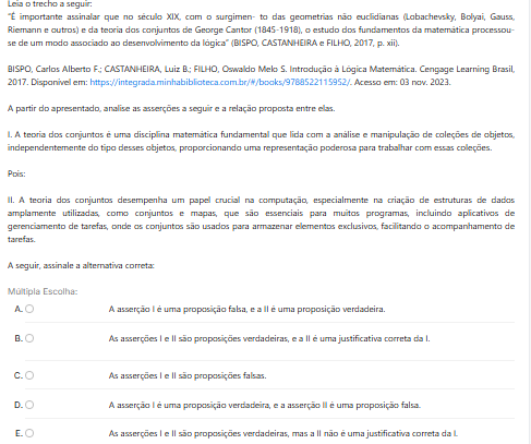 Leia trecho a seguir: importante assinalar que no XIX com surgimen- to das geometrias não euclidianas Bolyai, Gauss, Riemann outros) da teoria das de George o estudo dos fundamentos da processou- se de um moda associado ao desenvolvimento da logica" CASTANHEIRA 2017, p. xii). BISPO, Carlos Alberto F. CASTANHEIRA Luiz B. Oswaldo Melo Introdução à Lógica Cengage Learning Brasil, 2017. Dispanível em: 03 nov. A partir do apresentado, analise as asserções a a relação proposta entre A teoria dos conjuntas uma disciplina fundamental que com a análise manipulação de coleções de independentemente do tipa desses uma representação poderosa para trabalhar com essas A tegria dos conjuntos desempenha um papel crucial na especialmente na criação de estruturas de dados amplamente utilizadas, como conjuntos mapas, que são essenciais para muitos programas, incluindo aplicativos de gerenciamento de tarefas, onde conjuntos são usados para armazenar elementos acompanhamento de A seguir, assinale a alternativa A asserção I é uma proposição a uma proposição B. As I e II são proposições e a uma justificativa correta da I. As I e II são D.O A asserção I uma proposição a asserção uma proposição As I II são proposições mas a não uma justificativa correta da L