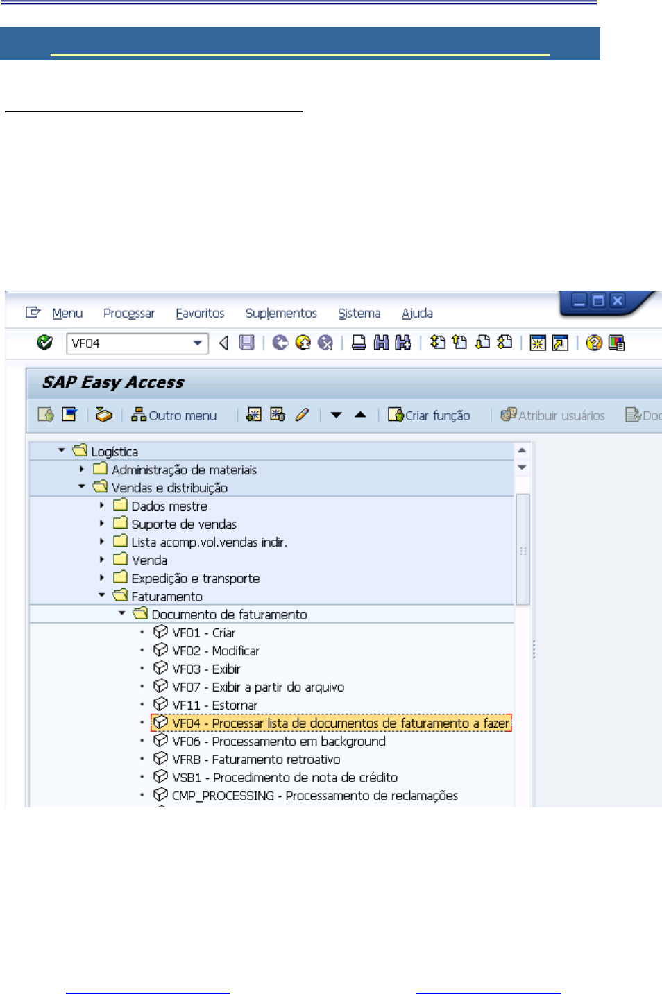 Curso Prático de SD – Aula 5 Sites: www.grandesprojetos.com www.juliobattisti.com.br Página 1 – Última Atualização – 30.10.2021 Proibido o uso deste material em sala de aula e em treinamentos sem autorização do autor. Aula 5 – Processar Lista de Documentos – vf04 Processar Lista de Documentos – vf04 O que é: É liberar os documentos com o status "a fazer". Quando você vai usar: Na ocasião de liberar uma ou várias documentos para o faturamento propriamente dito. Como Fazer: O código da transação é: vf04 Copyright by SAP AG Figura – Transação vf04 Em seguida clique no botão “Exibir lis. Docs faturamento a fazer”. Curso Prático de SD – Aula 5 Sites: www.grandesprojetos.com www.juliobattisti.com.br Página 2 – Última Atualização – 30.10.2021 Proibido o uso deste material em sala de aula e em treinamentos sem autorização do autor. Copyright by SAP AG Figura – Botão – Exibir Docs Copyright by SAP AG Figura – Seleção de Documentos Curso Prático de SD – Aula 5 Sites: www.grandesprojetos.com www.juliobattisti.com.br Página 3 – Última Atualização – 30.10.2021 Proibido o uso deste material em sala de aula e em treinamentos sem autorização do autor. Depois clique na linha (no botão cinza) e selecione uma fatura que deseja exibir (precisa estar com a coluna CGDF como L (Livre). Em seguida clique no botão “Doc. Fat. Individual”. Copyright by SAP AG Figura – Botão Fatura Invididual Copyright by SAP AG Figura – Fatura - Criar Caso queira visualizar as condições de preço da fatura e corrigir algo, clique na moeda (ícone Condições Preço Cabeçalho). Copyright by SAP AG Figura – Botão Condições Preço Cabeçalho Curso Prático de SD – Aula 5 Sites: www.grandesprojetos.com www.juliobattisti.com.br Página 4 – Última Atualização – 30.10.2021 Proibido o uso deste material em sala de aula e em treinamentos sem autorização do autor. Copyright by SAP AG Figura – ABA Condições Por fim clique no botão “Gravar”. Visão Geral do Ambiente de Negócios Muitas empresas realizam este procedimento para realmente fazer um "pente fino" nos documentos enviados para o faturamento para corrigir erros, falhas, etc. Geralmente o erro que dá é na PRICING e é necessário verificar e efetuar uma pequena correção, caso necessário. Este procedimento é comumente utilizado em diversas empresas onde o vendedor gera o documento de faturamento e um faturista ou responsável de logística confere o documento e libera o documento para faturamento.