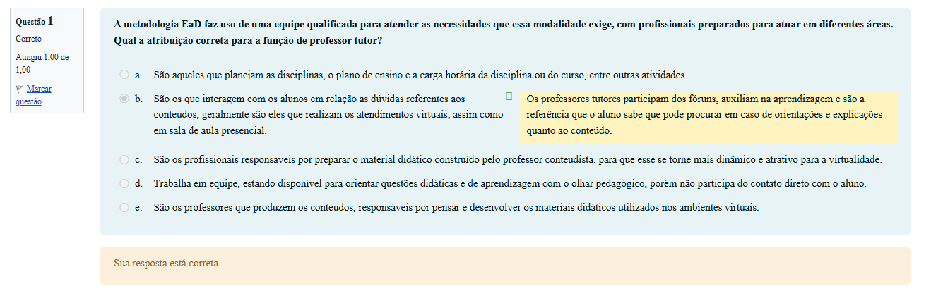 Questão 1 A metodologia EaD faz uso de uma equipe qualificada para atender as necessidades que essa modalidade exige, com profissionais preparados para atuar em diferentes áreas. Correto Qual a atribuição correta para a função de professor tutor? Atingiu 1.00 de 1,00 a. São aqueles que planejam as disciplinas, plano de ensino e a carga horária da disciplina ou do entre outras atividades. Marcar questão b. São os que interagem com os alunos em relação as dúvidas referentes aos Os professores tutores participam dos auxiliam na aprendizagem e são a conteúdos, geralmente são eles que realizam os atendimentos virtuais, assim como referência que aluno sabe que pode procurar em caso de orientações e explicações em sala de aula quanto ao conteúdo. São os profissionais responsáveis por preparar o material didático construido pelo professor conteudista, para que esse se torne mais dinâmico e atrativo para a d. Trabalha em equipe, estando disponível para orientar questões didáticas e de aprendizagem com o olhar porém não participa do contato direto com o aluno. e. São os professores que produzem os conteúdos, responsáveis por pensar e desenvolver os materiais didáticos utilizados nos ambientes virtuais. Sua resposta está correta.