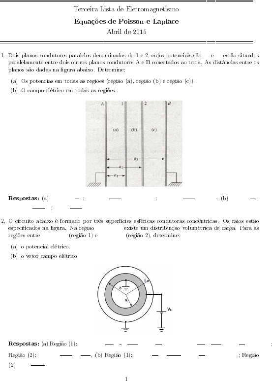 ��������������������������� ��������������������������� Terceira Lista de Eletromagnetismo Equações de Poisson e Laplace Abril de 2015 ��������������������������� ��������������������������� 1. Dois planos condutores paralelos denominados de 1 e 2, cujos potenciais são V1 e V2 estão situados paralelamente entre dois outros planos condutores A e B conectados ao terra. As distâncias entre os planos são dadas na figura abaixo. Determine: (a) Os potencias em todas as regiões (região (a), região (b) e região (c)). (b) O campo elétrico em todas as regiões. Respostas: (a) Va (x) = V1 a1 x; Vb (x) = V1−V2 a1−a2 (x− a1) + V1; Vc (x) = V2a3−a2 (a3 − x). (b) ~Ea = −V1a1 iˆ; ~Eb = − ( V1−V2 a1−a2 ) iˆ; ~Ec = V2 a3−a2 iˆ 2. O circuito abaixo é formado por três superfícies esféricas condutoras concêntricas. Os raios estão especificados na figura. Na região a < r < b existe um distribuição volumétrica de carga. Para as regiões entre a < r < b (região 1) e b < r < c (região 2), determine: (a) o potencial elétrico. (b) o vetor campo elétrico Respostas: (a) Região (1): V (r) = −ρ0r2 6ε0 −1 r { ab (b−a) [ V0 + ρ0 6ε0 (b2 − a2) ]} +ρ0a 2 6ε0 + b (b−a) [ V0 + ρ0 6ε0 (b2 − a2) ] ; Região (2): V (r) = V0 bc r(c−b) − V0b(c−b) . (b) Região (1): ~E = { ρ0r 3ε0 − ab r2(b−a) [ V0 + ρ0 6ε0 (b2 − a2) ]} rˆ; Região (2) ~E = V0 bc r2(c−b) rˆ 1 3. Na região interna de um capacitor de placas planas e paralelas há um distribuição de carga volumé- trica dada por: ρ(x) = ρ0x (x− d) sendo ρ0 uma constante com dimensões apropriadas. Determine: (a) A distribuição de potencial entre as placas do capacitor. (b) A partir do potencial, o vetor campo elétrico. Resposta: (a) V (x) = −ρ0x4 12ε0 + ρ0dx 3 6ε0 − ρ0d3x 12ε0 . (b) ~E = ( ρ0x3 3ε0 − ρ0dx2 2ε0 + ρ0d 3 12ε0 ) iˆ. 4. Duas placas grandes metálicas estão arranjadas de forma que entre elas haja um ângulo α. Ambas estão mantidas a uma tensão V0. As placas estão isoladas entre si no eixo z conforme ilustra a figura. (a) a distribuição de potencial entre as placas. (b) o vetor campo elétrico. Resposta: (a) V = V0 α φ;(b) ~E = V0 αr φˆ 5. Duas placas grandes metálicas paralelas estão a 1 metro de distância. Uma tem o potencial zero e a outra está a 100 volts. Resolva a equação de Laplace na região entre as placas. 2 Resposta:V = 100x 6. Duas grandes superfícies cônicas metálicas são isoladas no vértice e mantidas a uma tensão V0. Determinar a distribuições de potenciais entre os condutores, observando a figura abaixo. Resposta:V = V0 ln ( tg(α12 ) tg(α22 ) ) ln ( tg( θ2) tg(α22 ) ) 7. Duas cascas esféricas concêntricas de raio interno a e externo b (b > a) estão submetidas a uma diferença de potencial V . Admita que o potencial seja zero para r = b e V0 para r = a. Resposta: V = V0a (b−a) ( b r − 1) 8. Um cone metálico está submetido a um potencial V0 quando θ = α e um plano condutor (θ = pi 2 ) está aterrado (V = 0). Determine: (a) a distribuição de potencial entre a cone e o plano (b) o vetor campo elétrico. 3 Resposta: (a) V = V0 ln(tg θ2) ln(tg α2 ) ; (b) ~E = − V0 r sen(θ) ln(tg α2 ) θˆ 9. Denomina-se junção P-N a estrutura fundamental dos componentes eletrônicos constituídos de se- micondutores, principalmente diodos e transistores. Considerando uma junção P-N, como sendo for- mada por duas camadas infinitas de carga de faces paralelas e infinitas, de espessura L e densidade volumétrica uniforme +ρ0 e ρ0, conforme ilustra a figura, e que todas as cargas são fixas, determine o potencial elétrico e vetor campo elétrico paras as regiões:(a) −L < x < 0; (b) 0 < x < +L. Resposta: (a) V (x) = ρ0x 2 2ε0 + ( V0 2L + ρ0L 2ε0 ) x+ V0 2 ~E = − ( ρ0x ε0 + V0 2L + ρ0L 2ε0 ) iˆ (b) V (x) = −ρ0x2 2ε0 + ( V0 2L + ρ0L 2ε0 ) x+ V0 2 ~E = − ( −ρ0x ε0 + V0 2L + ρ0L 2ε0 ) iˆ 4