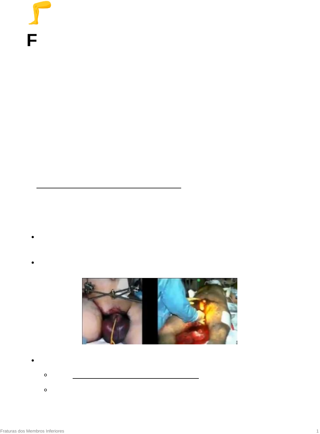 Fraturas dos Membros Inferiores 1 🦵 Fraturas dos Membros Inferiores FRATURAS DA BACIA / QUADRIL Normalmente são as mais graves Ocorrem com traumas de alta energia Geralmente após acidentes automobilísticos ou quedas. Podem levar a morte rapidamente. Manejo com ATLS 1. Lesão do anel pélvico (livro aberto) Abertura da sínfise púbica, fratura perigosa pode ter sangramento de toda volemia do corpo e levar o paciente a morte. Quadro clínico / exame físico Palpa as EIAS e tentar comprimi-las, aproximar uma da outra → verifica se há instabilidade Hematomas em lábios vaginais ou escroto (sinal de Destot) Lesões gastrointestinais (sangramentos), geniturinárias e neurológicas Se há sangramento na uretra não pode sondar! Toque retal: se observar sangue pode indicar lesão da uretra, vagina, anus Fraturas dos Membros Inferiores 2 Sangramento retroperitoneal é sinônimo de gravidade Exame digital Buscar por fraturas expostas: seguir protocolo, limpeza, uso de ATB para evitar contaminação Lesões neurológicas Exame de imagem RX AP, inlet e outlet Fluroscopia: avaliar instabilidade, paciente sedado TC: melhor exame para tratamento definitivo Achados: livro aberto, trauma de cisalhamento (se abre e se eleva), abertura de um lado e compressão do outro Fraturas com rotação externa e cisalhamento vertical tem maior sangramento: aumento de volume Tratamento Hemorragia: pode sangrar todo sangue disponível para o retroperitônio, por isso que precisa fechar, encostar as duas partes da sínfese púbica. Pode passar um lençol para fixar até manejo adequado. Tratar hemorragia Estabilização da fratura → urgente: lençol ou fixador externo por um tempo e posteriormente se fixa de forma interna. Nunca opera na emergência nesses tipos de trauma. FÊMUR Queda própria altura (idoso), dor no local, rotação externa da perna, observar quando a perna estiver encurtada (fratura proximal do fêmur), paciente pode deambular, é mais comum em mulheres pelo fato da osteoporose. Fraturas dos Membros Inferiores 3 Não existe tratamento conservador nesse tipo de lesão, sempre faz tratamento cirúrgico. Tipos de fratura Colo do fêmur Intertrocantérica Diáfise Fratura de colo do fêmur Geralmente idosos, brancos, por volta dos 70 anos, associação com osteoporose (não acontece no fêmur normal), mais comum em mulheres. Fraturas dos Membros Inferiores 4 Sempre precisa operar devido as possíveis complicações clínicas que podem surgir. → necrose avascular da cabeça do fêmur Quadro clínico Mulher, idosa, caiu (trauma de baixa energia), reclama de dor no quadril e no joelho direito. Pode chegar caminhando. Perna com rotação externa e encurtamento quando comparada a perna sadia. Diagnóstico Raio X Tratamento Cirúrgico em avaliar todos os sistemas, perda sanguínea = choque, SARA Tratamento Não vamos fazer fixação definitiva em politrauma -> mais agressão, aumenta risco de problemas pulmonares Sempre cirúrgico - (crianças tem a possibilidade de não fazer cirurgia) Fixação precoce/estabilização - com tração Estabilizar (tração – foto, feita no próprio fêmur ou tíbia, anestesia pele e perióstea, passa fio metálico de Kirschner, prende estribo e usa uma porcentagem de peso corporal 10-15% para conseguir realinhar o fêmur). Esse não é o melhor método de estabilizar. O melhor método é fixador externo Fixação definitiva por cirurgia, manejo é sempre cirúrgico em adultos. Padrão são as hastes intramedulares bloqueadas (padrão ouro) ou placas (vai parafusos) Sempre que for imobilizar precisa imobilizar as articulações adjacentes. No caso do fêmur precisaria imobilizar articulação do joelho e do quadril (gesso pélvico podálico) → Hastes intra-medulares → padrão ouro → porém, mais invasiva a cirurgia → também podemos colocar placas ENTORSE DO JOELHO Após rotação do joelho, quando o movimento articular excede o seu limite fisiológico, ocasionando uma sobrecarga dos ligamentos e cápsula articular. Fraturas dos Membros Inferiores 8 Pode ocorrer praticando esportes, trabalhando ou até mesmo em uma caminhada (porém mais difícil). Entorse pode causar lesão de qualquer uma dessas estruturas Mais comumente: → Menisco → Ligamento cruzado anterior Menos comumente: → Ligamento cruzado posterior → é uma lesão grave. Limitante para atividades físicas → Ligamentos colaterais mediais e laterais Diagnóstico Precisa pedir uma eco para diagnosticar, RX apenas descarta fraturas RM: padrão ouro, normalmente não se usa a não ser que a instabilidade e dor permaneçam Podem estar lesados: ligamentos cruzados, ligamentos laterais e menisco Podemos pensar numa possível lesão ligamentar quando o paciente informa que o joelho inchou logo após o trauma. Esse inchaço não é decorrente do processo inflamatório em si, mas sim da lesão de vasos sanguíneos dentro do joelho (por lesão do ligamento cruzado, provavelmente). Uma eco informa presença de líquido dentro da cavidade articular (não tem como saber se é sangue ou não). Fazer punção é contraindicado. Tratamento inicial Imobilização de Jones Protocolo PRICE: proteção, repouso, gelo, compressão e elevação Fraturas dos Membros Inferiores 9 Após 1 semana examina, não dá para examinar na fase aguda por causa da dor intensa Exame físico ✍ Teste de McMurray: Com o paciente em decúbito dorsal, joelho flexionado a 90° ou mais, o examinador segura no pé e tornozelo, provocando uma rotação externa da tíbia sob o fêmur (para estressar o menisco medial) ou uma rotação interna da tíbia sob o fêmur (para estressar o menisco lateral); em seguida, estende passivamente o joelho mantendo a rotação tibial. O sentimento de dor associada a um “estalo” indica teste positivo para lesão meniscal 🗄 Teste da gaveta: testa o ligamento cruzado anterior e posterior. Com o paciente emdecúbito dorsal, joelho flexionado em torno de 80° e o pé tocando a mesa de exame, o e