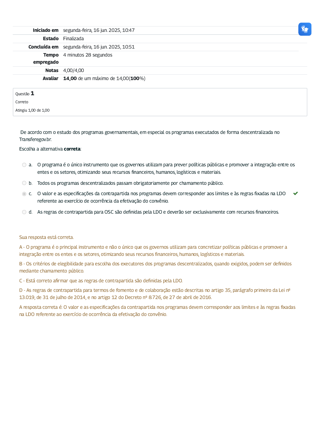 Iniciado em segunda-feira, 16 jun. 2025, 10:47 Estado Finalizada Concluída em segunda-feira, 16 jun. 2025, 10:51 Tempo empregado 4 minutos 28 segundos Notas 4,00/4,00 Avaliar 14,00 de um máximo de 14,00(100%) Questão 1 Correto Atingiu 1,00 de 1,00 De acordo com o estudo dos programas governamentais, em especial os programas executados de forma descentralizada no Transferegov.br. Escolha a alternativa correta: a. O programa é o único instrumento que os governos utilizam para prever políticas públicas e promover a integração entre os entes e os setores, otimizando seus recursos financeiros, humanos, logísticos e materiais. b. Todos os programas descentralizados passam obrigatoriamente por chamamento público. c. O valor e as especificações da contrapartida nos programas devem corresponder aos limites e às regras fixadas na LDO referente ao exercício de ocorrência da efetivação do convênio. d. As regras de contrapartida para OSC são definidas pela LDO e deverão ser exclusivamente com recursos financeiros. Sua resposta está correta. A - O programa é o principal instrumento e não o único que os governos utilizam para concretizar políticas públicas e promover a integração entre os entes e os setores, otimizando seus recursos financeiros, humanos, logísticos e materiais. B - Os critérios de elegibilidade para escolha dos executores dos programas descentralizados, quando exigidos, podem ser definidos mediante chamamento público. C - Está correto afirmar que as regras de contrapartida são definidas pela LDO. D - As regras de contrapartida para termos de fomento e de colaboração estão descritas no artigo 35, parágrafo primeiro da Lei nº 13.019, de 31 de julho de 2014, e no artigo 12 do Decreto nº 8.726, de 27 de abril de 2016. A resposta correta é: O valor e as especificações da contrapartida nos programas devem corresponder aos limites e às regras fixadas na LDO referente ao exercício de ocorrência da efetivação do convênio. Questão 2 Correto Atingiu 1,00 de 1,00 De acordo com o estudo dos programas governamentais, em especial os programas executados de forma descentralizada no Transferegov.br. Escolha a alternativa correta: a. Os órgãos ou entidades públicas ou privadas sem fins lucrativos que pretendam celebrar convênios e contratos de repasse com a administração pública federal poderão realizar cadastramento prévio no Transferegov.br ou em sistemas similares indicados pelo concedente//repassador. b. O cadastro dos programas conterá descrição, exigências, padrões, procedimentos, critérios de elegibilidade e de prioridade e outros elementos que possam auxiliar a avaliação das necessidades locais. c. Os instrumentos operacionados no módulos de Transferências O plano de trabalho estabelecerá diretrizes e objetivos os critérios de enquadramento da proposta, visando atingir melhores resultados na execução do objeto, considerando, entre outros aspectos, a aferição da qualificação técnica e da capacidade gerencial do proponente. Sua resposta está correta. A) Errada. O cadastramento prévio no Transferegov.br é obrigatório. Do cadastramento e dos registros dos atos no Transferegov.br, conforme dispõe o artigo 8º da Portaria Conjunta MGI/MF/CGU nº 33/2023: Art. 8º: Os órgãos ou entidades públicas ou privadas sem fins lucrativos que pretendam celebrar convênios e contratos de repasse com a administração pública federal deverão realizar cadastramento prévio no Transferegov.br. B) Correta. Literalidade do parágrafo 1º do artigo 16 da Portaria Conjunta MGI/MF/CGU nº 33/2023: Art. 16. Para a execução dos instrumentos regulados por esta Portaria Conjunta, os órgãos e entidades da administração pública federal deverão cadastrar, anualmente, no Transferegov.br, os programas a serem executados de forma descentralizada e, quando couber, critérios para a seleção do proponente. § 1º O cadastro dos programas de que trata o caput conterá descrição, exigências, padrões procedimentos, critérios de elegibilidade e de prioridade e outros elementos que possam auxiliar a avaliação das necessidades locais. C) Errada. As diretrizes e objetivos são definidos no Programa e não no Plano de Trabalho. Conforme determina o parágrafo 2º do artigo 16. Art. 16. Para a execução dos instrumentos regulados por esta Portaria Conjunta, os órgãos e entidades da administração pública federal deverão cadastrar, anualmente, no Transferegov.br, os programas a serem executados de forma descentralizada e, quando couber, critérios para a seleção do proponente. (...) § 2º Os critérios de enquadramento da proposta ao programa deverão ser estabelecidos de forma objetiva, com base nas diretrizes e objetivos dos respectivos programas, visando atingir melhores resultados na execução do objeto, considerando, entre outros aspectos, a aferição da qualificação técnica e da capacidade gerencial do proponente. A resposta correta é: O cadastro dos programas conterá descrição, exigências, padrões, procedimentos, critérios de elegibilidade e de prioridade e outros elementos que possam auxiliar a avaliação das necessidades locais. Questão 3 Correto Atingiu 1,00 de 1,00 Questão 4 Correto Atingiu 1,00 de 1,00 Conforme apresentado no Módulo 1, Unidade 2, quem deve registrar o programa no Transferegov.br para que políticas públicas sejam executadas? Escolha a opção correta: a. Convenente. b. Concedente. c. Proponente. d. OSC. e. Todas as anteriores. Sua resposta está correta. O registro do conjunto de regras para execução da política pública de cada órgão deve ser realizada pelo concedente, ou seja, os representantes do governo federal responsáveis por divulgar as políticas de seus órgãos. A resposta correta é: Concedente. Dentre as opções relacionadas a divulgação de um Programa de Governo. Escolha a opção correta: a. A divulgação dos programas para atendimento às emendas parlamentares in