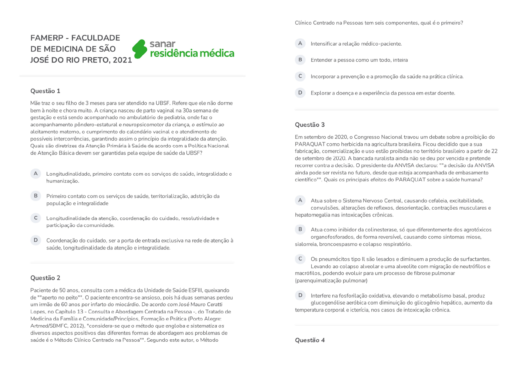 Clínico Centrado na Pessoas tem seis componentes, qual é o primeiro? FAMERP FACULDADE sanar A Intensificar a relação médico-paciente. DE MEDICINA DE SÃO residência médica JOSÉ DO RIO PRETO, 2021 B Entender a pessoa como um todo, inteira C Incorporar a prevenção e a promoção da saúde na prática clínica. Questão 1 D Explorar a doença e a experiência da pessoa em estar doente. Mãe traz o seu filho de 3 meses para ser atendido na UBSF. Refere que ele não dorme bem à noite e chora muito. A criança nasceu de parto vaginal na 30a semana de gestação e está sendo acompanhado no ambulatório de pediatria, onde faz acompanhamento pôndero-estatural e neuropsicomotor da criança, o estímulo ao Questão 3 aleitamento materno, o cumprimento do calendário vacinal e o atendimento de possíveis intercorrências, garantindo assim o princípio da integralidade da atenção. Em setembro de 2020, o Congresso Nacional travou um debate sobre a proibição do Quais são diretrizes da Atenção Primária à Saúde de acordo com a Política Nacional PARAQUAT como herbicida na agricultura brasileira. Ficou decidido que a sua de Atenção Básica devem ser garantidas pela equipe de saúde da UBSF? fabricação, comercialização e uso estão proibidas no território brasileiro a partir de 22 de setembro de 2020. A bancada ruralista ainda não se deu por vencida e pretende recorrer contra a decisão. presidente da ANVISA declarou: ""a decisão da ANVISA A Longitudinalidade, primeiro contato com os serviços de saúde, integralidade e ainda pode ser revista no futuro, desde que esteja acompanhada de embasamento humanização. Quais os principais efeitos do PARAQUAT sobre a saúde humana? B Primeiro contato com os serviços de saúde, territorialização, adstrição da A população e integralidade Atua sobre o Sistema Nervoso Central, causando cefaleia, excitabilidade, alterações de reflexos, desorientação, contrações musculares e C hepatomegalia nas intoxicações crônicas. Longitudinalidade da atenção, coordenação do cuidado, resolutividade e participação da comunidade. B Atua como inibidor da colinesterase, só que diferentemente dos agrotóxicos organofosforados, de forma reversível, causando como sintomas miose, D Coordenação do cuidado, ser a porta de entrada exclusiva na rede de atenção à sialorreia, broncoespasmo e colapso respiratório. saúde, longitudinalidade da atenção e integralidade. C Os pneumócitos tipo Il são lesados e diminuem a produção de surfactantes. Levando ao colapso alveolar e uma alveolite com migração de neutrófilos e macrófilos, podendo evoluir para um processo de fibrose pulmonar Questão 2 (parenquimatização pulmonar) Paciente de 50 anos, consulta com a médica da Unidade de Saúde ESFIII, queixando de ""aperto no paciente encontra-se ansioso, pois há duas semanas perdeu D Interfere na oxidativa, elevando o metabolismo basal, produz um irmão de 60 anos por infarto do miocárdio. De acordo com José Mauro Ceratti glucogenólise aeróbica com diminuição do glicogênio hepático, aumento da Lopes, no Capítulo 13 Consulta e Abordagem Centrada na Pessoa do Tratado de temperatura corporal e icterícia, nos casos de intoxicação crônica. Medicina da Família e Comunidade/Princípios, Formação e Prática (Porto Alegre: Artmed/SBMFC, 2012), "considera-se que método que engloba e sistematiza os diversos aspectos positivos das diferentes formas de abordagem aos problemas de saúde é o Método Clínico Centrado na Segundo este autor, Método Questão 4Em Carta-Manifesto, a Sociedade Brasileira para Progresso da Ciência (SBPC) denuncia que ""diversos estudos do perfil das mortes pela Covid-19 no Brasil mostram que diferentemente da Europa, que o CEP (endereço) é também um forte determinante das situações de morte. Muitos jovens e adultos abaixo de 60 anos Questão 6 estão morrendo nas comunidades. Tomamos então a iniciativa de listar um conjunto de ações de abrangência nacional que apoia favelas e comunidades pobres no Dolly Hill realizaram um estudo, entre os anos de 1951 a 1961, com médicos território Qual a categoria de Análise, utilizada pela Epidemiologia Social, britânicos, para estabelecer uma correlação entre número de cigarros/dia fumados e que a SBPC está utilizando nesta Carta-Manifesto para denunciar as desigualdades Coeficiente de Mortalidade (por mil) por câncer de pulmão. Após 10 anos de escancaradas pela pandemia da Covid-19 no Brasil? observação, encontraram os seguintes resultados: Baseado nas informações, responda: Qual é o modelo do estudo, o Risco Relativo ao cigarro, o Risco Atribuível Proporcional no grupo de fumantes de 25 e mais cigarros/dia, comparado aos não fumantes? A Pobreza. Cigarros fumados por Coeficiente de Mortalidade (por mil) Número de Médicos dia (em 1951) por câncer de pulmão B Nenhum 130 0,07 1 14 cigarros 170 0,57 Grupo de Risco. 15 a 24 cigarros 90 1,39 25 mais 100 2,27 Total 490 0,58 D Fatores de Risco. A É um estudo experimental, ensaio clínico. Risco Relativo é de Risco Atribuível Proporcional é de aproximadamente 97%. Questão 5 B Paciente de 45 anos, deu entrada no Pronto-Atendimento, com quadro de dores É um estudo descritivo observacional de caso-controle. Risco Relativo é de abdominais fortes e contínuas, vômitos persistentes, pele pálida, fria e úmida, 2,27 e o Risco Atribuível Proporcional é 0,07%. sangramento pelo nariz e pela boca, manchas vermelhas na pele, comportamento variando de sonolência à agitação, confusão mental. sede excessiva e boca seca. PA: C É um estudo analítico observacional de coorte prospectiva. Risco Relativo é 70/40 mmHg. Faleceu 7 horas depois em choque Na sua cidade de de 58 e o Risco Atribuível proporcional é de aproximadamente origem a dengue é endêmica. Qual deve ser a sua conduta, segundo a Portaria no 264, de 17 de fevereiro de 2020. D É um estudo analítico observacional de coorte prospecti